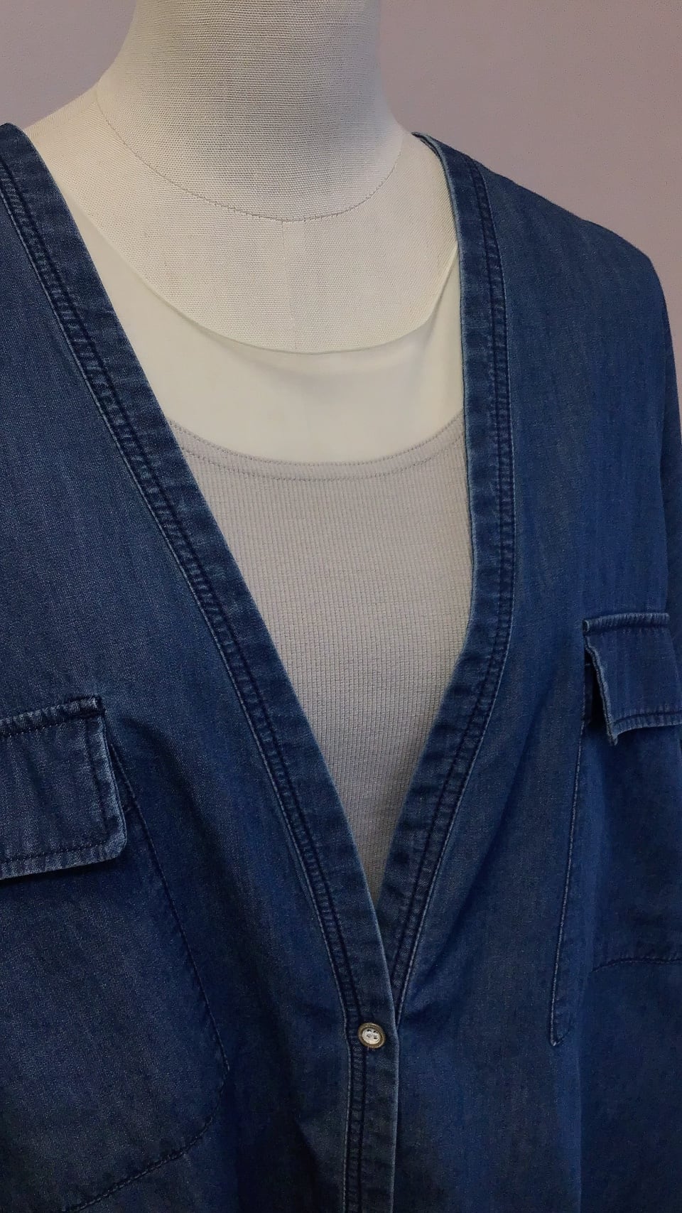 薄手のデニム生地で、袖の長さも冷房対策にちょうどいいと思います。身幅も腰回りもゆったりしていてお尻がすっぽり隠れますが、襟元はスッとした印象です。