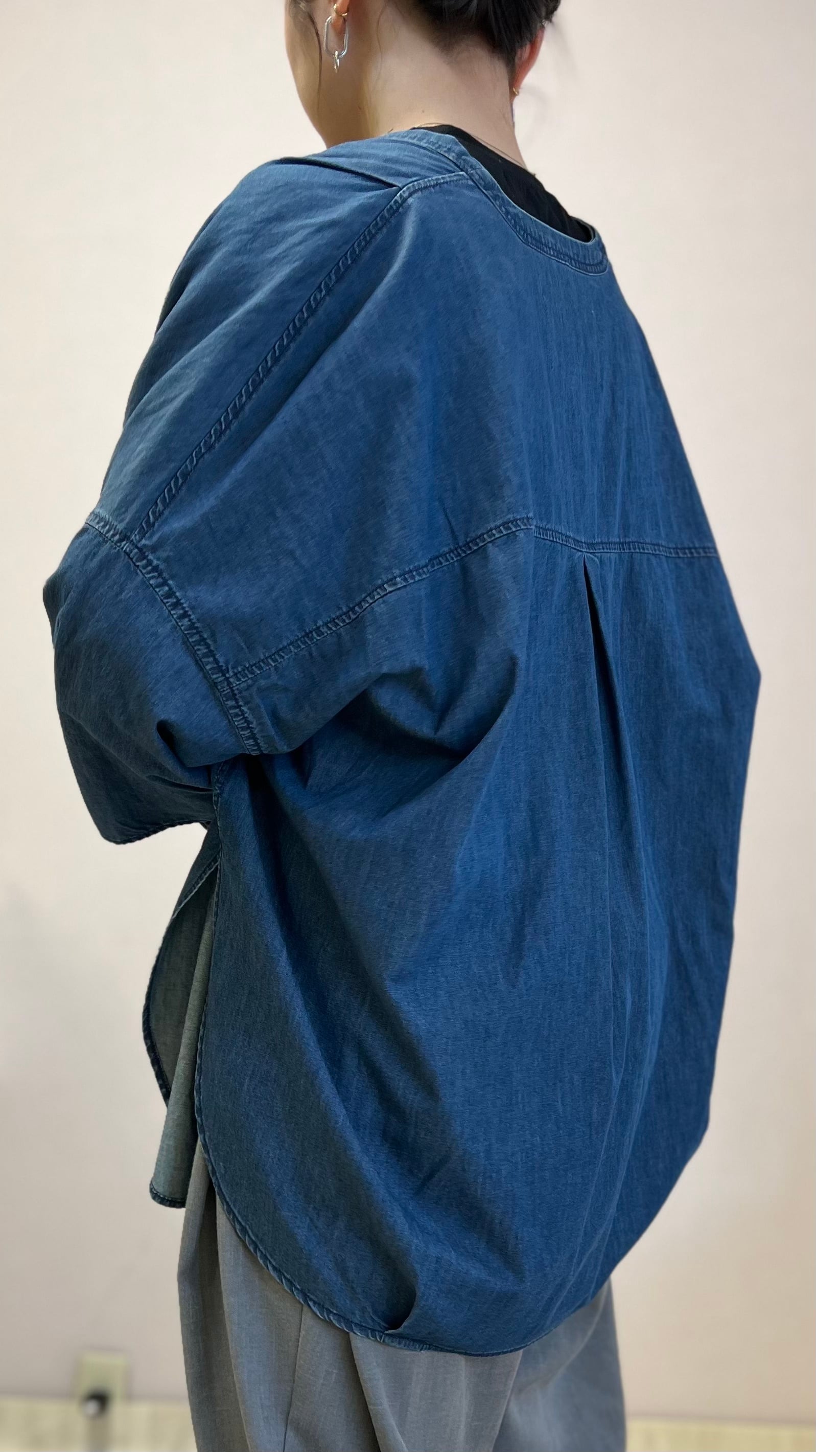羽織として万能な袖短めの薄手のデニムシャツ。Vネックで首元スッキリ、袖口は絞りがなく綺麗めな印象ですが、後ろの丈が長くコクーンシルエットになっています。