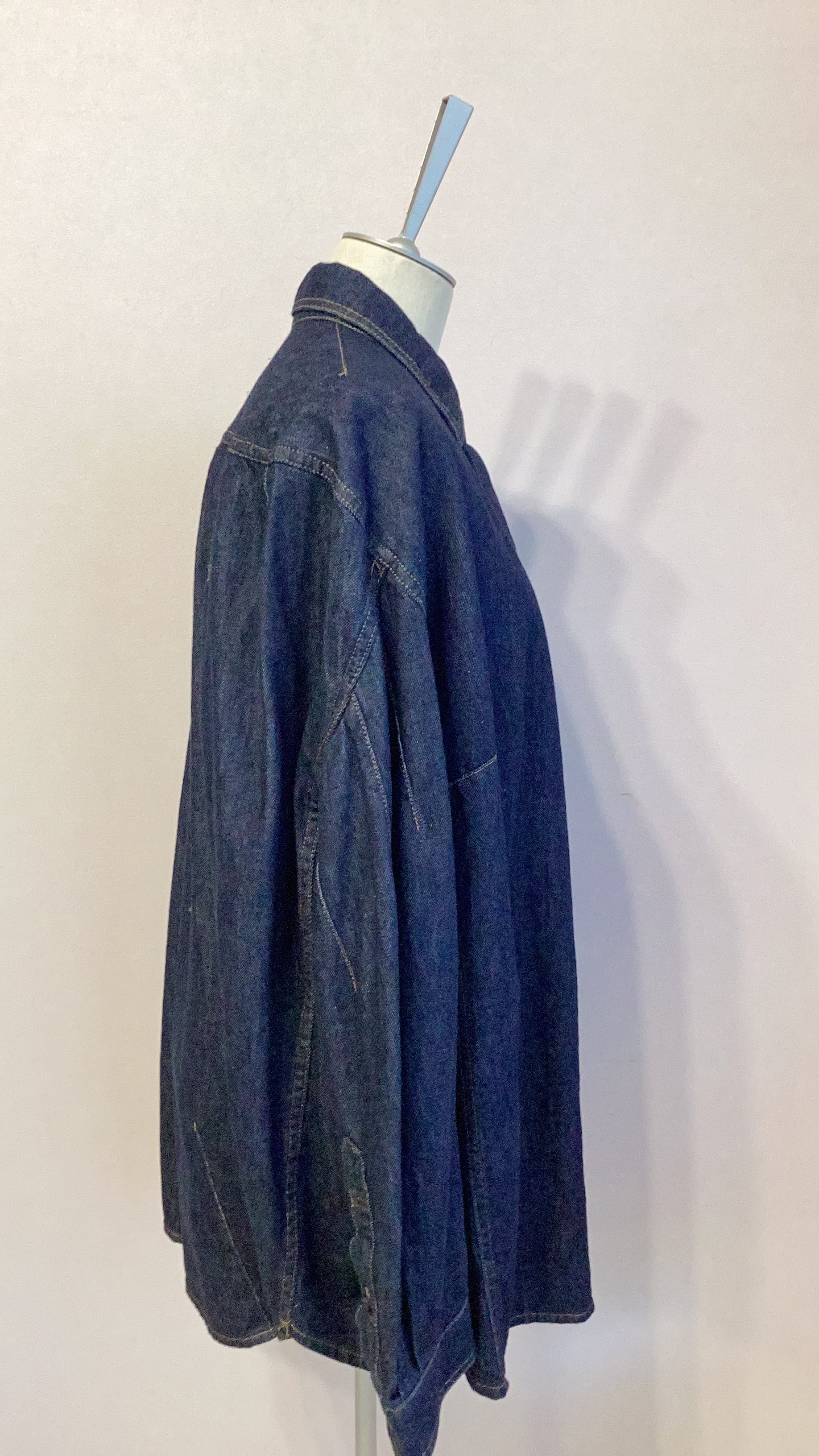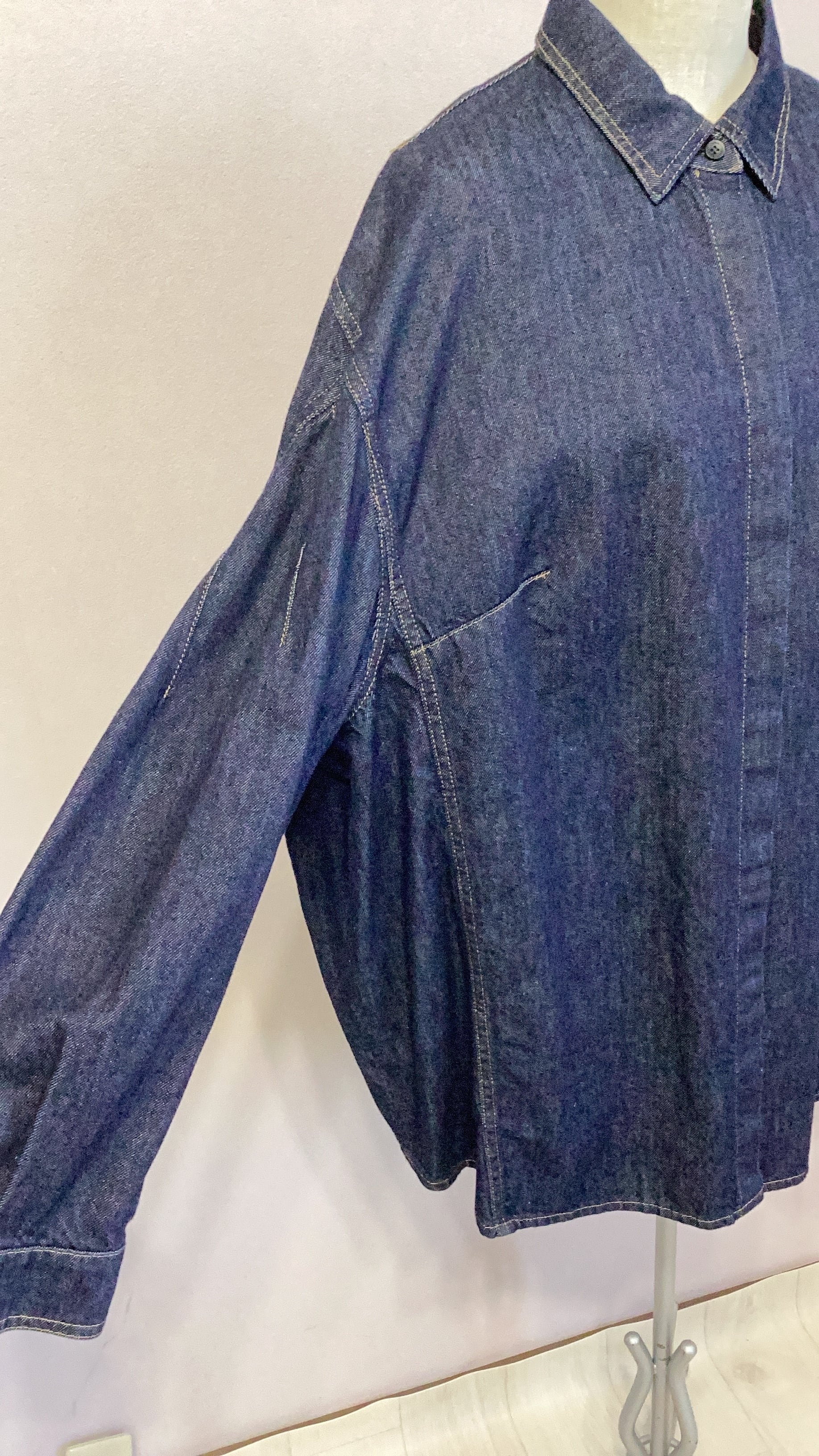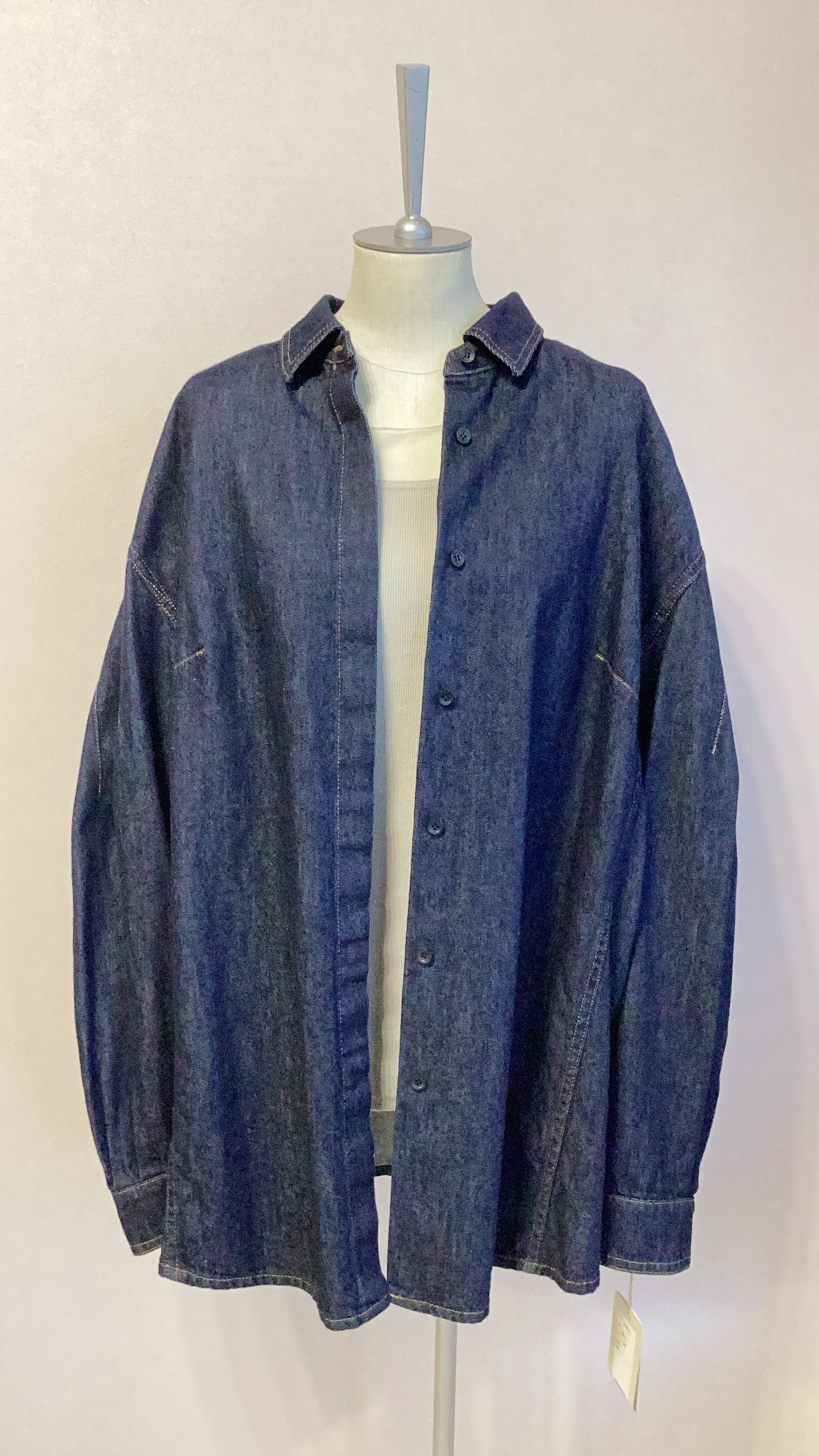ゆったりシルエットのデニムシャツ。やや厚手で羽織りとしても活躍します。