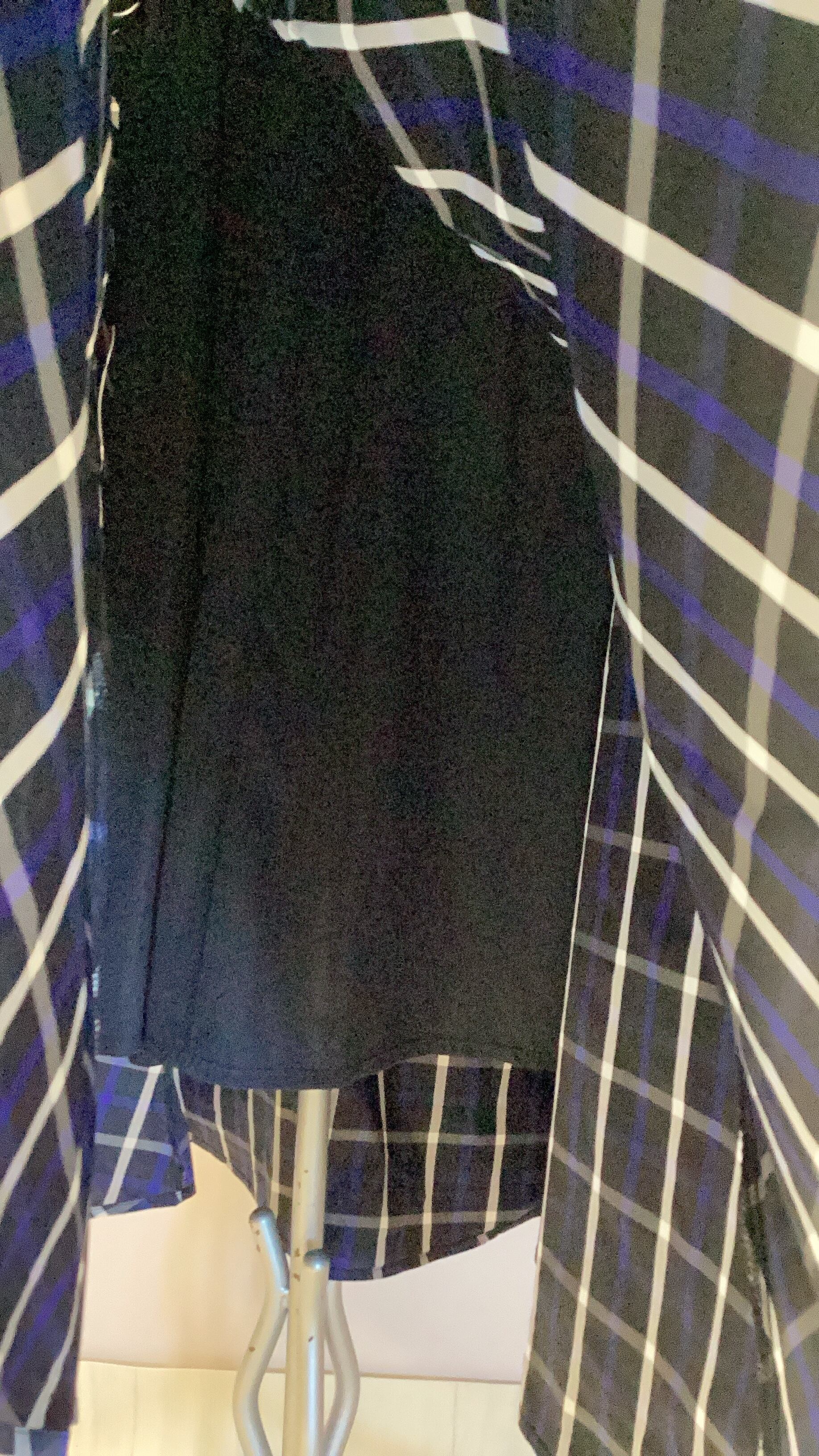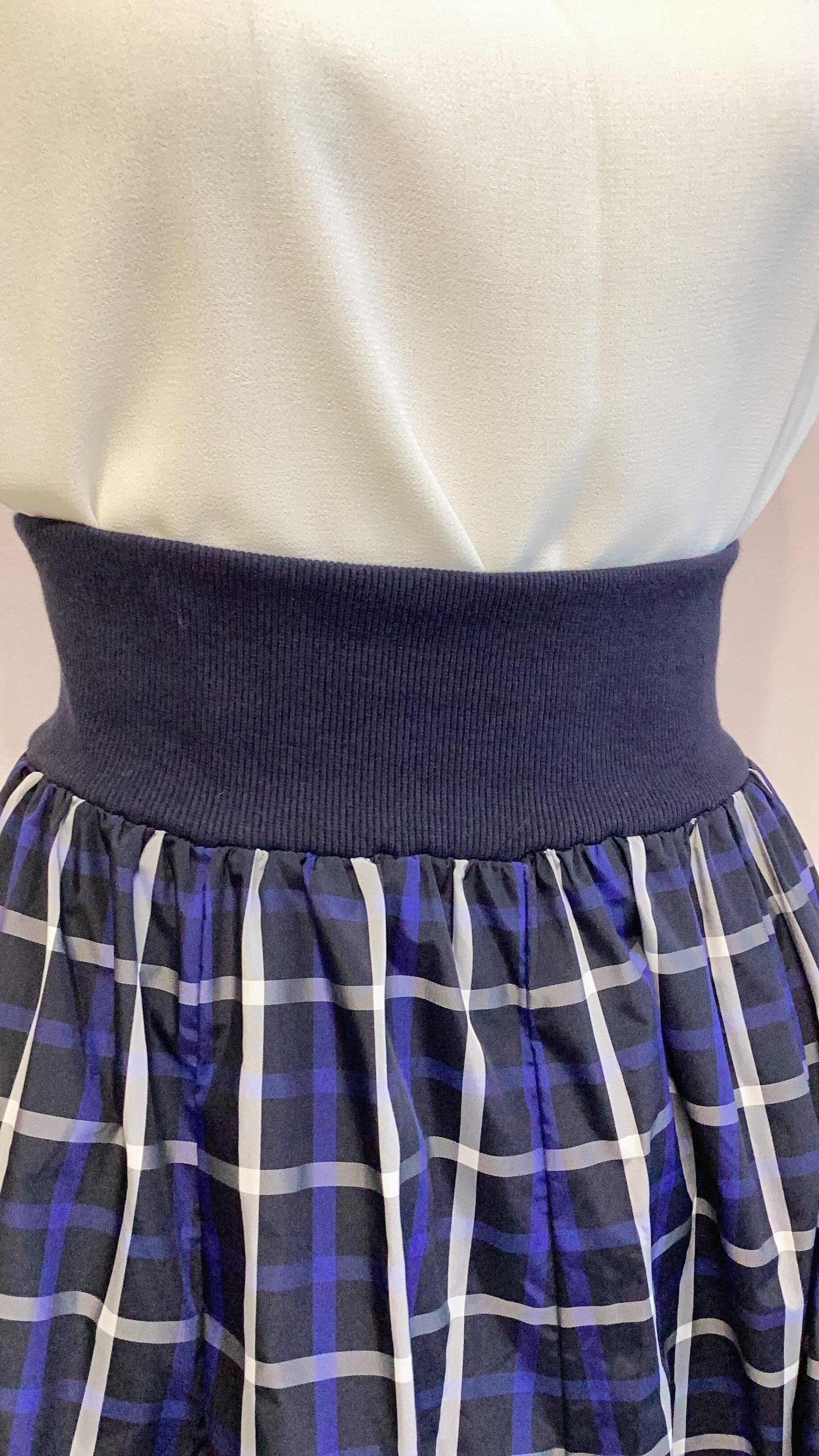 ツルツルとしたチェック生地をたっぷりと使ったフレアシルエットのロングスカート。ウエストリブになっています。裏地あり。