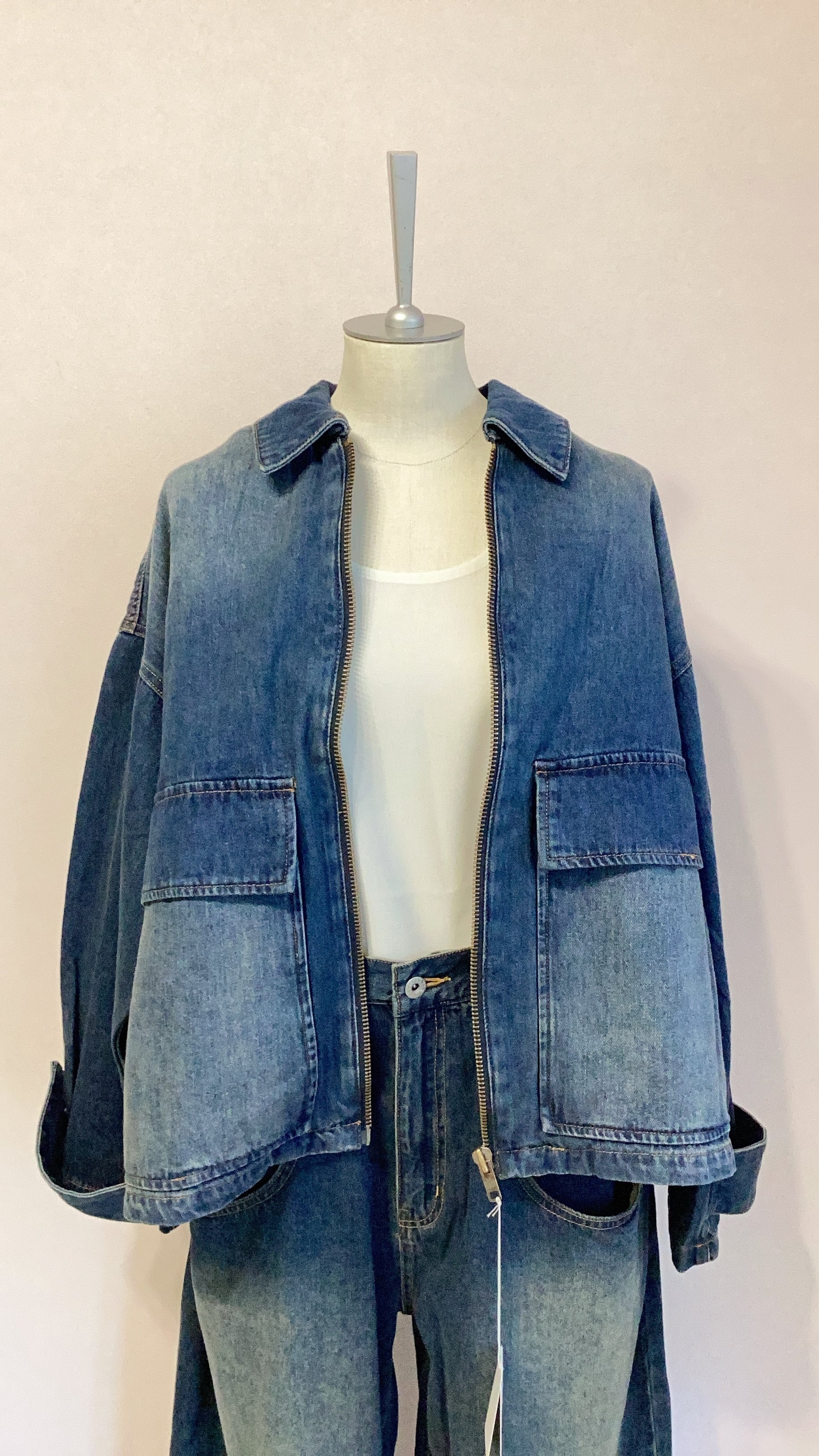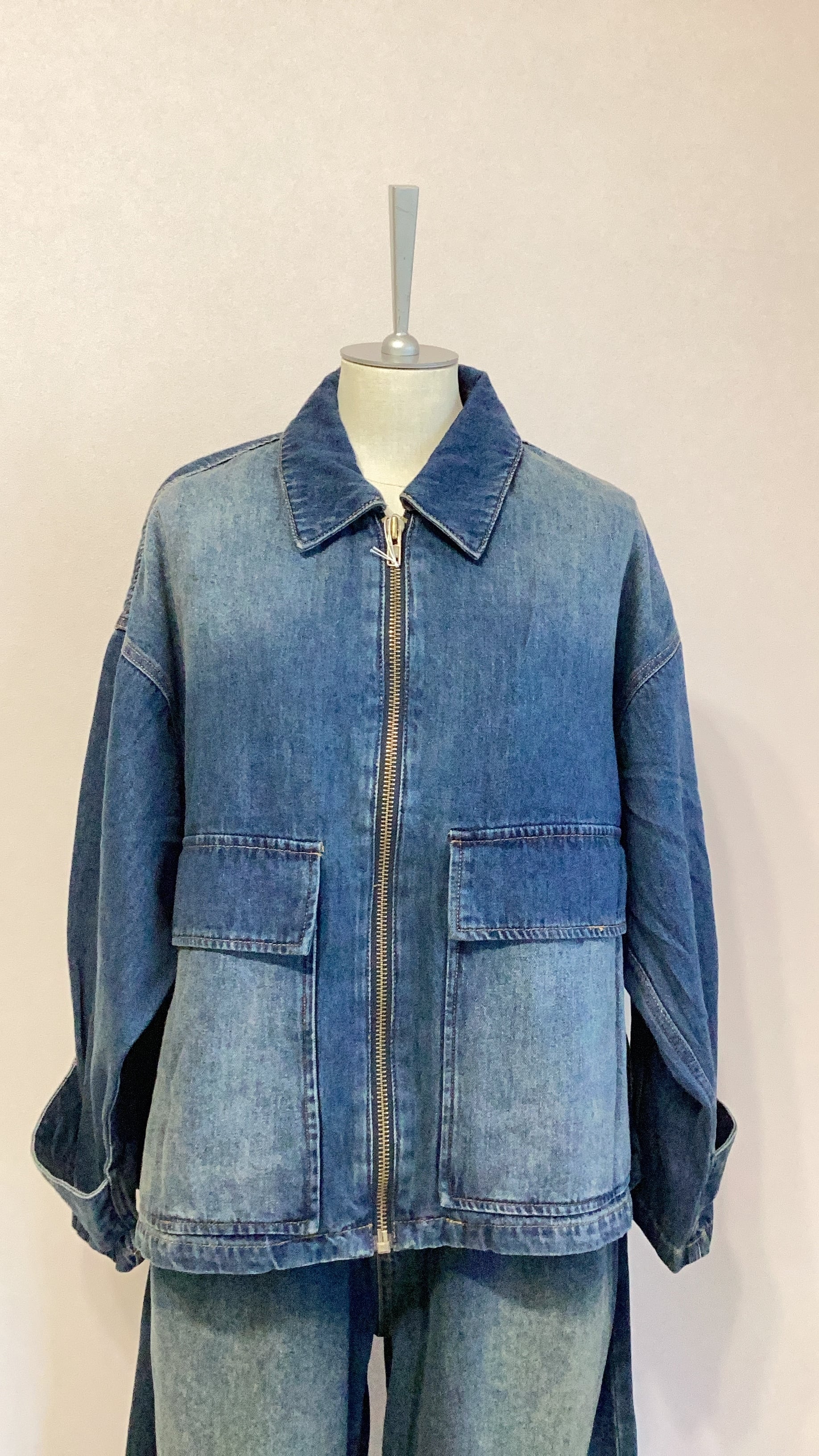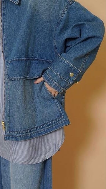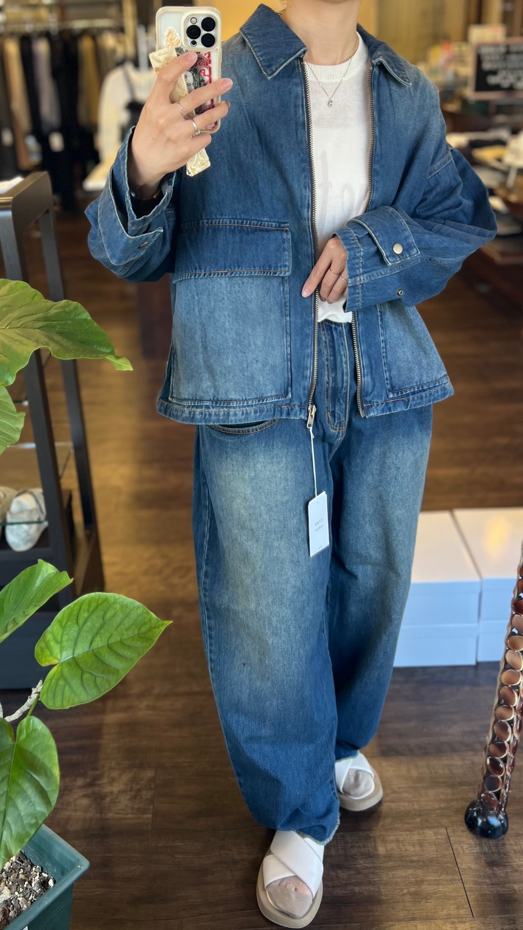 大きなポケットが特徴的なデニムジャケット。袖は2段階で調整可能です。ワイドパンツとセットアップ可能。