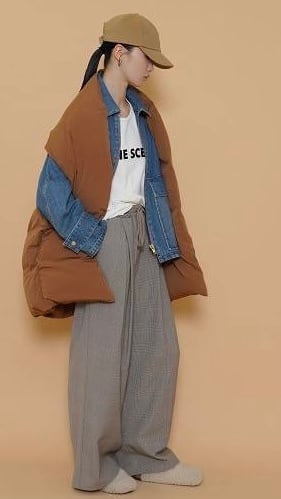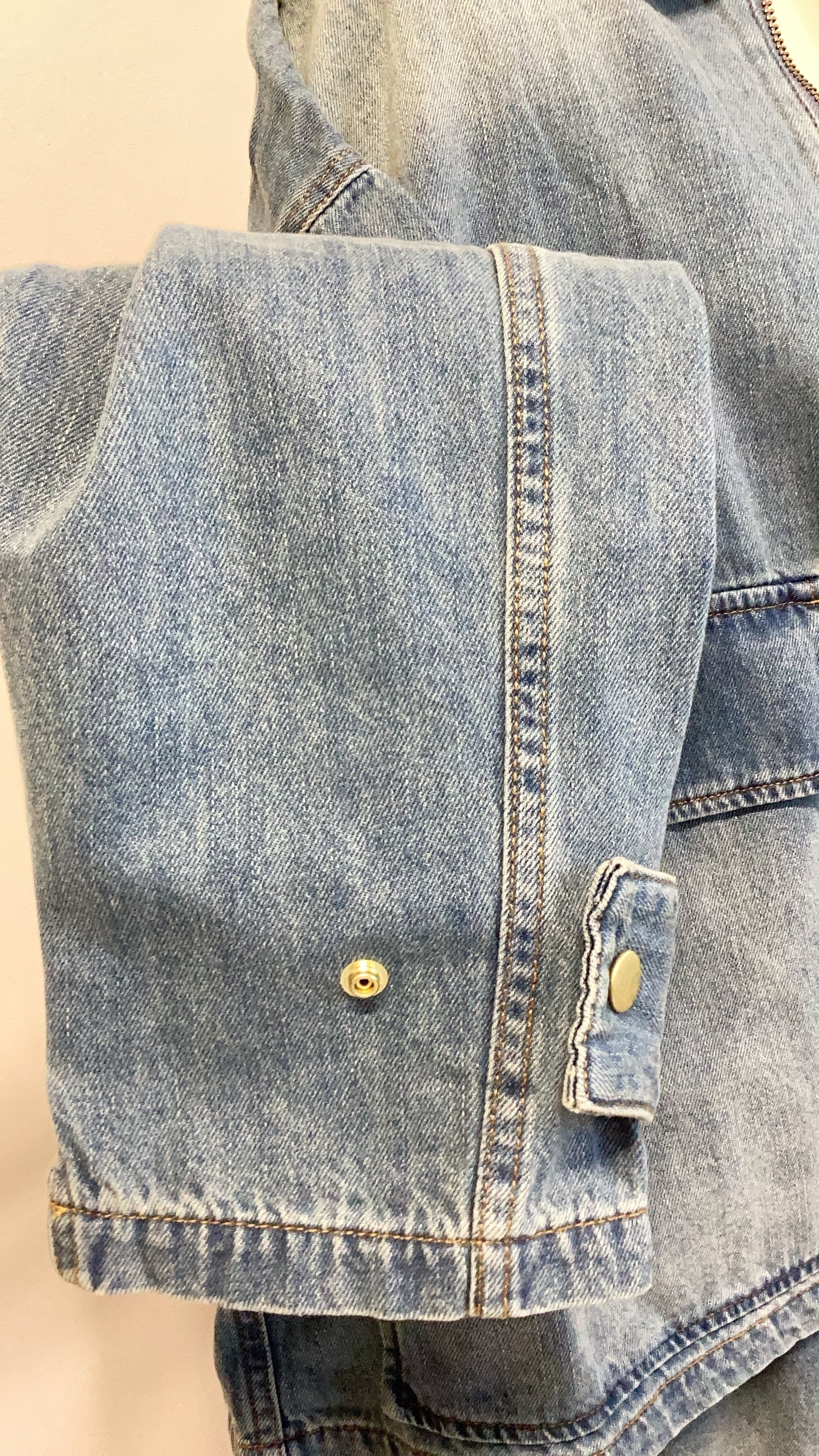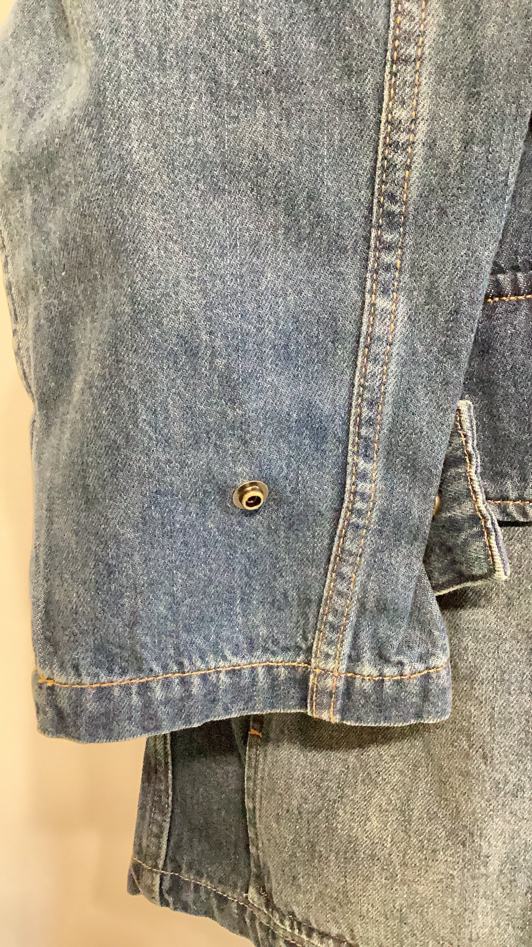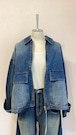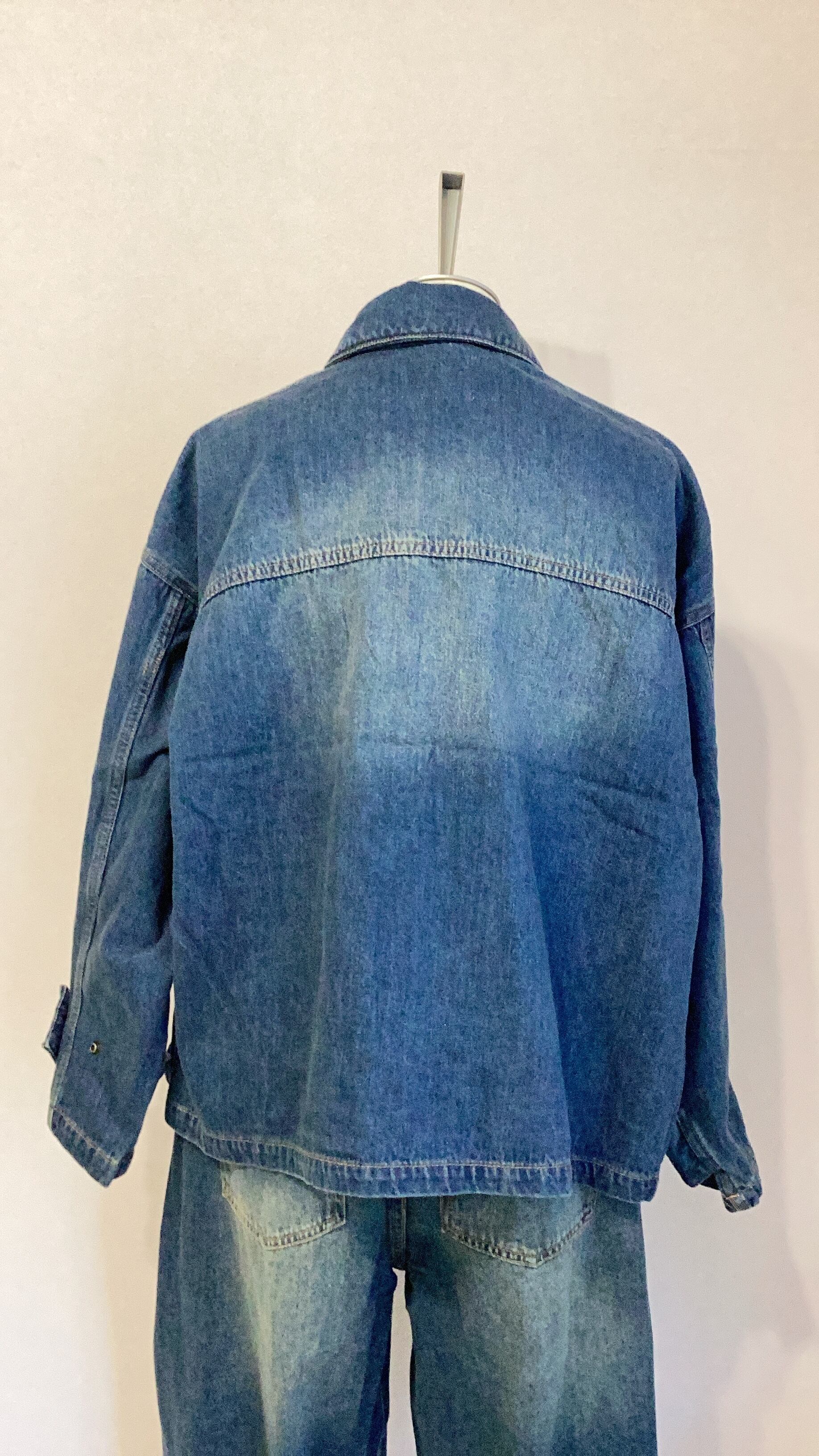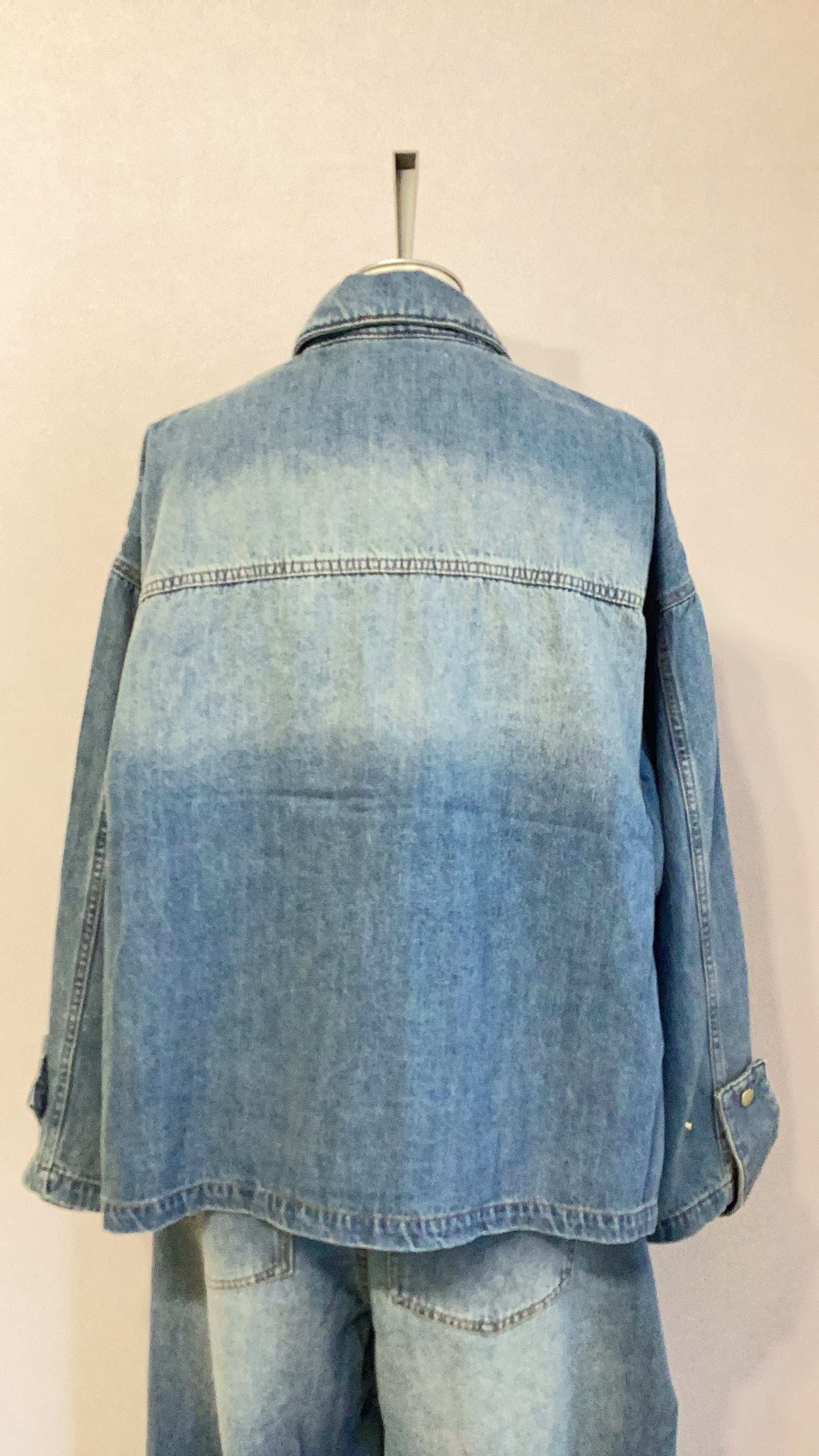 大きなポケットが特徴的なデニムジャケット。袖は2段階で調整可能です。ワイドパンツとセットアップ可能。