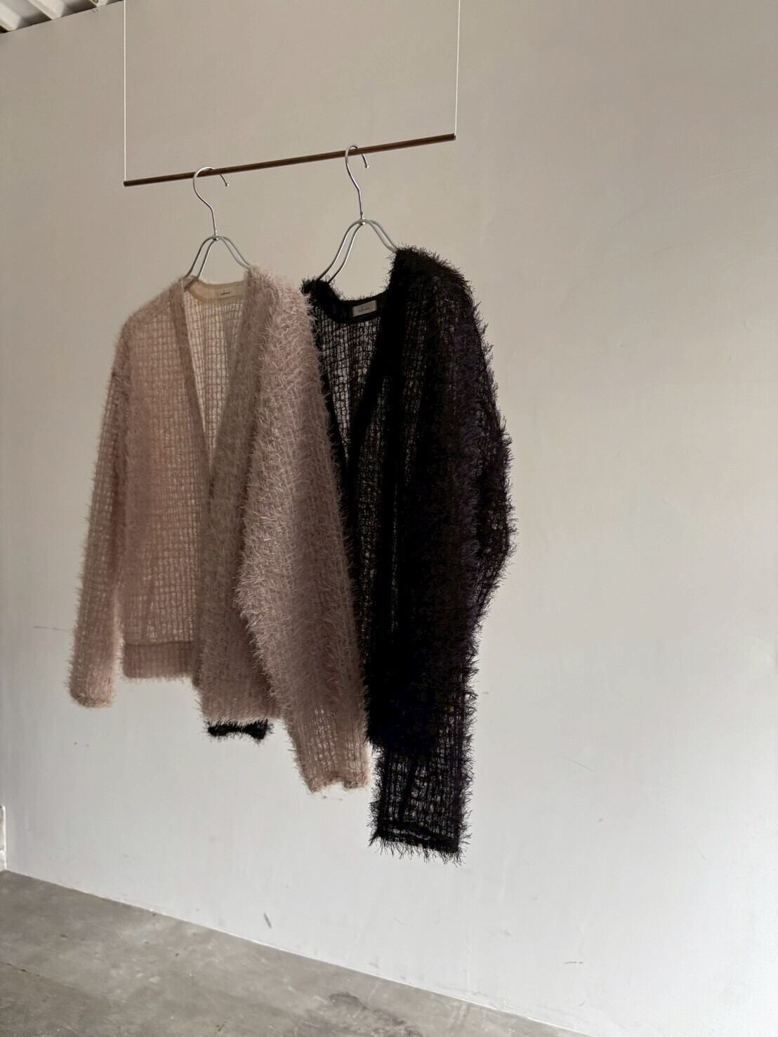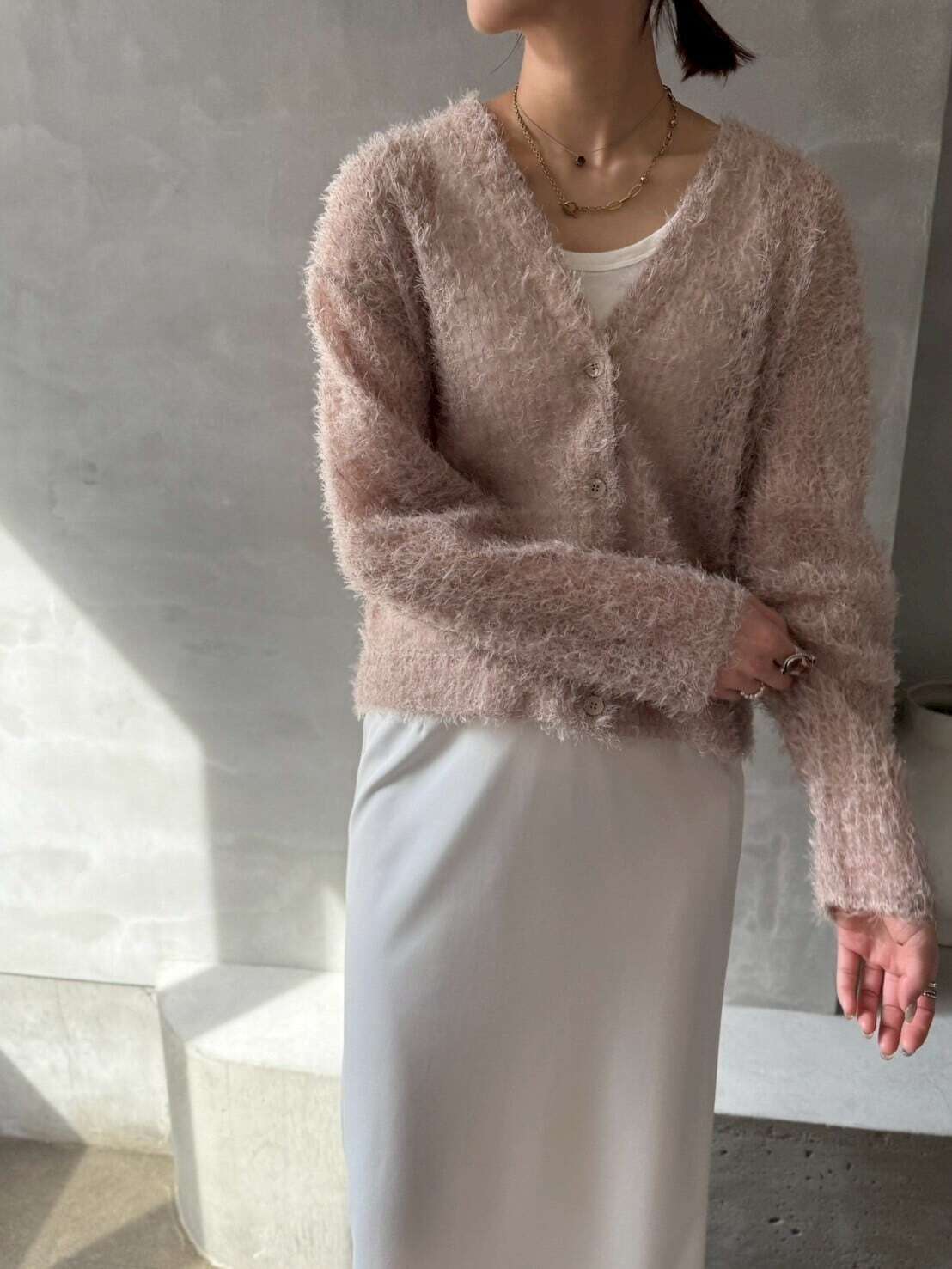 エアリーなチュールにふわっとフェザーを編み込みんだカーディガン。肌馴染みの良いピンクベージュで、軽やかで程よいシアー感が夏から秋にぴったり。すっきりしたVネックに絶妙な着丈。羽織るだけで今っぽい抜け感が手に入ります。