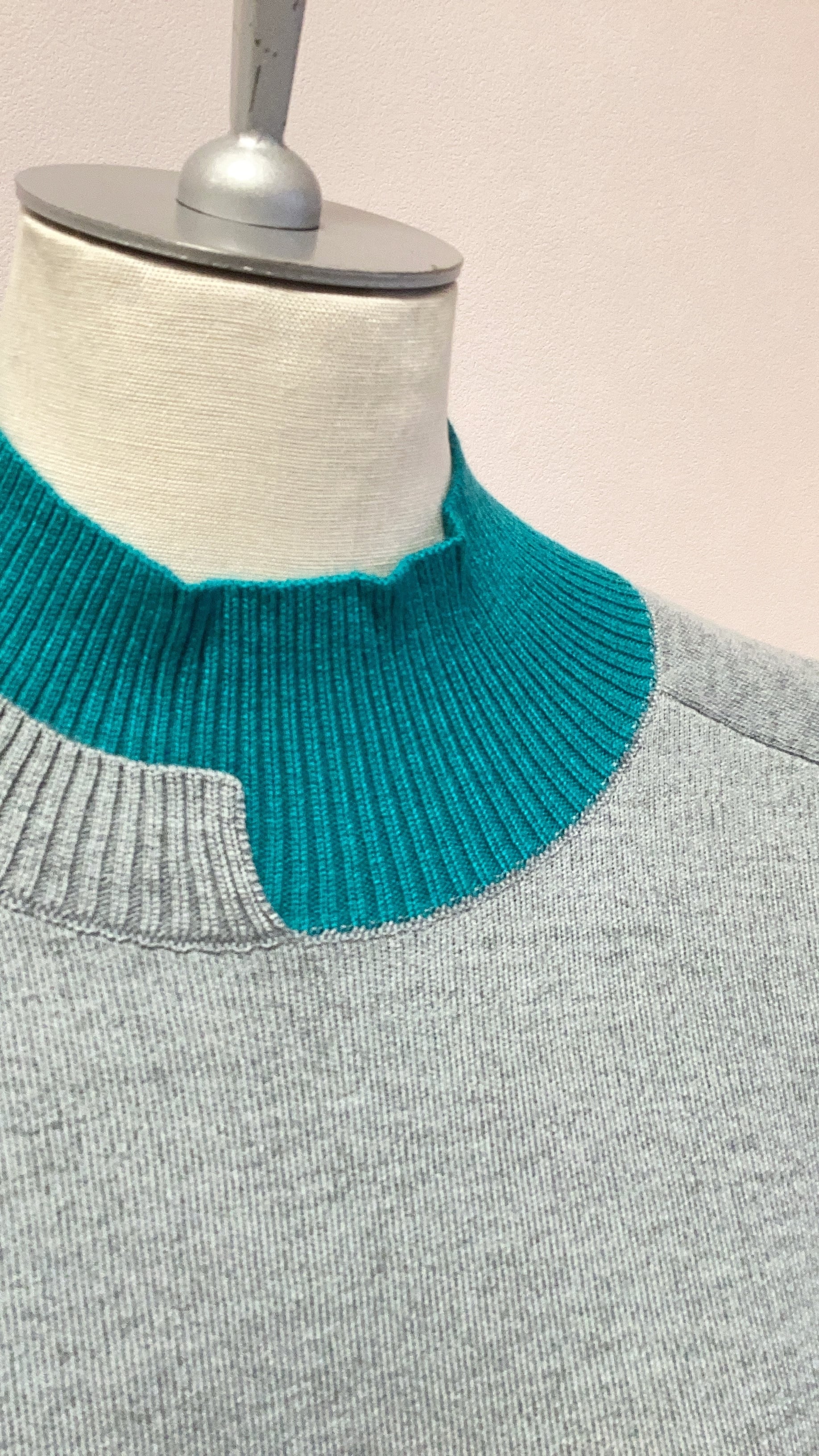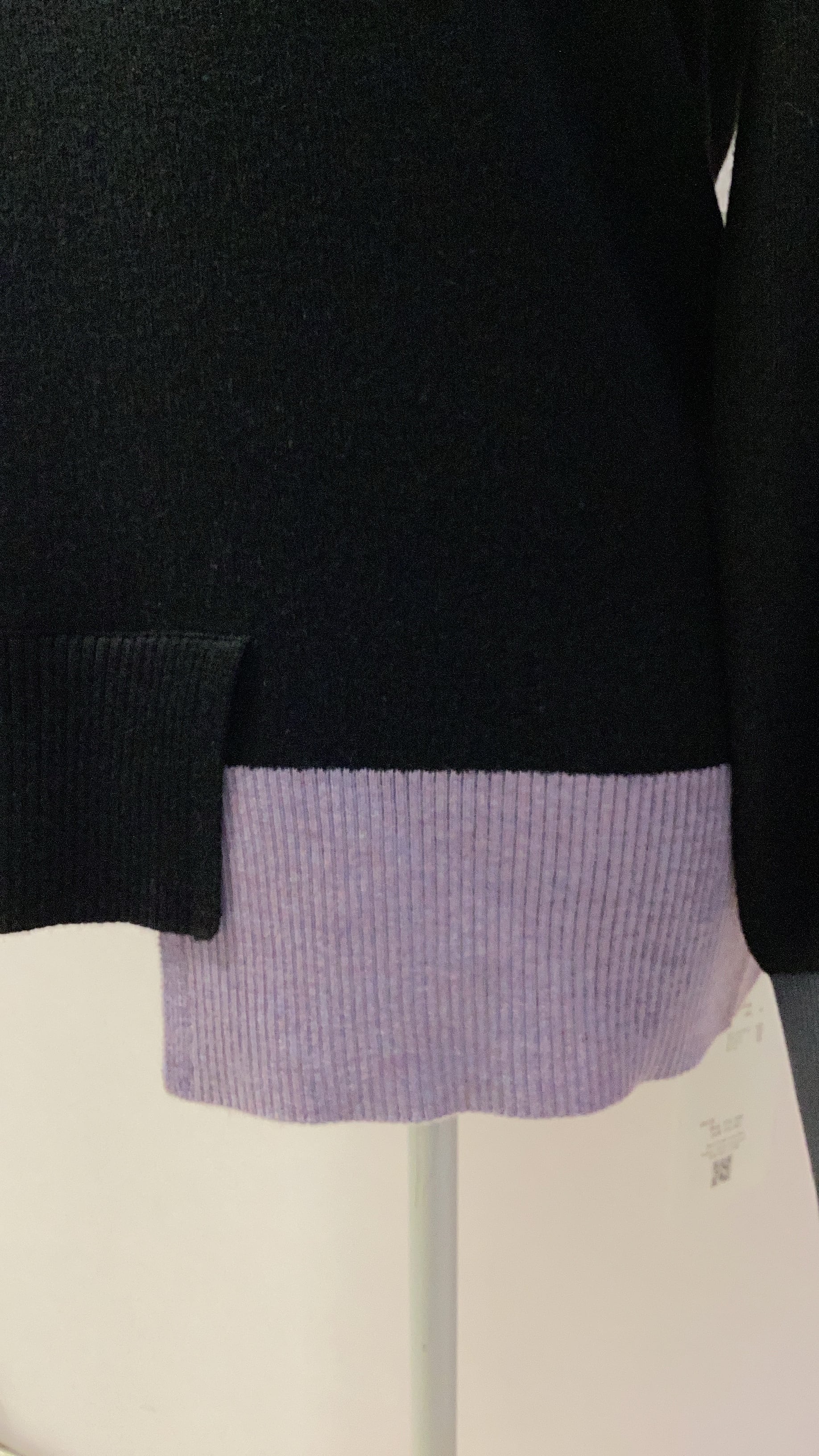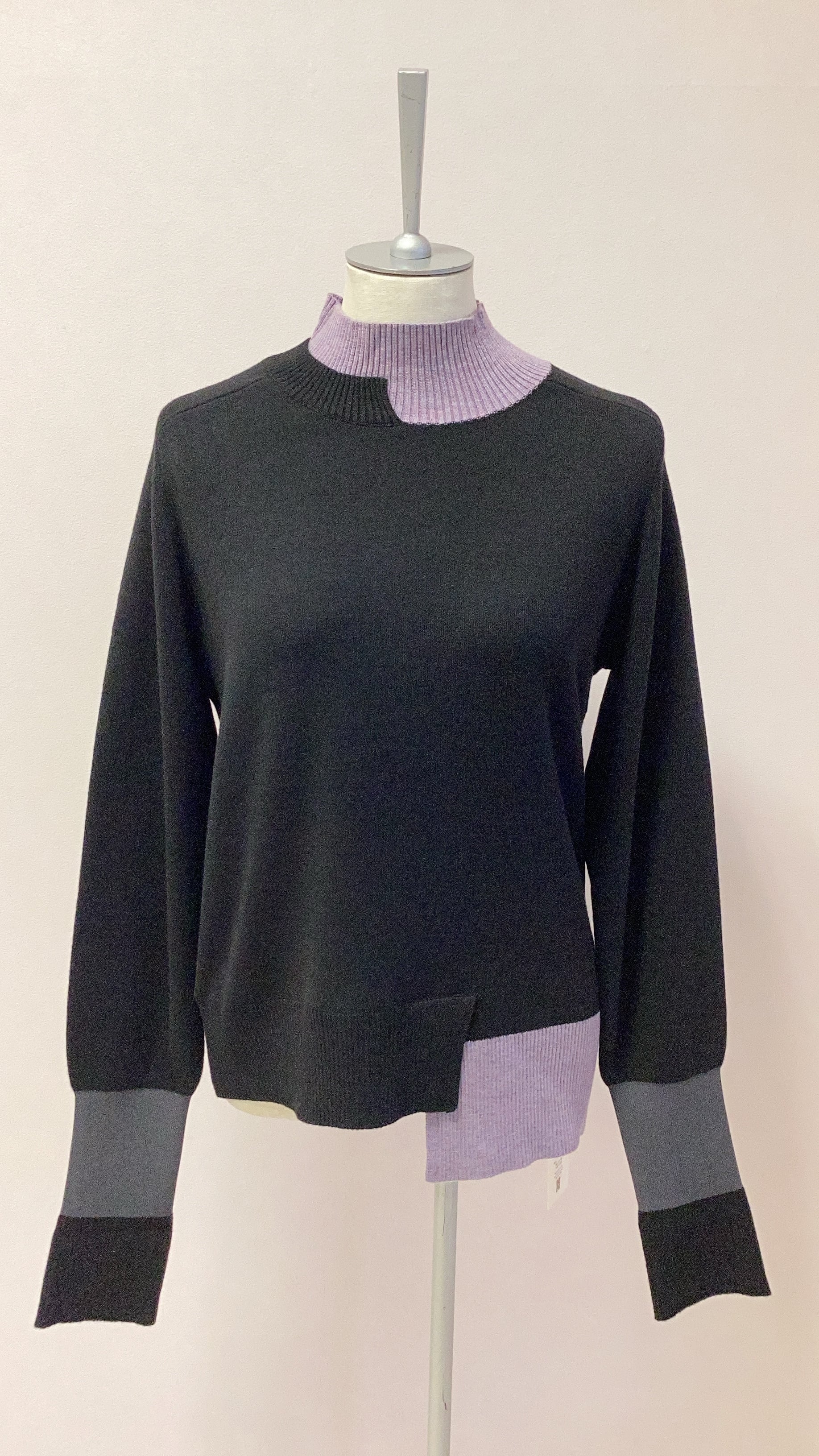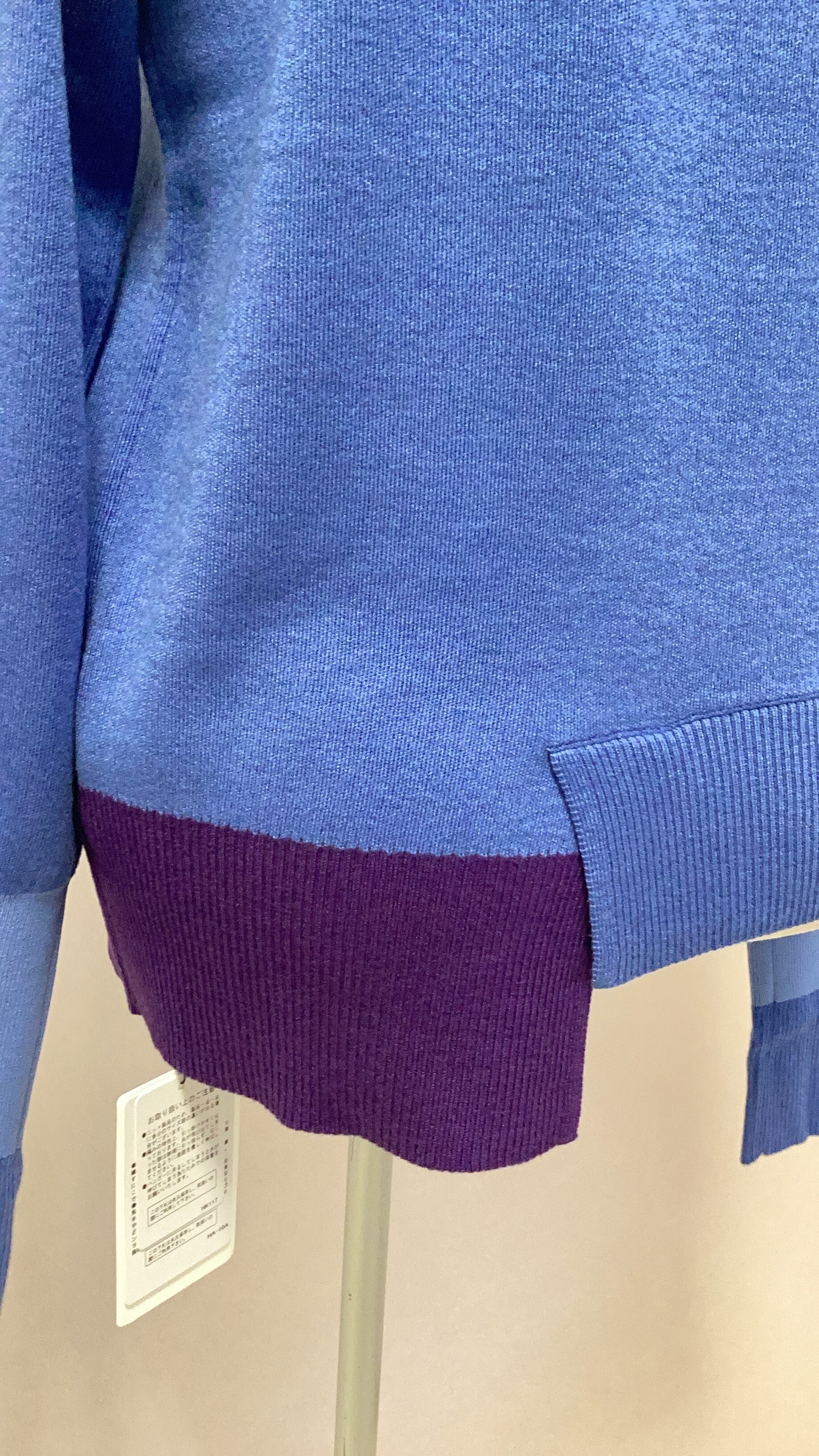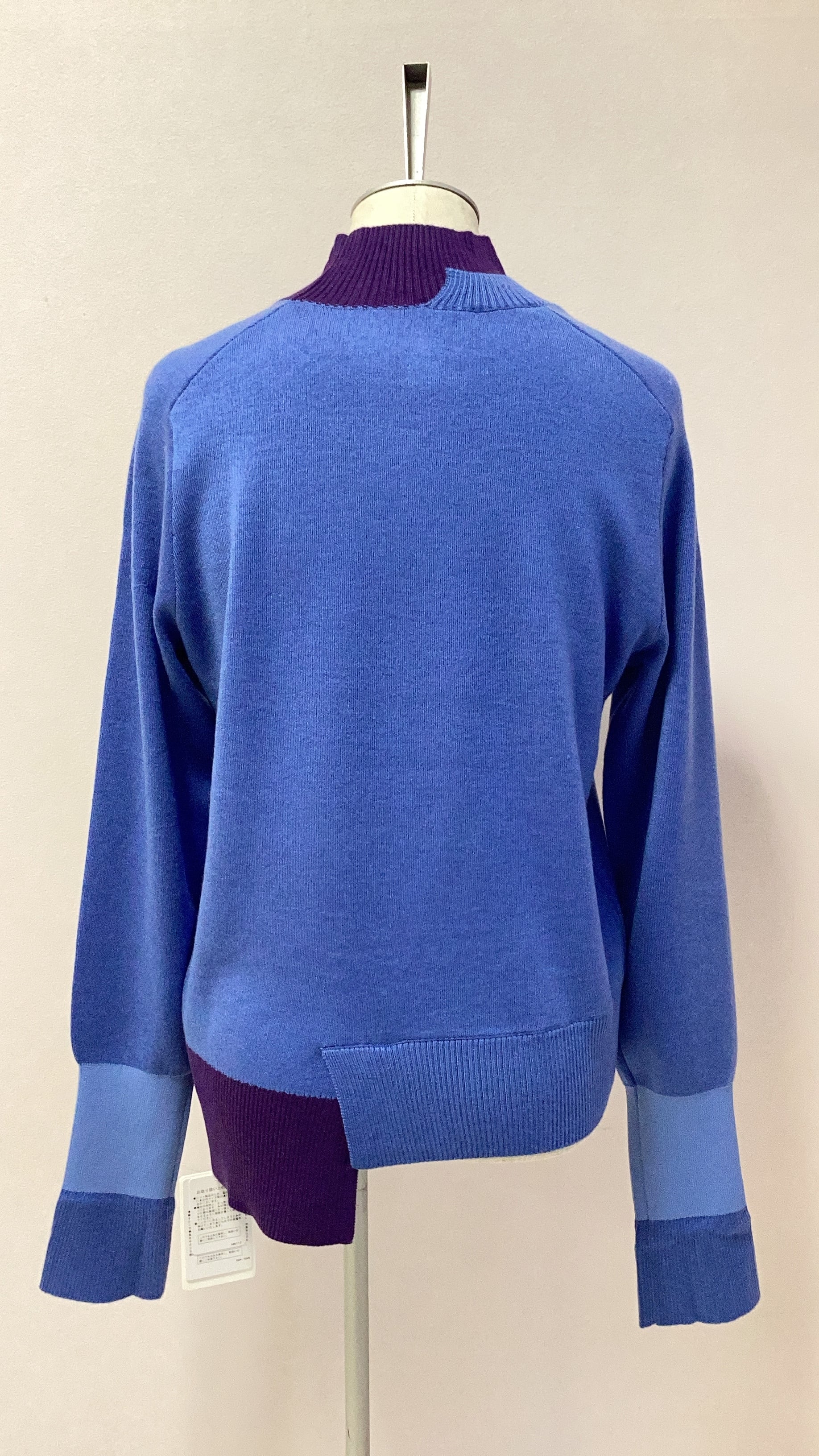 バイカラーが目を惹く、アシンメトリーデザインのハイネックニット。袖を折り返して着用するのもおすすめ。毛羽立ちにくく、毛玉が出にくい糸を使用しています。高密度で織り上げ、自然な光沢と滑らかで柔らかい着心地を実現した一枚。