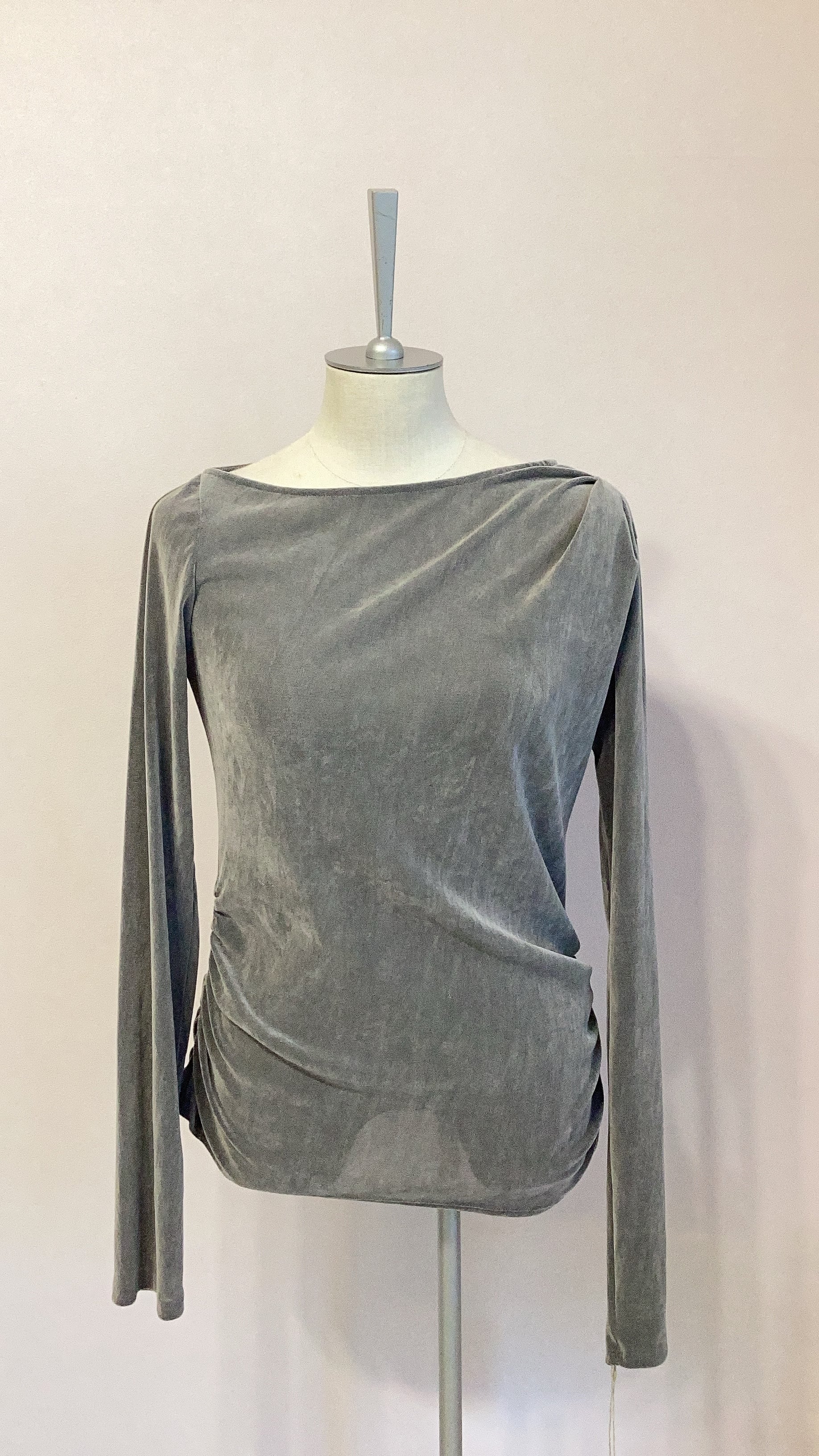秋冬らしいフロッキー生地を使用した光沢のあるカットソー。アシンメトリーな肩のデザインがポイントです。一枚でも、インナーとしても活躍します。