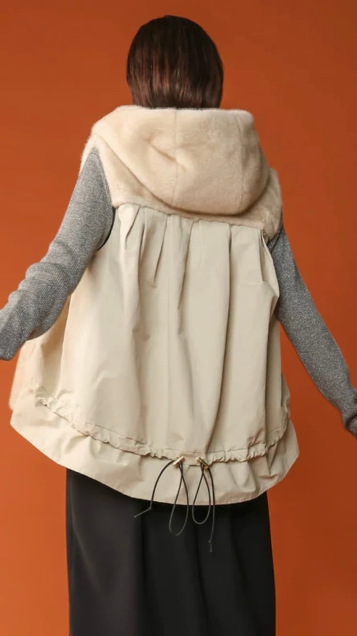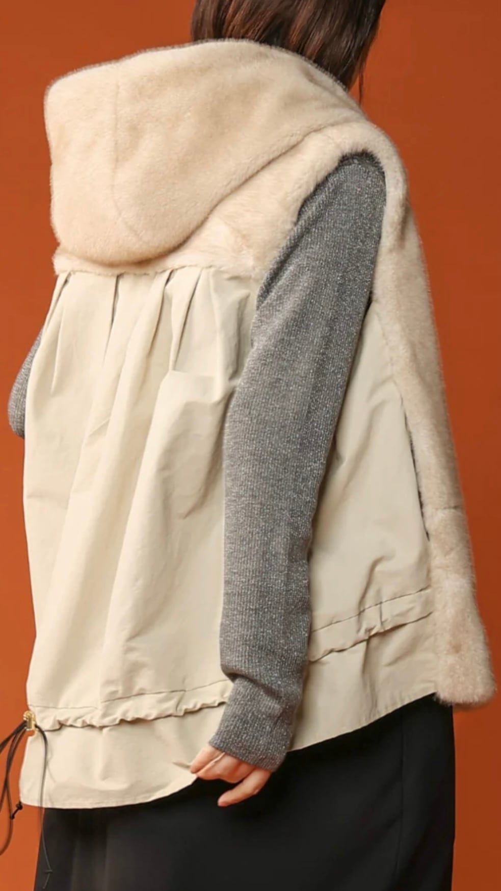 毛足の長い、肌触りの優しいファーを使用したファーベスト。弊社人気の定番アイテムです。顔周りを包み込むフードがデザインアクセントになり、着こなしにこなれ感をプラスします。やや後ろ下がりのシルエットでヒップをさりげなくカバーしつつ、バランス良く着こなせる一枚。