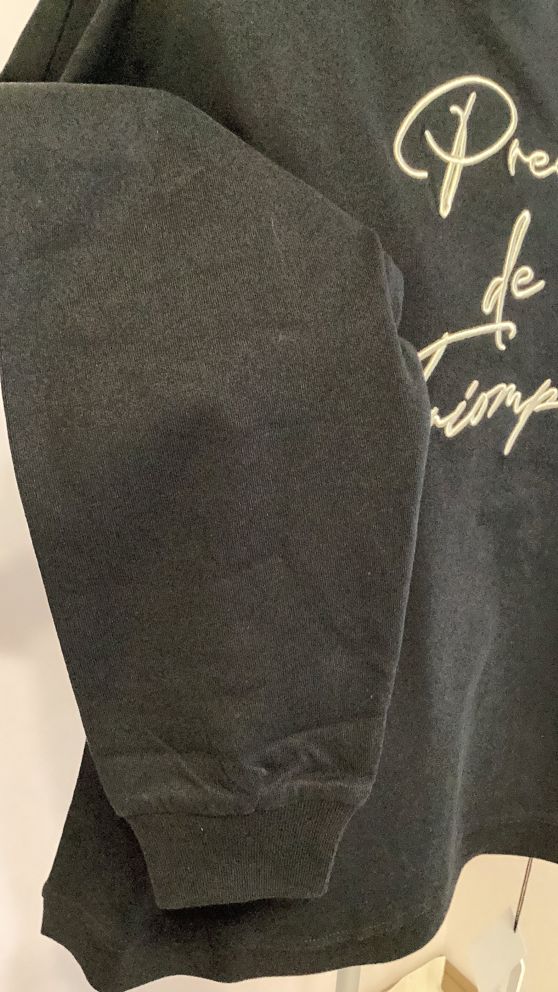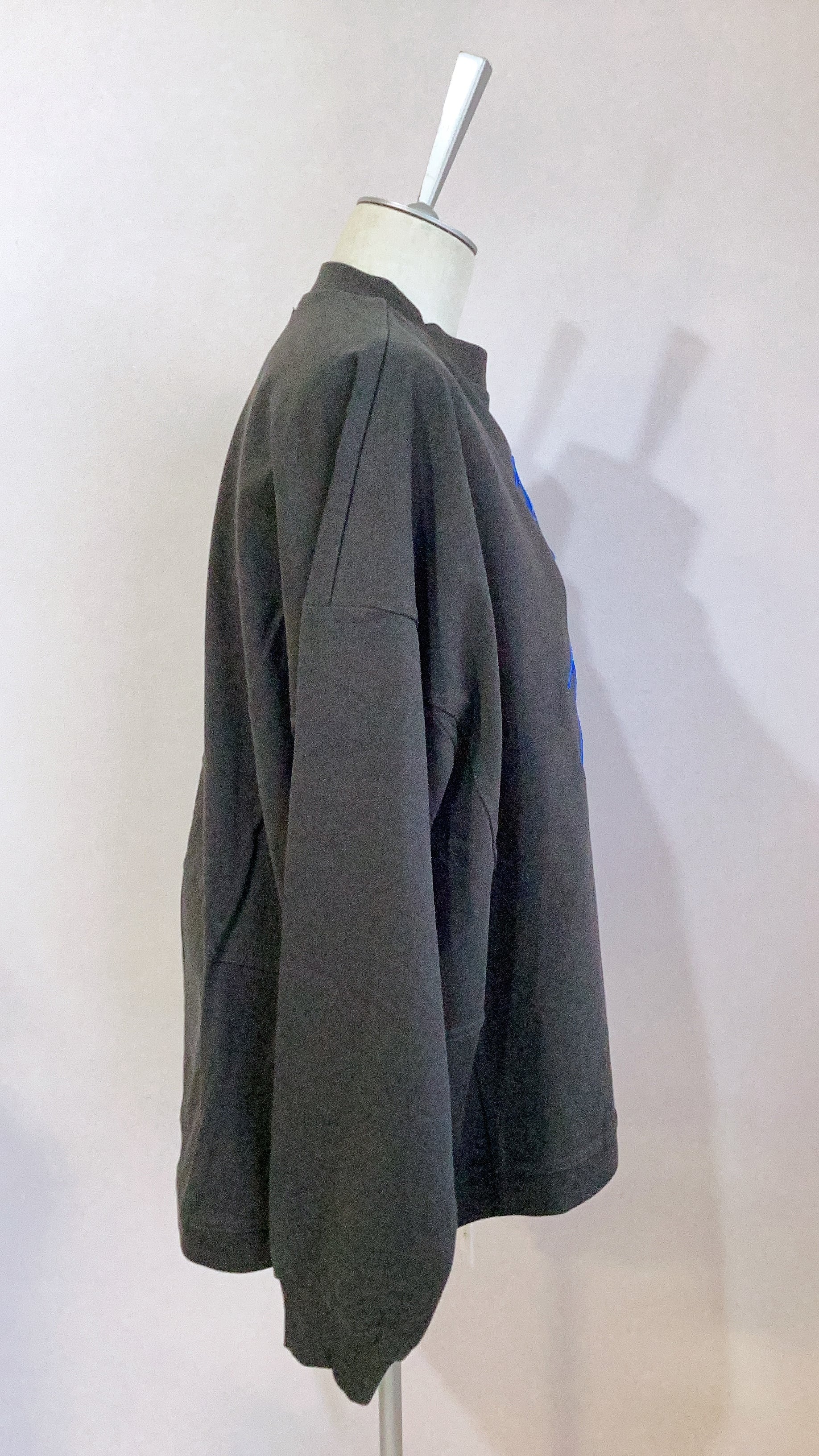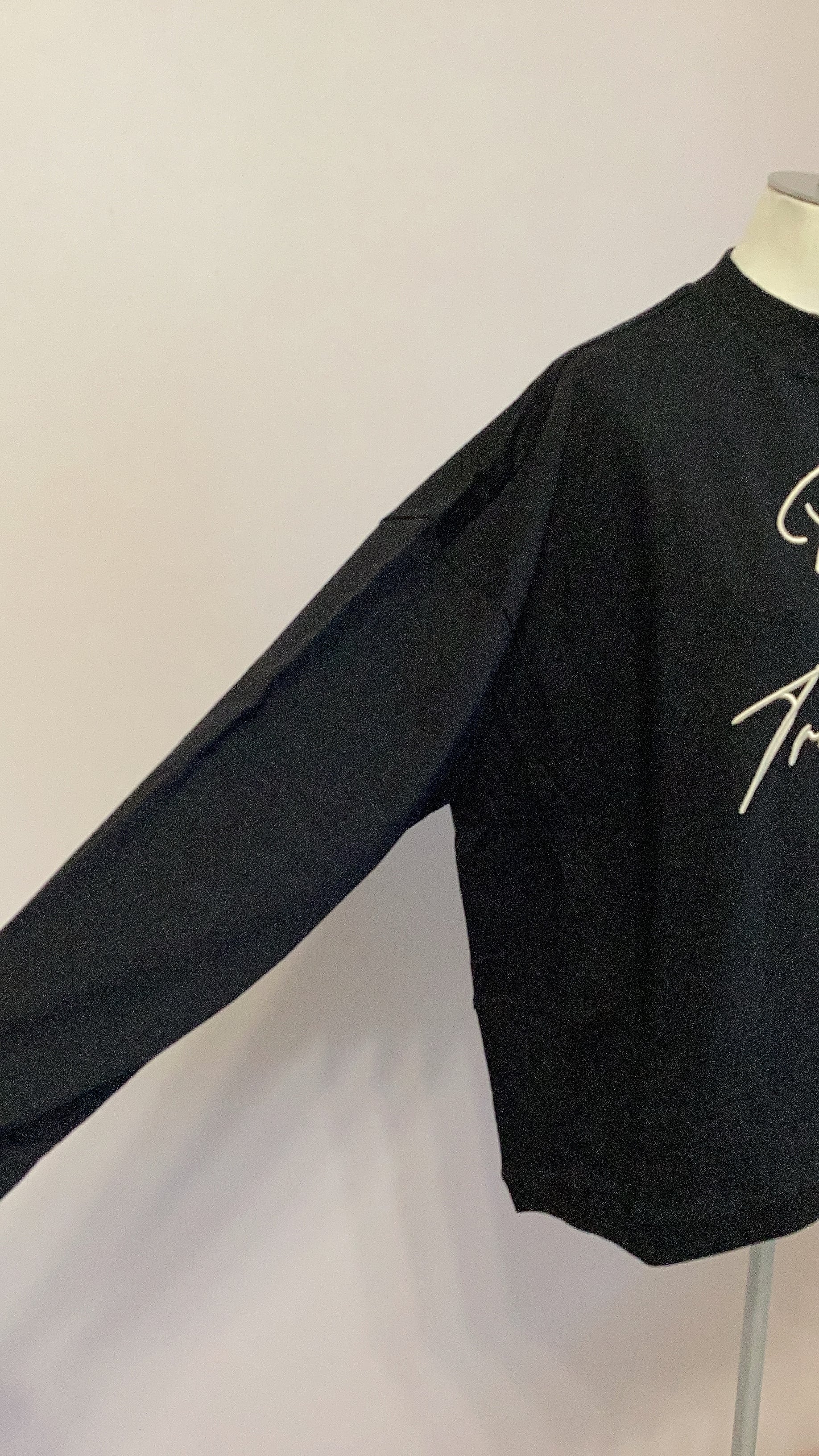 売れ筋の立体刺繍の秋冬バージョンのロングTシャツ。ゆったりとした切替デザイン。1枚でも、アウターを羽織ってもちょうど良い生地感です。