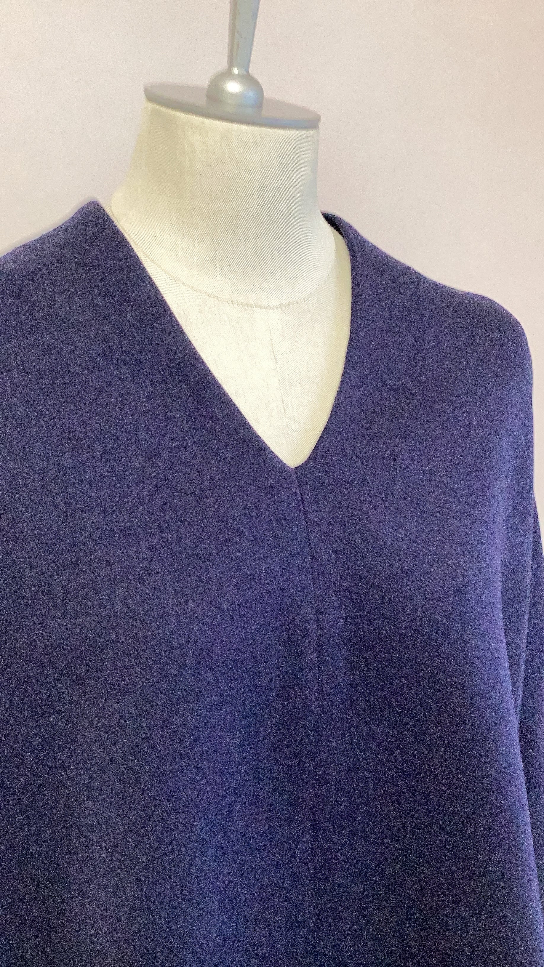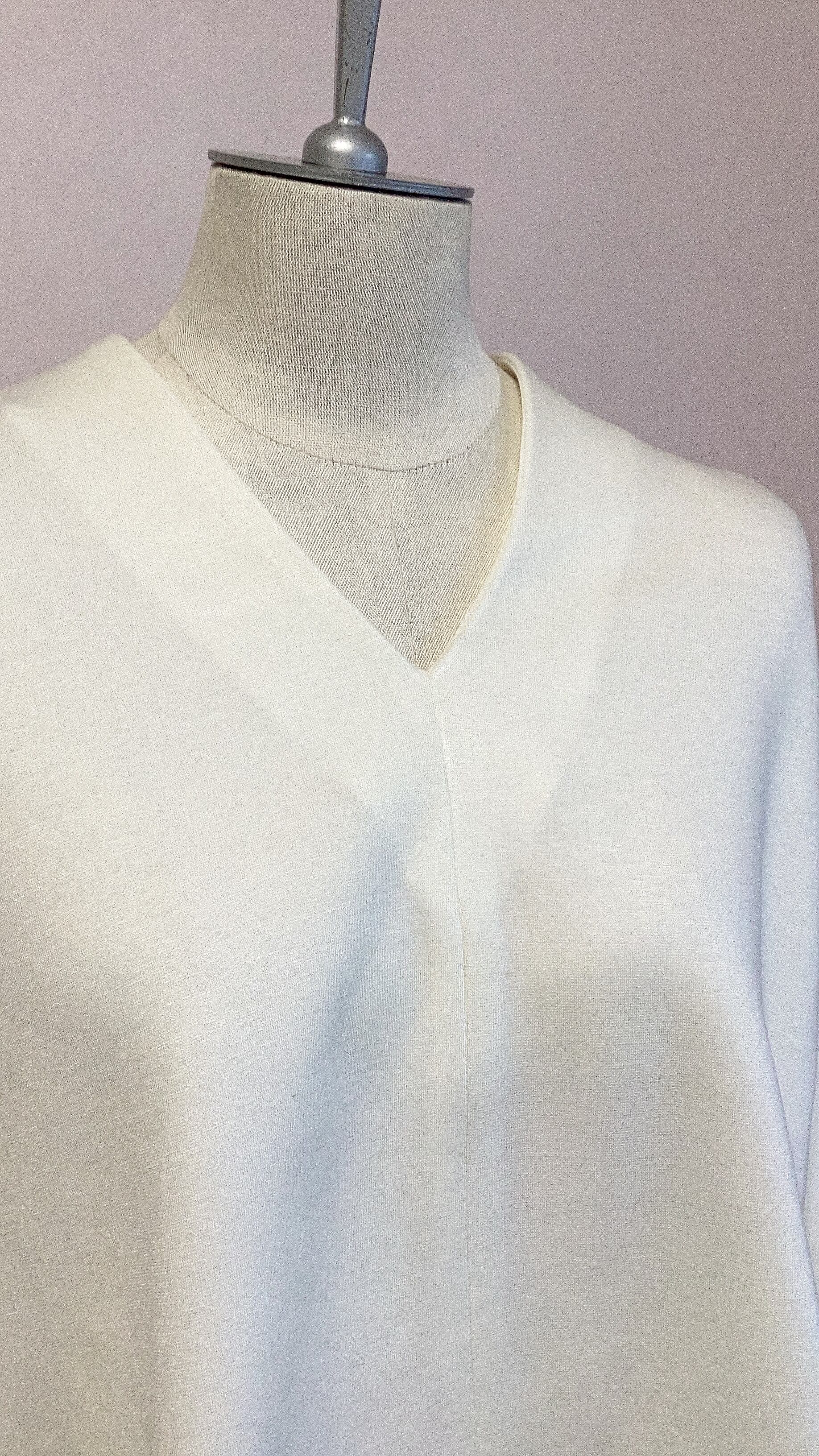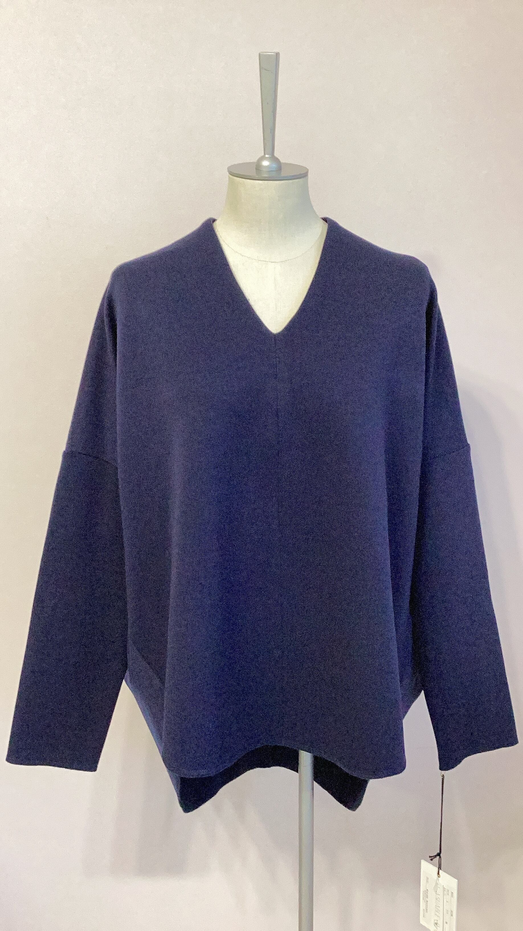 身体のラインを拾わない、程よくワイドなプルオーバー。ふくらみのあるウール混の糸を使い、編み上げたポンチ。ストレッチ糸で着心地良く、しっとりとした風合いと品の良い光沢感が特徴。女性らしい深めのVネックで、後ろはやや立体感のあるデザインになっています。