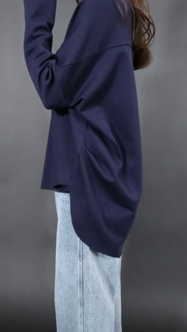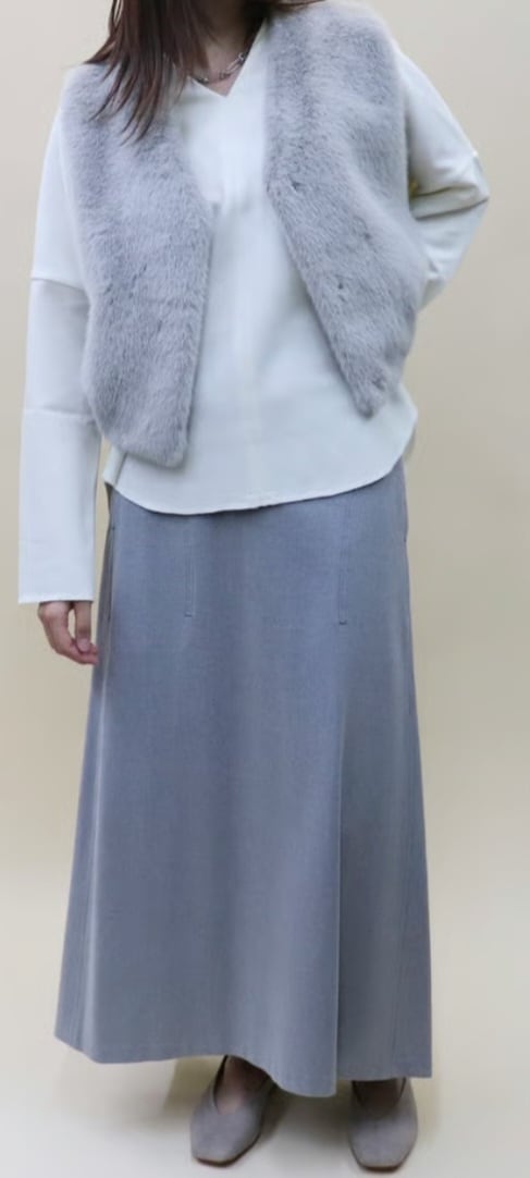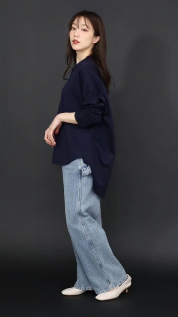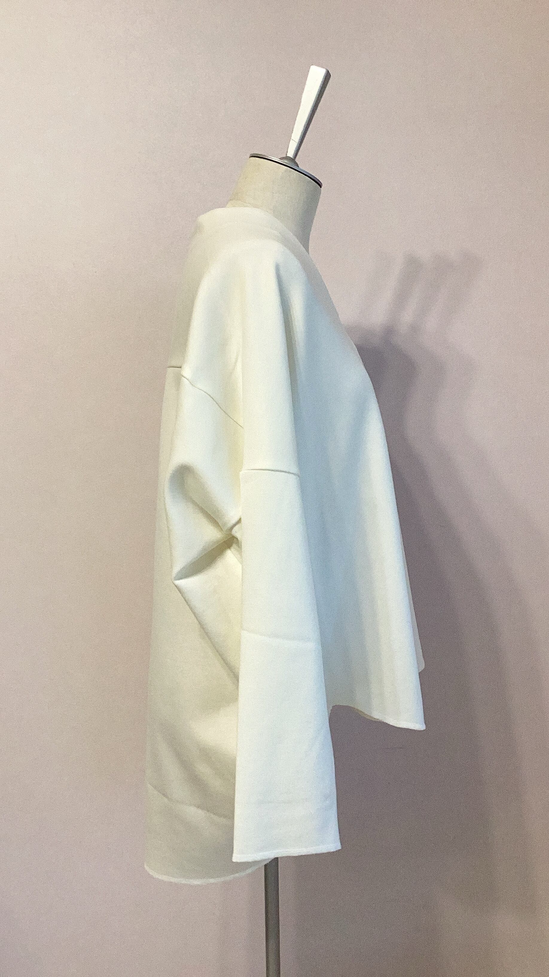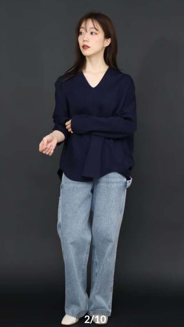 身体のラインを拾わない、程よくワイドなプルオーバー。ふくらみのあるウール混の糸を使い、編み上げたポンチ。ストレッチ糸で着心地良く、しっとりとした風合いと品の良い光沢感が特徴。女性らしい深めのVネックで、後ろはやや立体感のあるデザインになっています。
