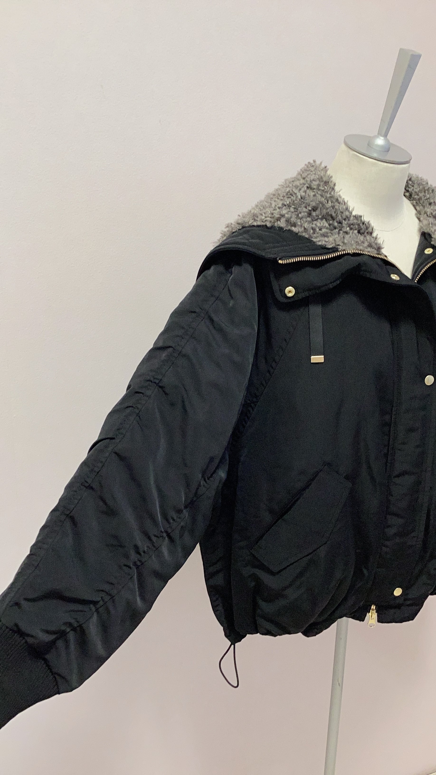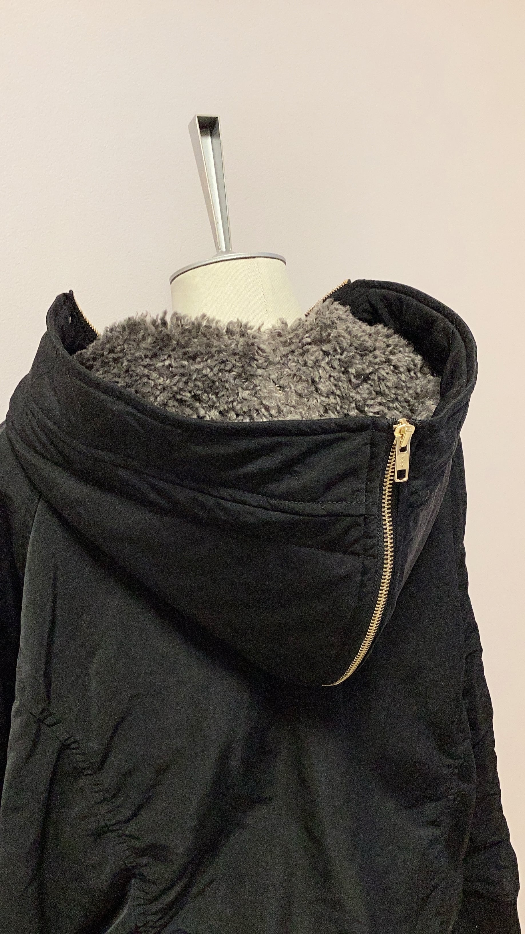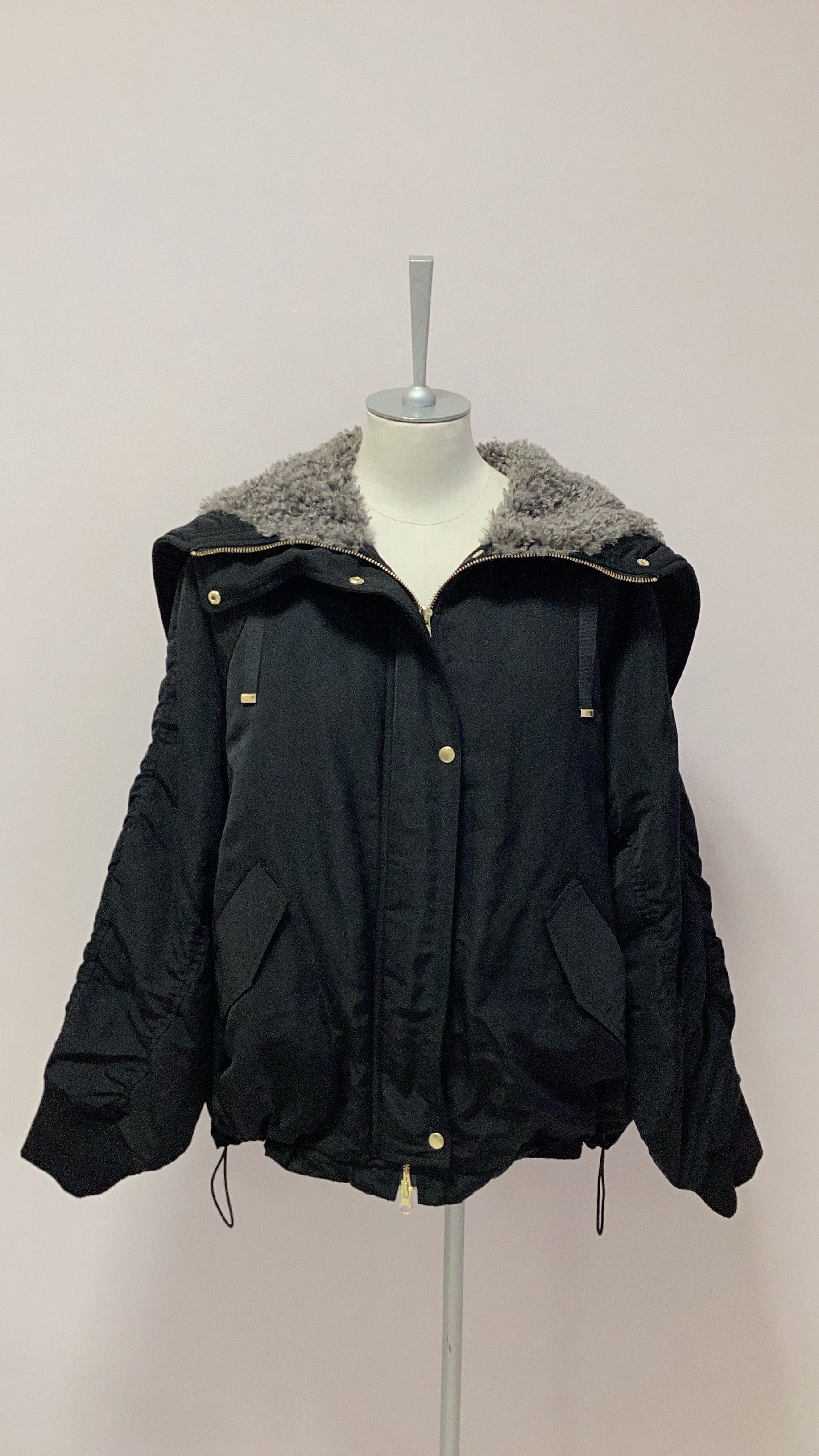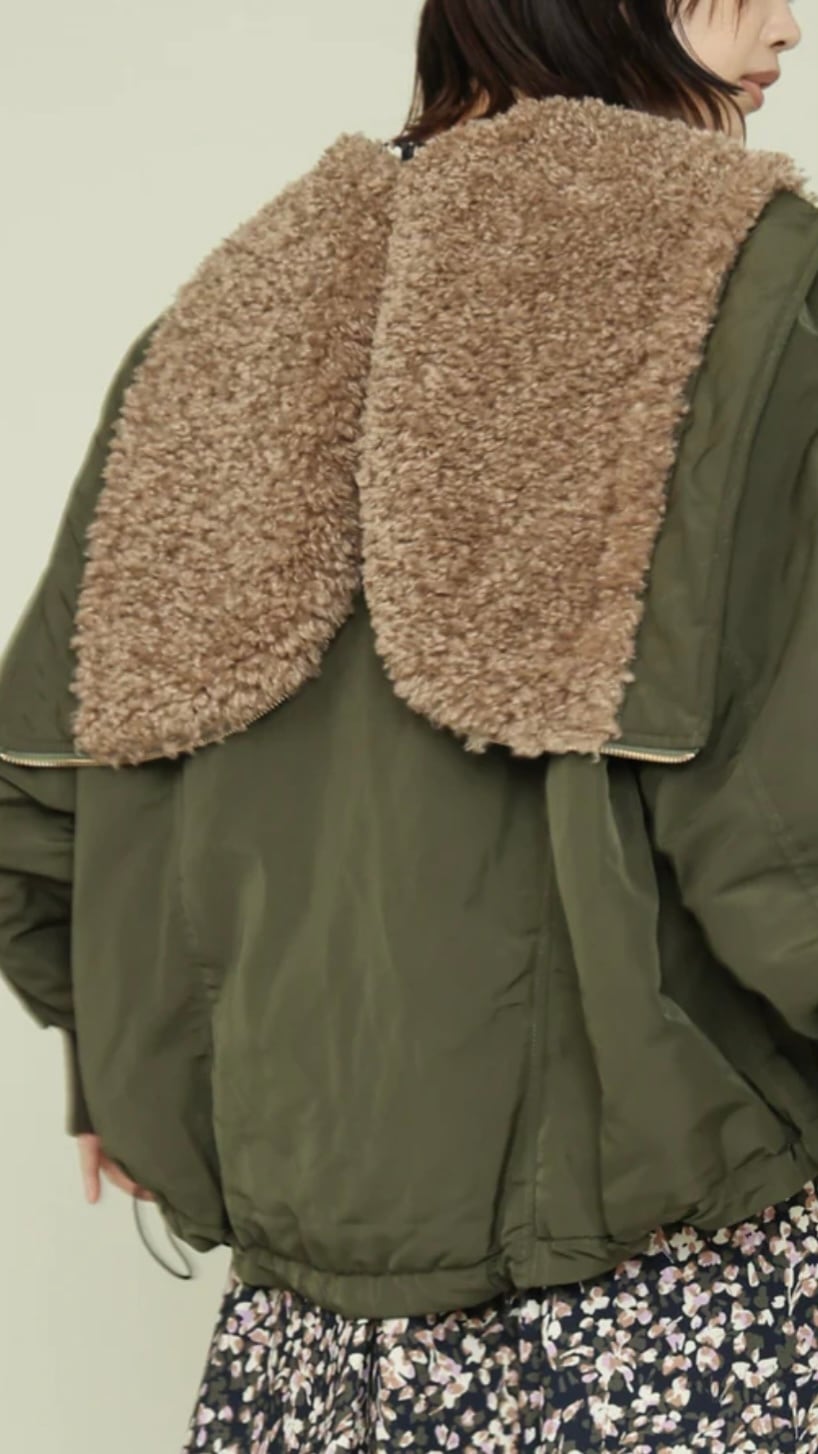 カーリーボアのフーディーブルゾン。ややショート丈でボトムとのバランスがとりやすく、ワイドパンツやスカートとも好相性。フード周りのカーリーボアが顔まわりを華やかに見せてくれるので、シンプルなスタイリングにも映える1枚です。生地感はふんわり温かく、愛らしい質感のカーリーボアと丈夫でシワになりにくい、扱いやすいツイル生地です。