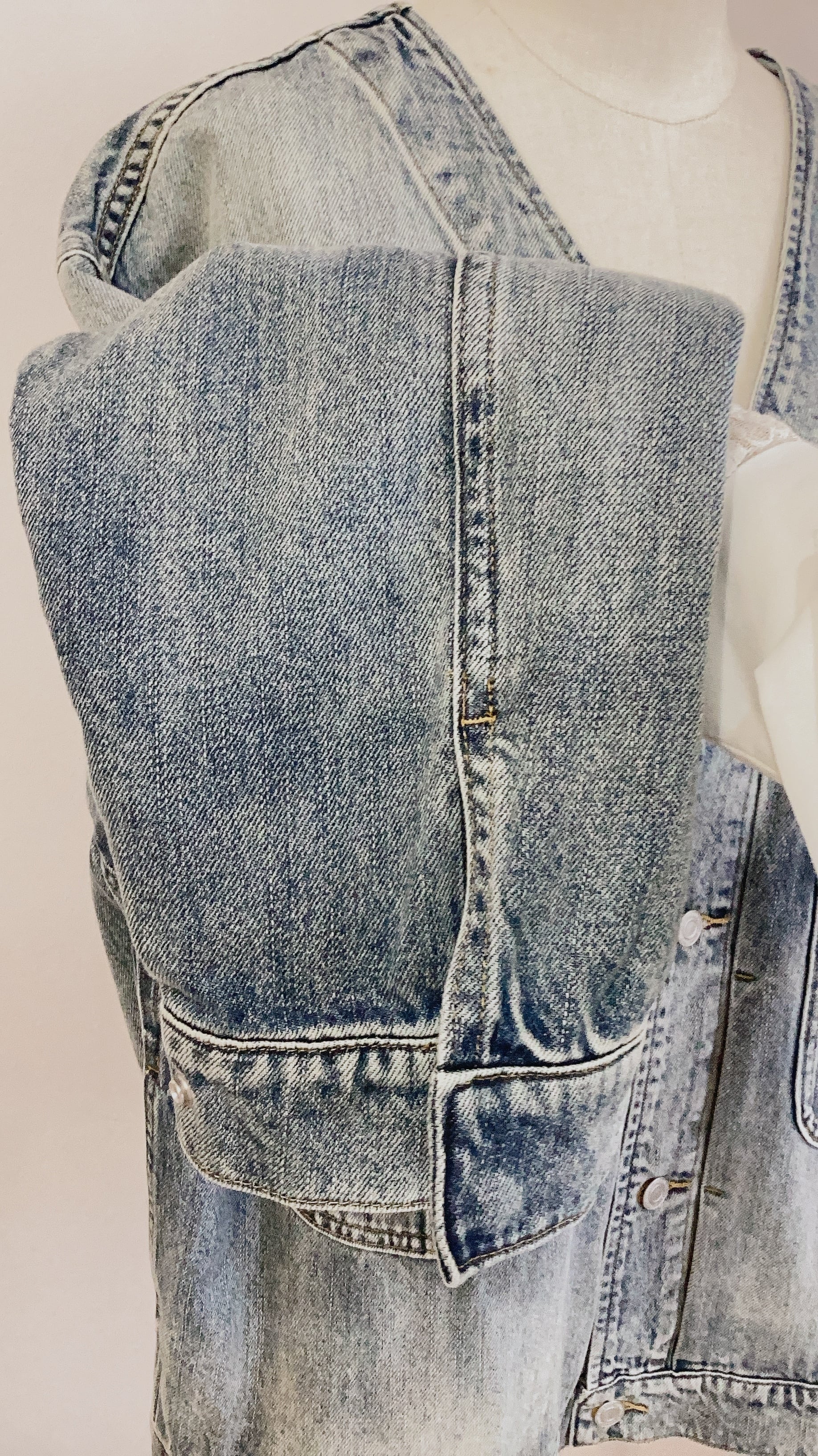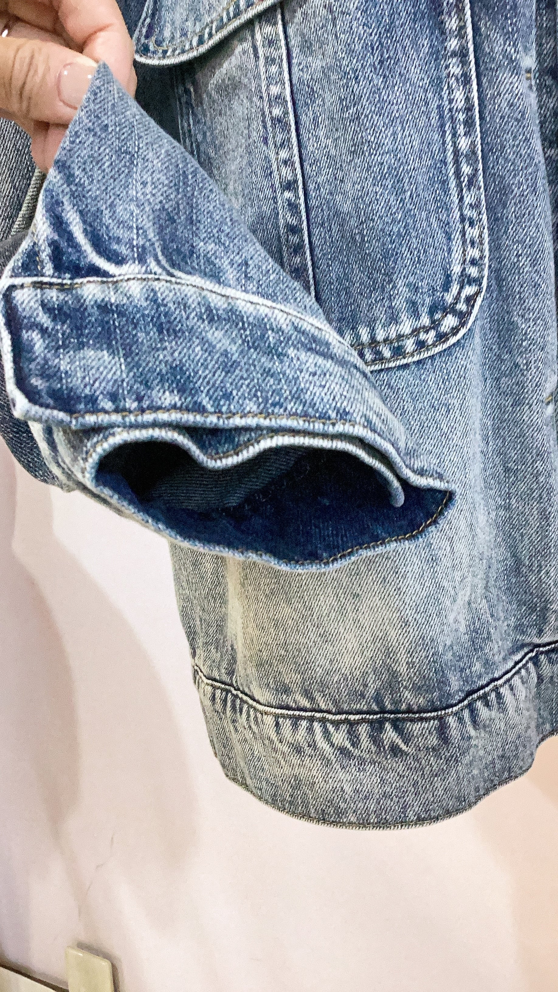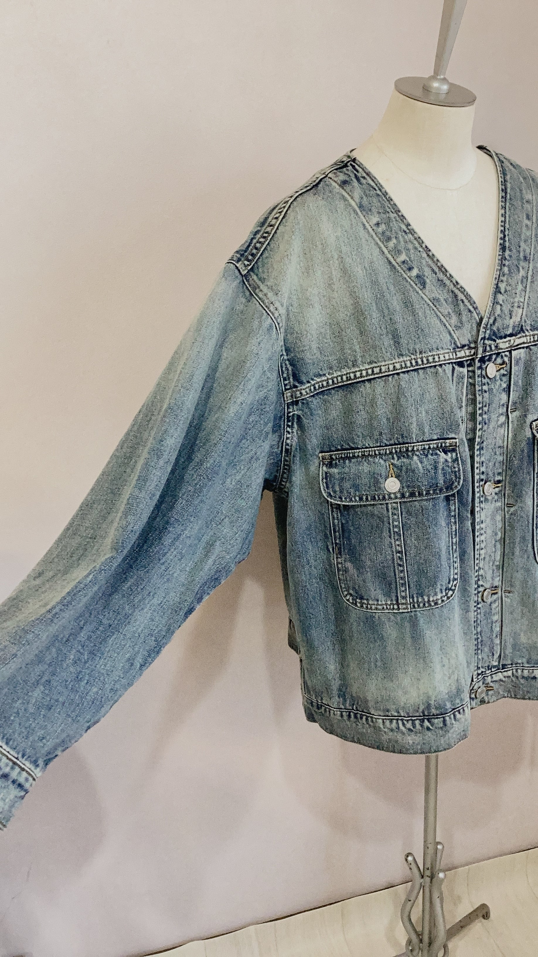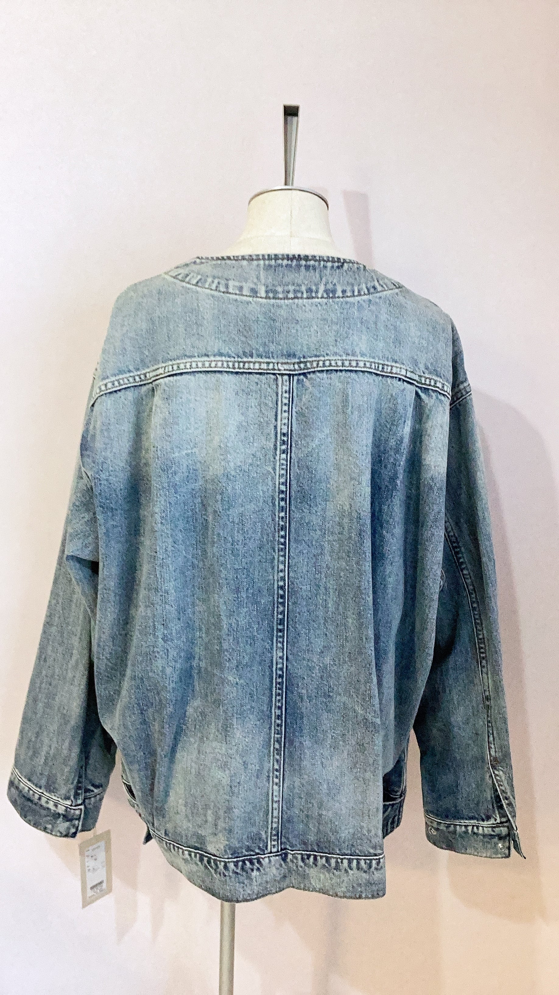 オーバーサイズのVネックデニムジャケットです。袖口はスナップボタンが2つ付いており、広さ調整可能です。