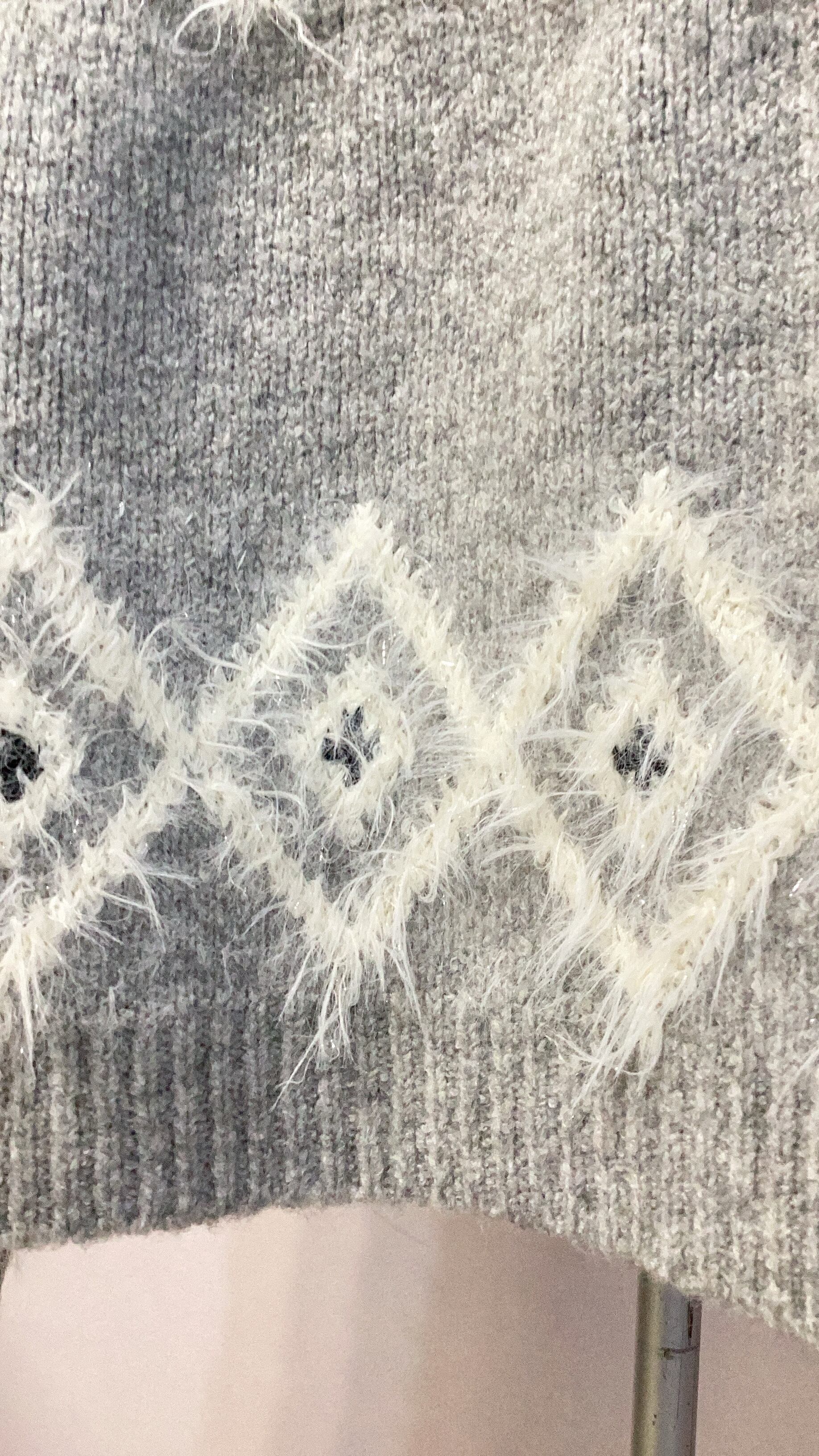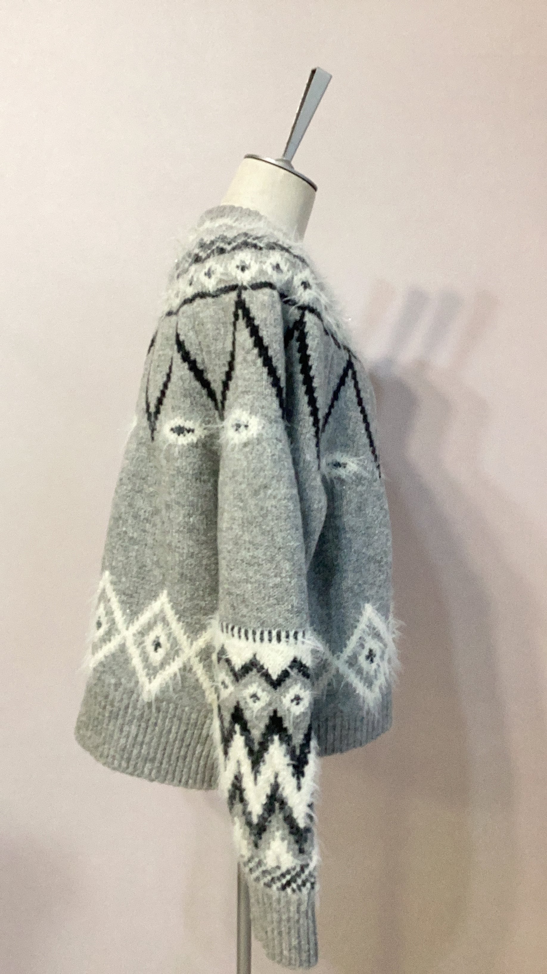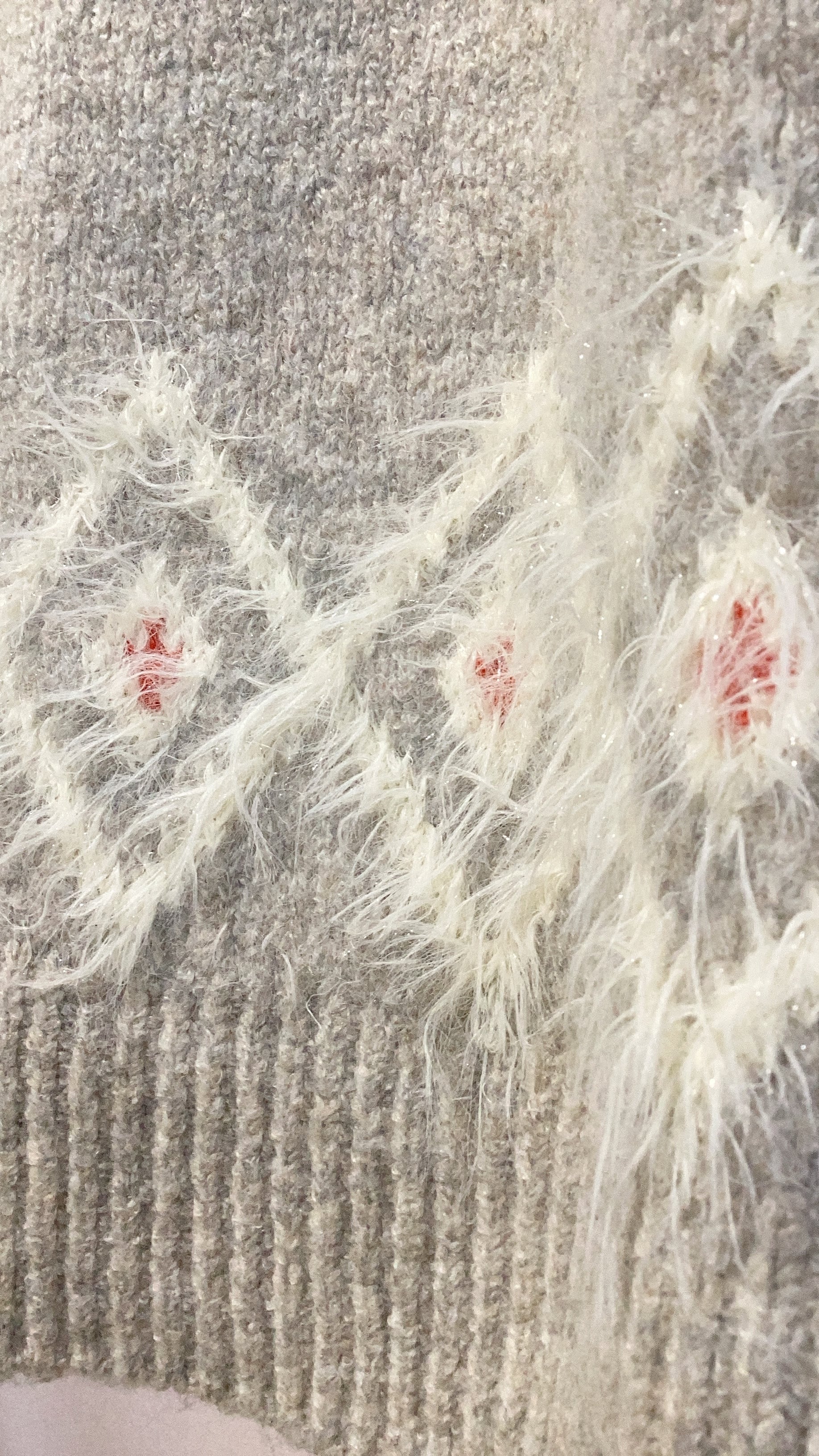 毛足の長いフェザーを織り込んだジャガードニット。丈は短めで身幅があり、トレンドのシルエット。フェザー部分はラメが入っています。