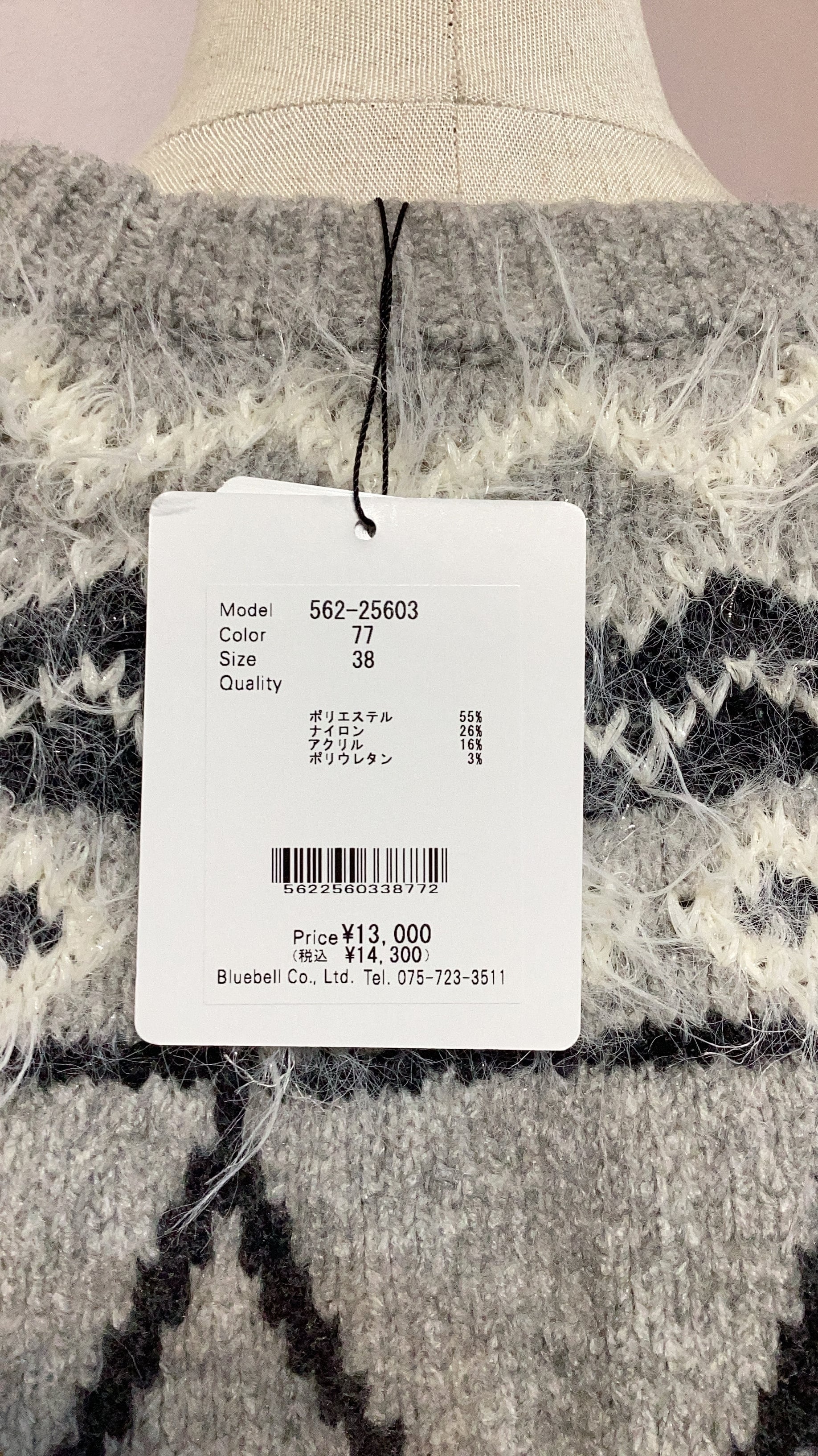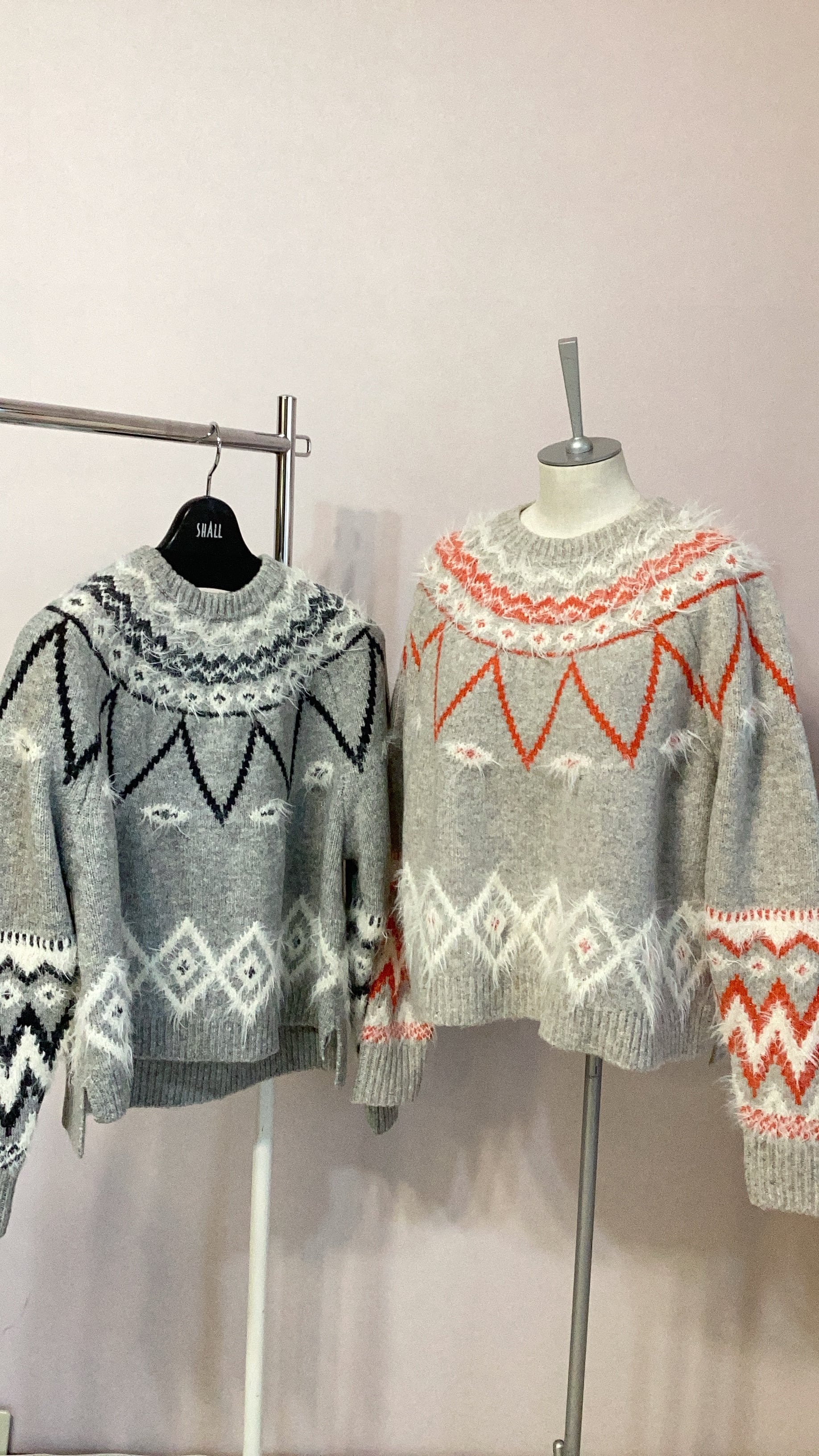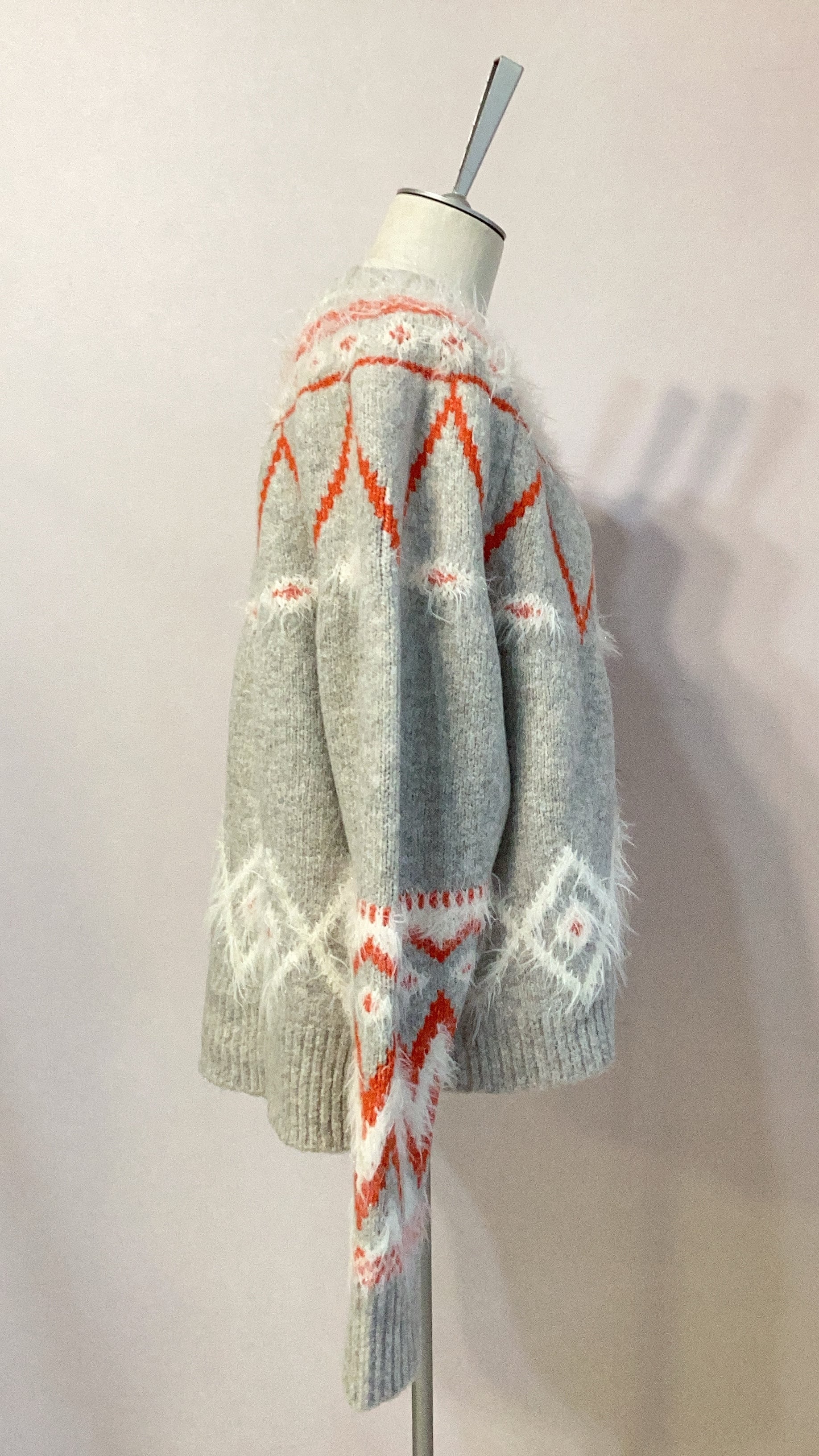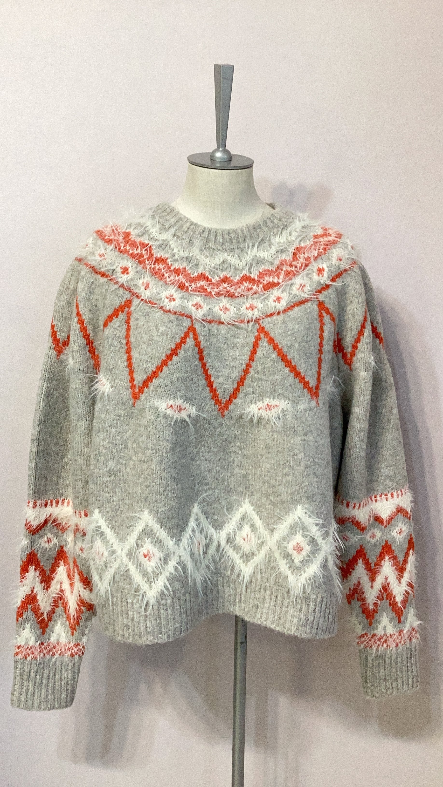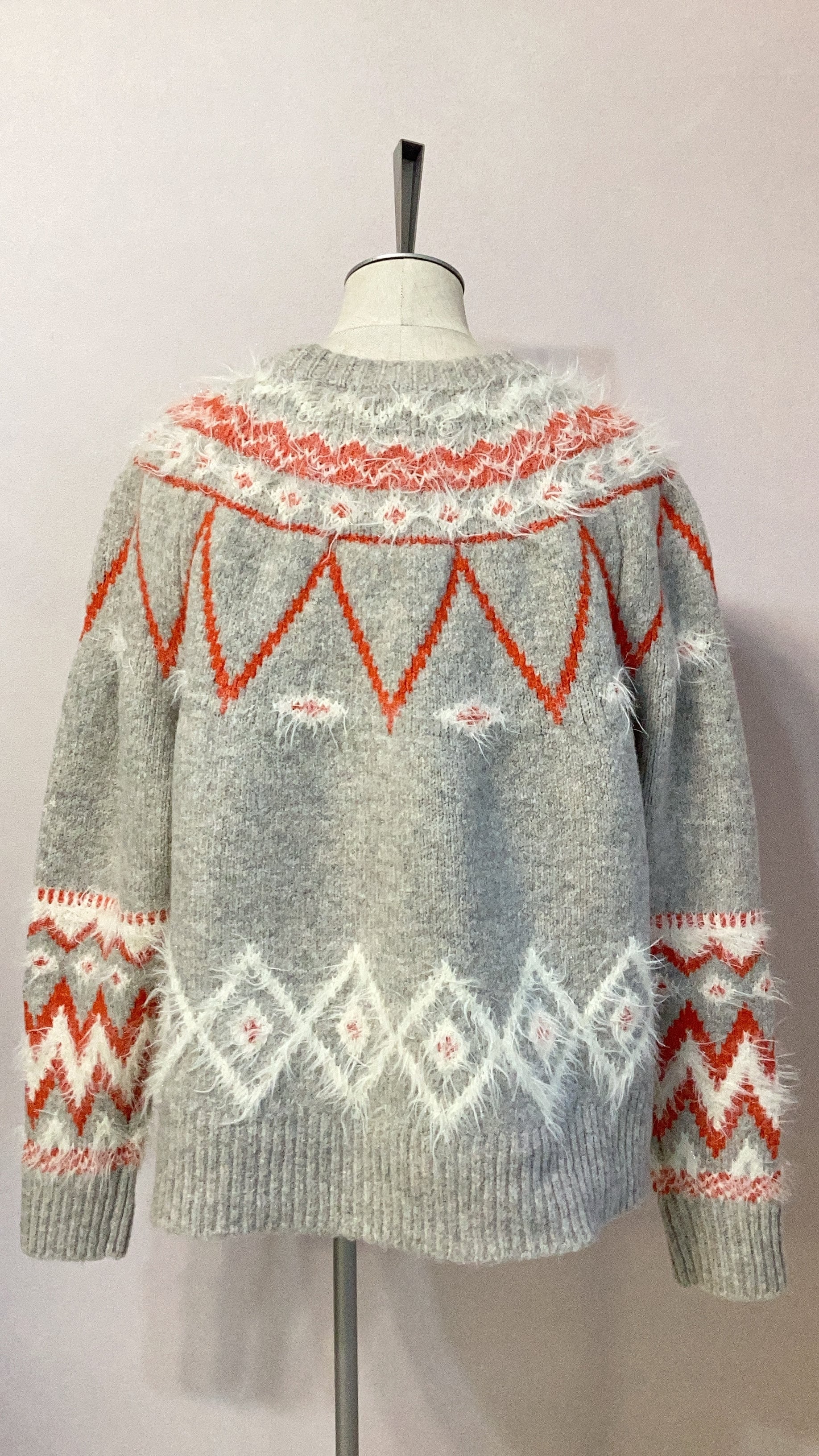 2025秋冬 QTUME フェザージャガード求心ニット No.552-25603 ライトグレー×オレンジ クチューム 9号 38サイズ