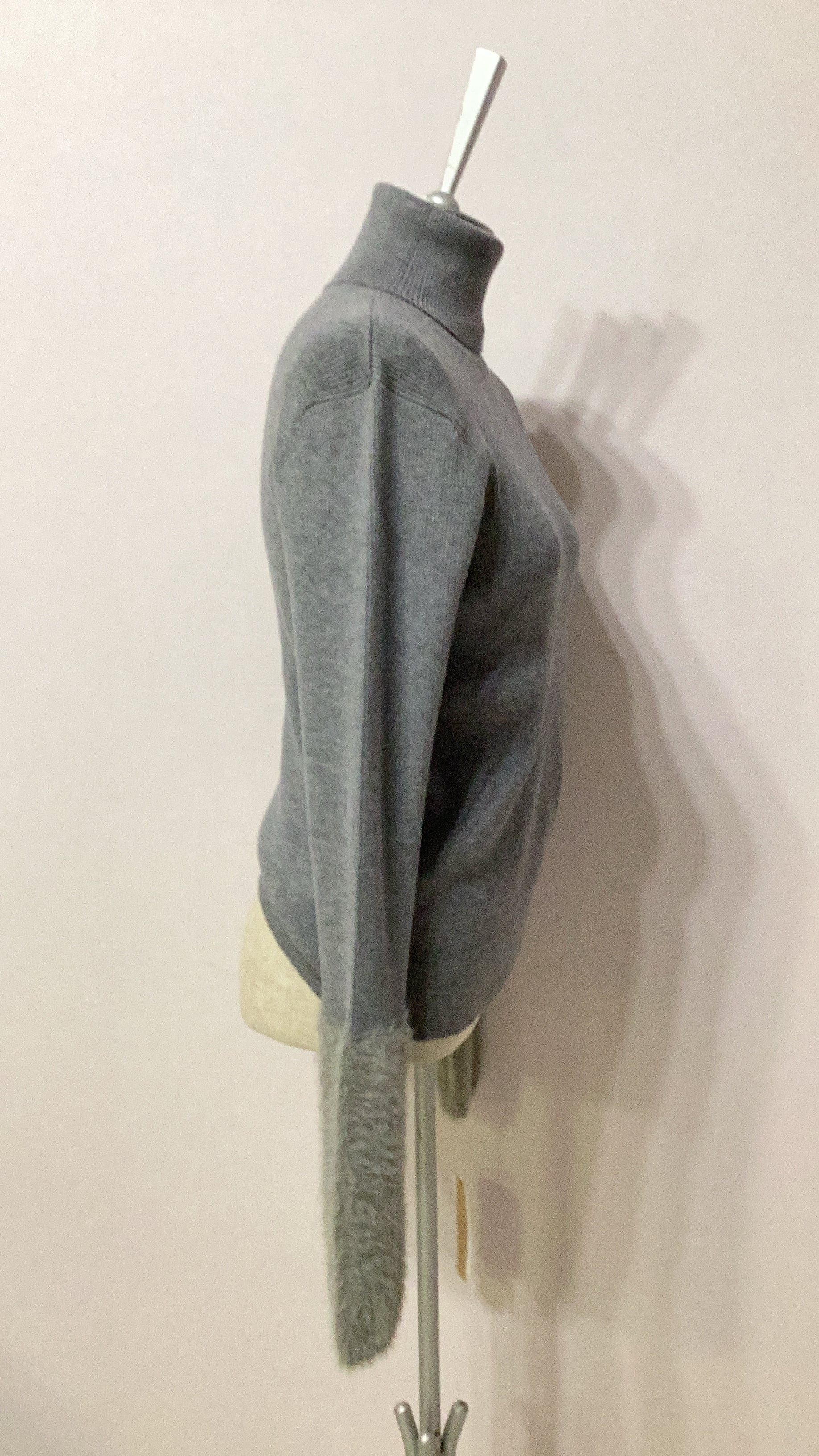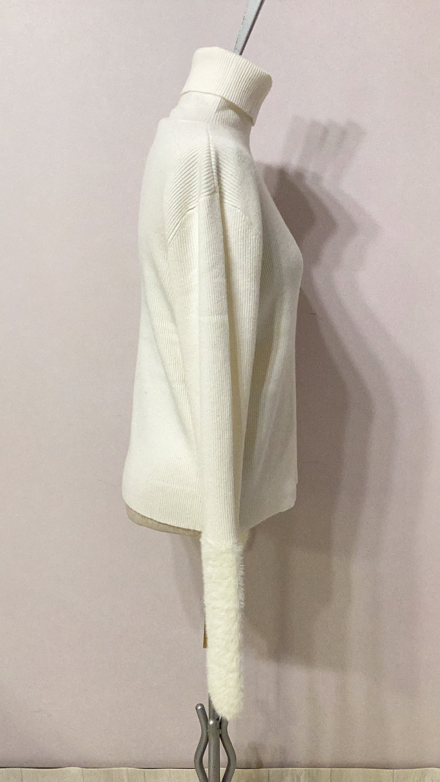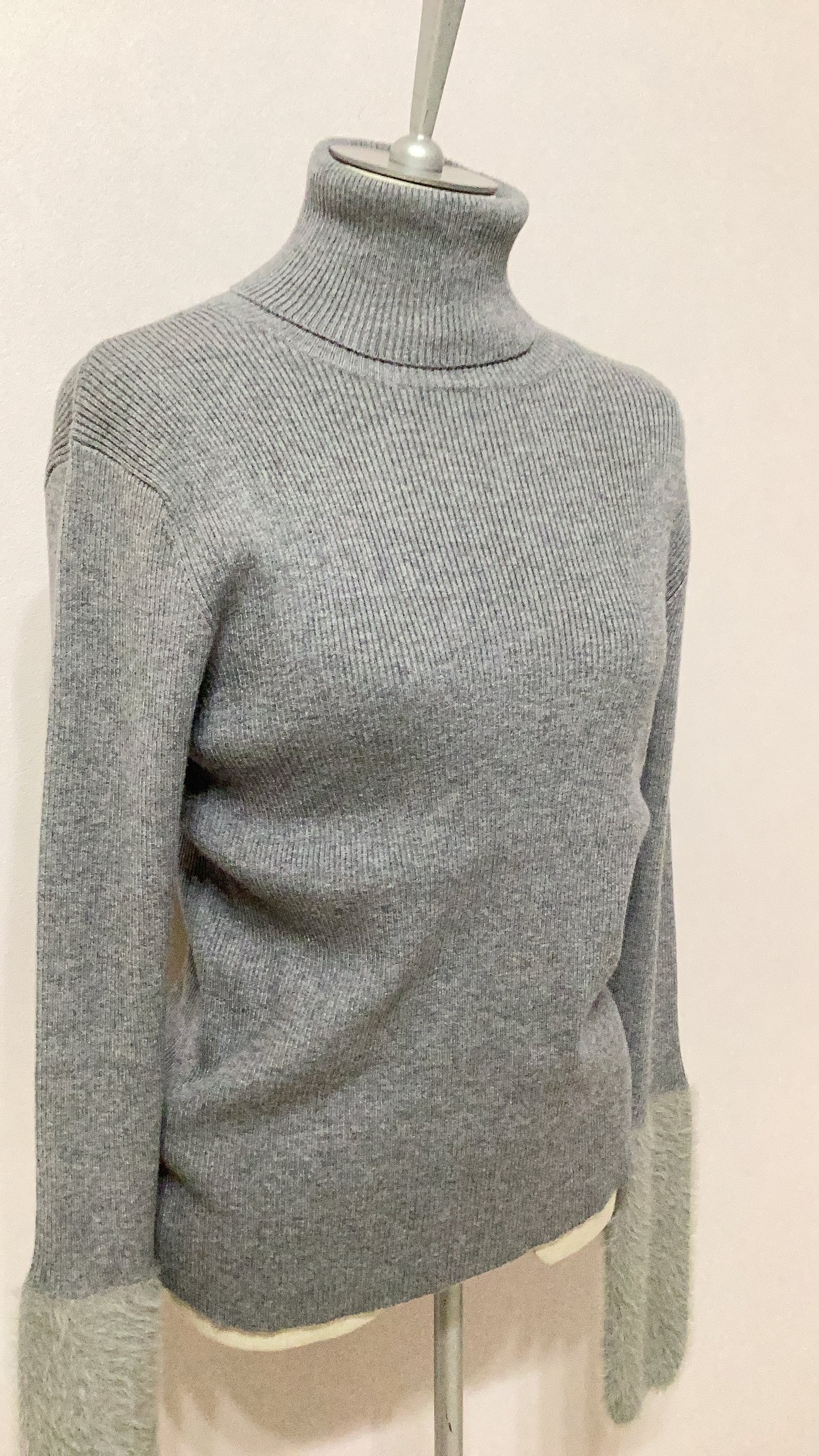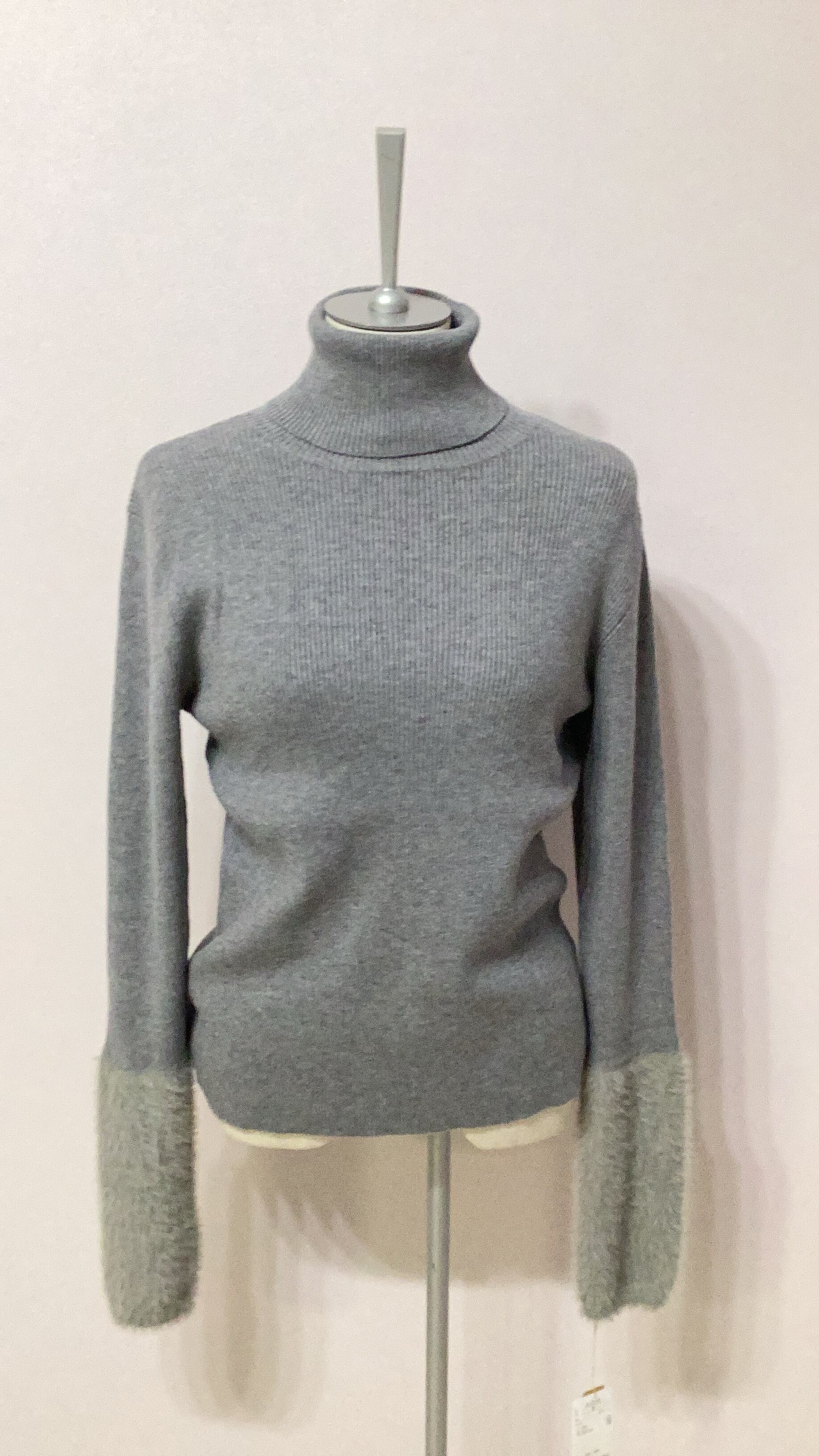 滑らかなレーヨン混のタートルネックリブニット。袖口は長めのフェイクファーで、親指が出せる仕様となっております。