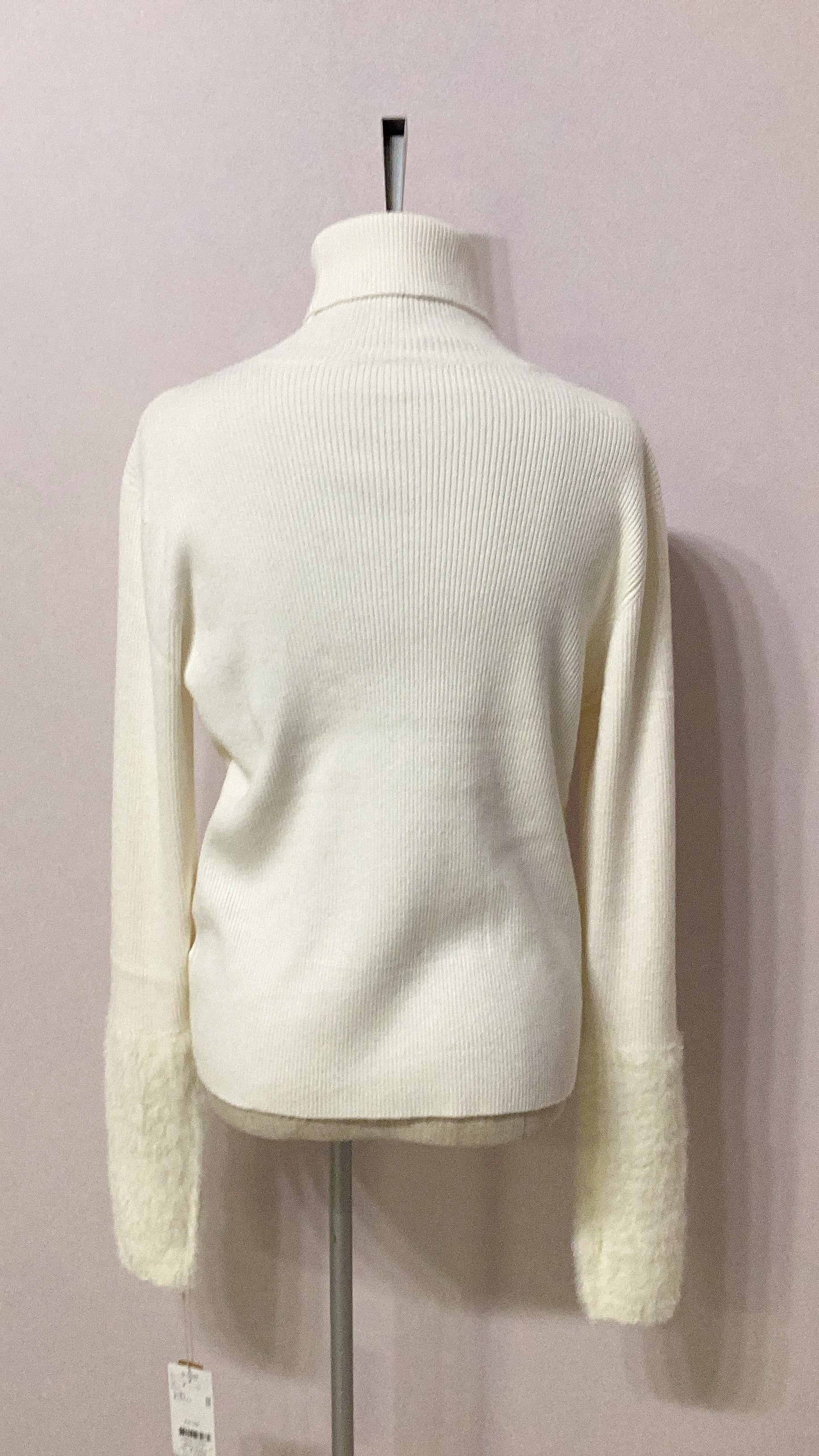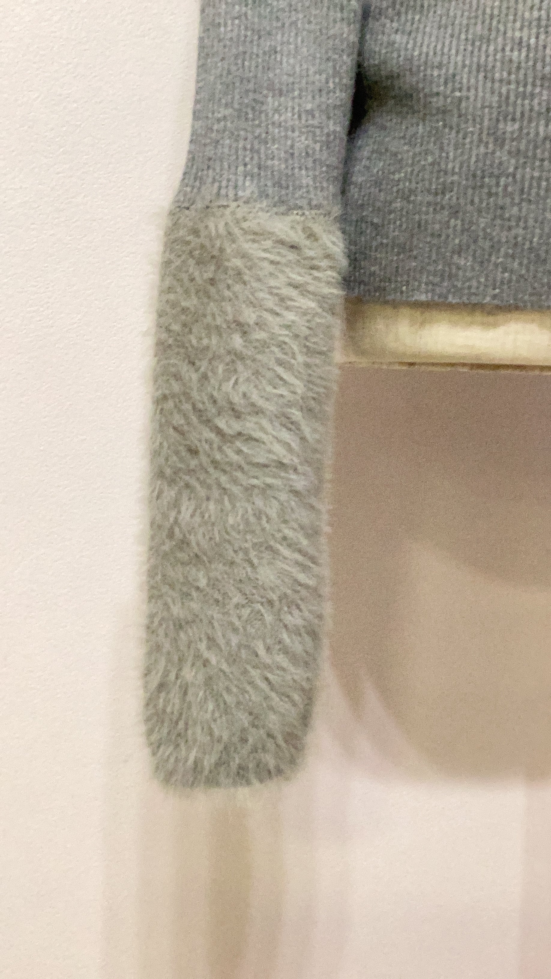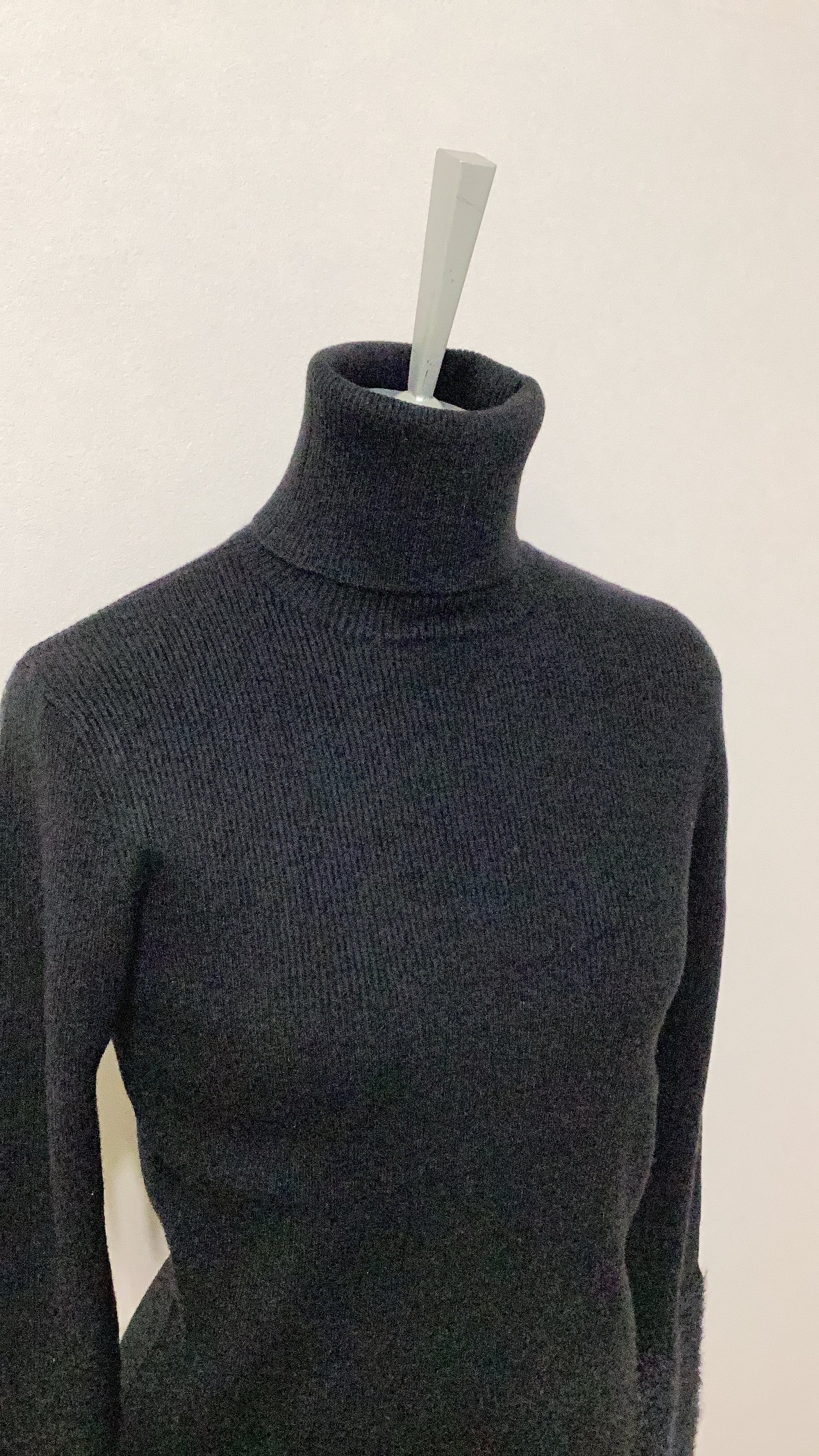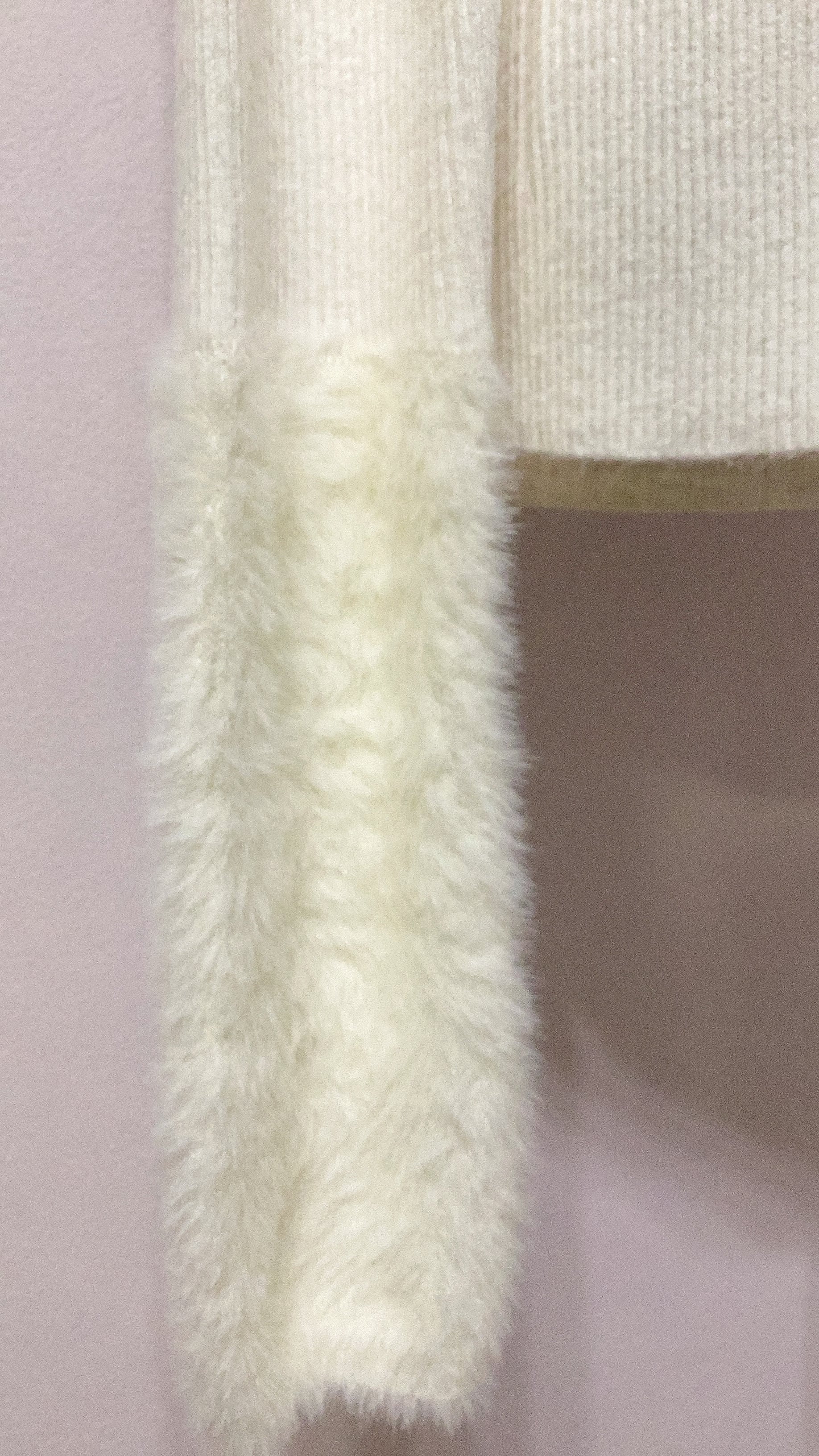 滑らかなレーヨン混のタートルネックリブニット。袖口は長めのフェイクファーで、親指が出せる仕様となっております。
