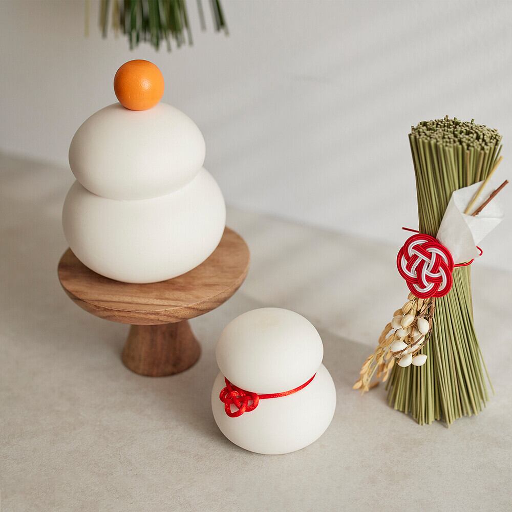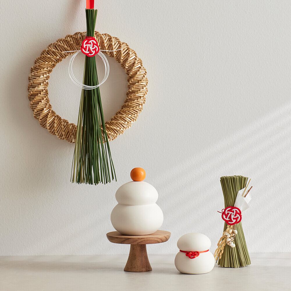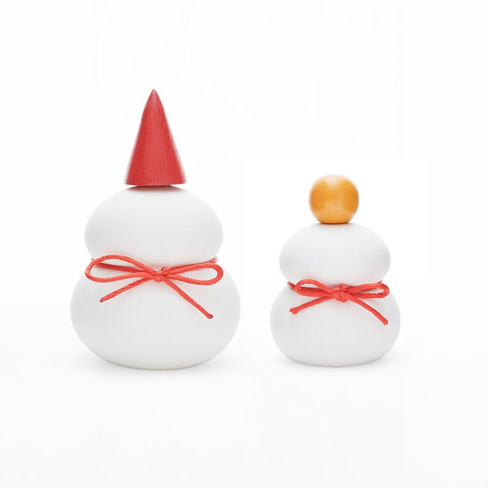 付属で飾り紐、ウッドでできた雪だるまの帽子、鏡餅の橙がセットされるので、お好みの飾り方をお楽しみください。