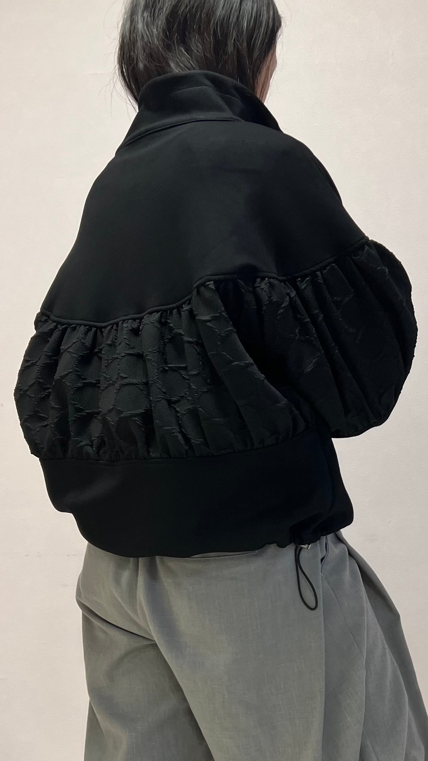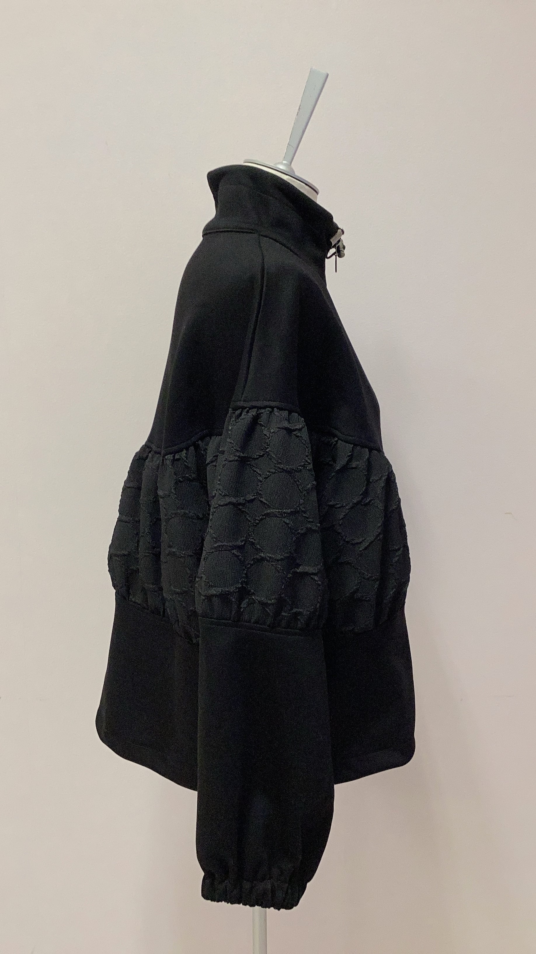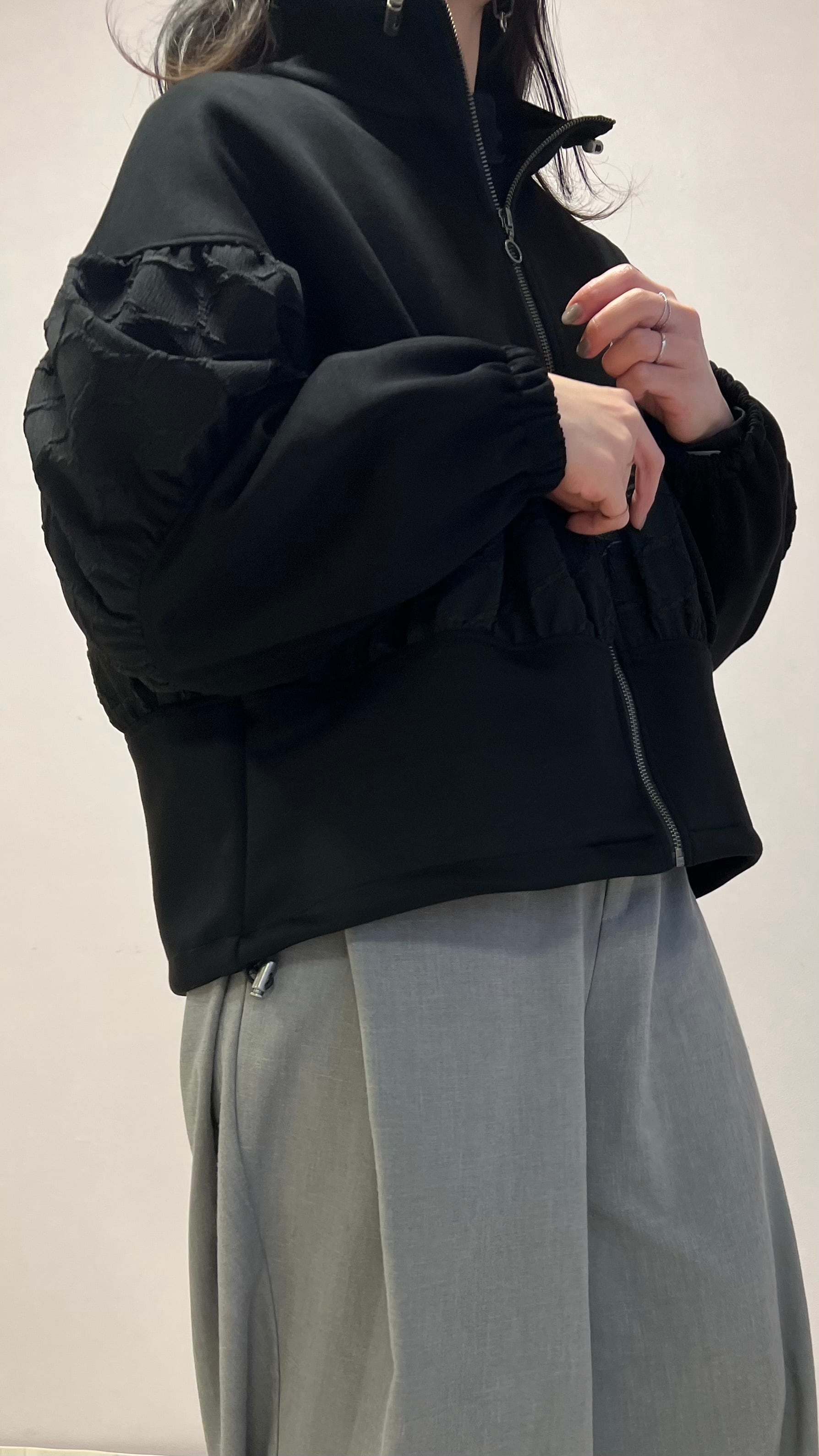 滑らかな素材感のハイネックブルゾンです。胴から腕にかけた異素材切替が目をひく一枚。丈は短めで身幅がゆったり。ドローコードでシルエットを変えて着用可能です。