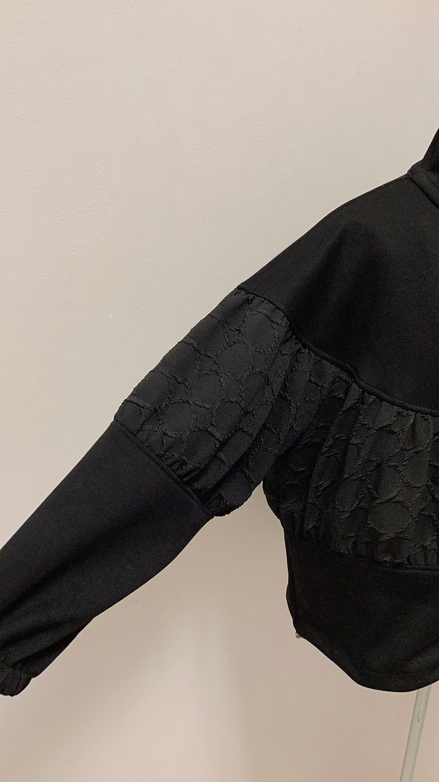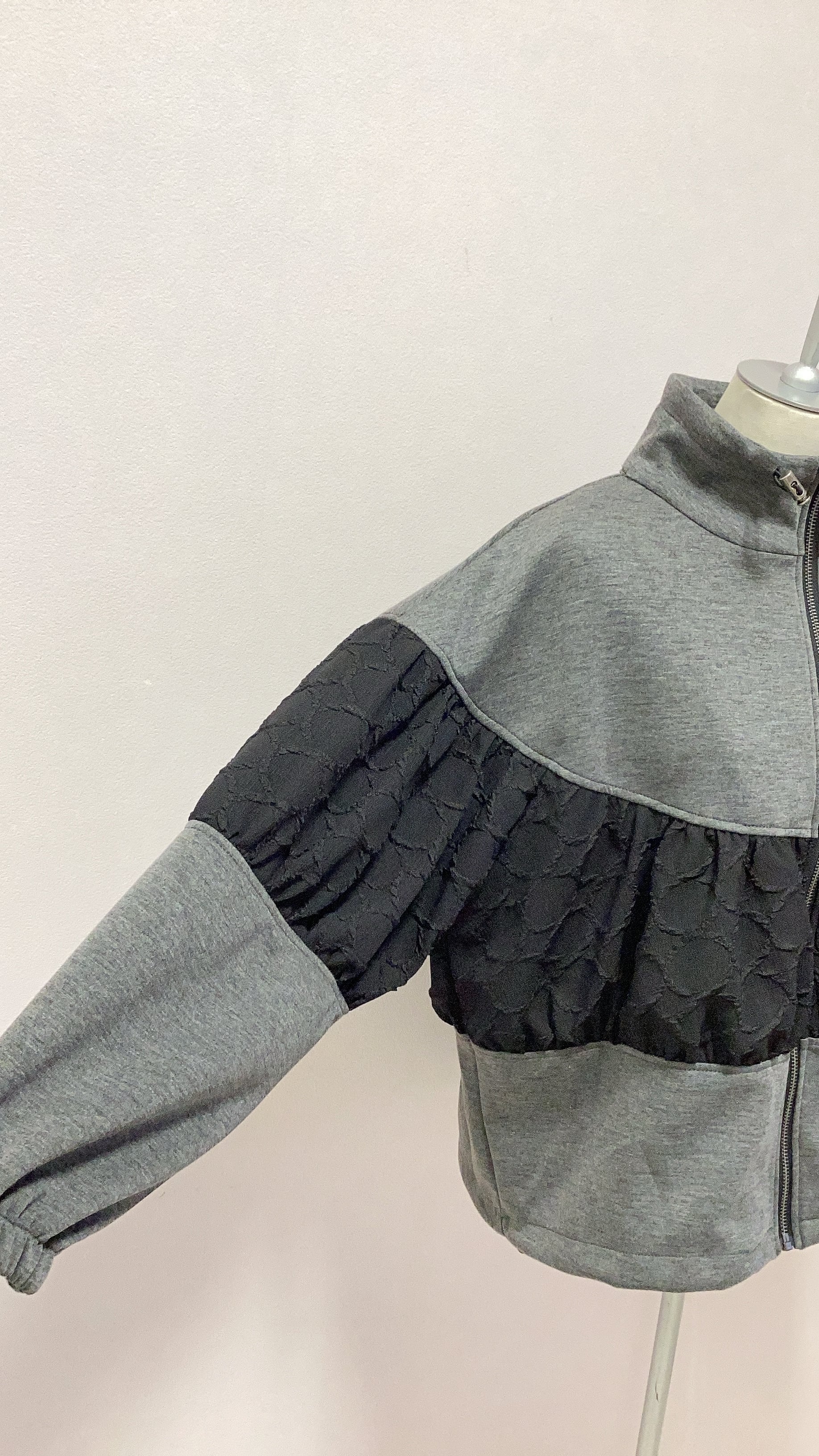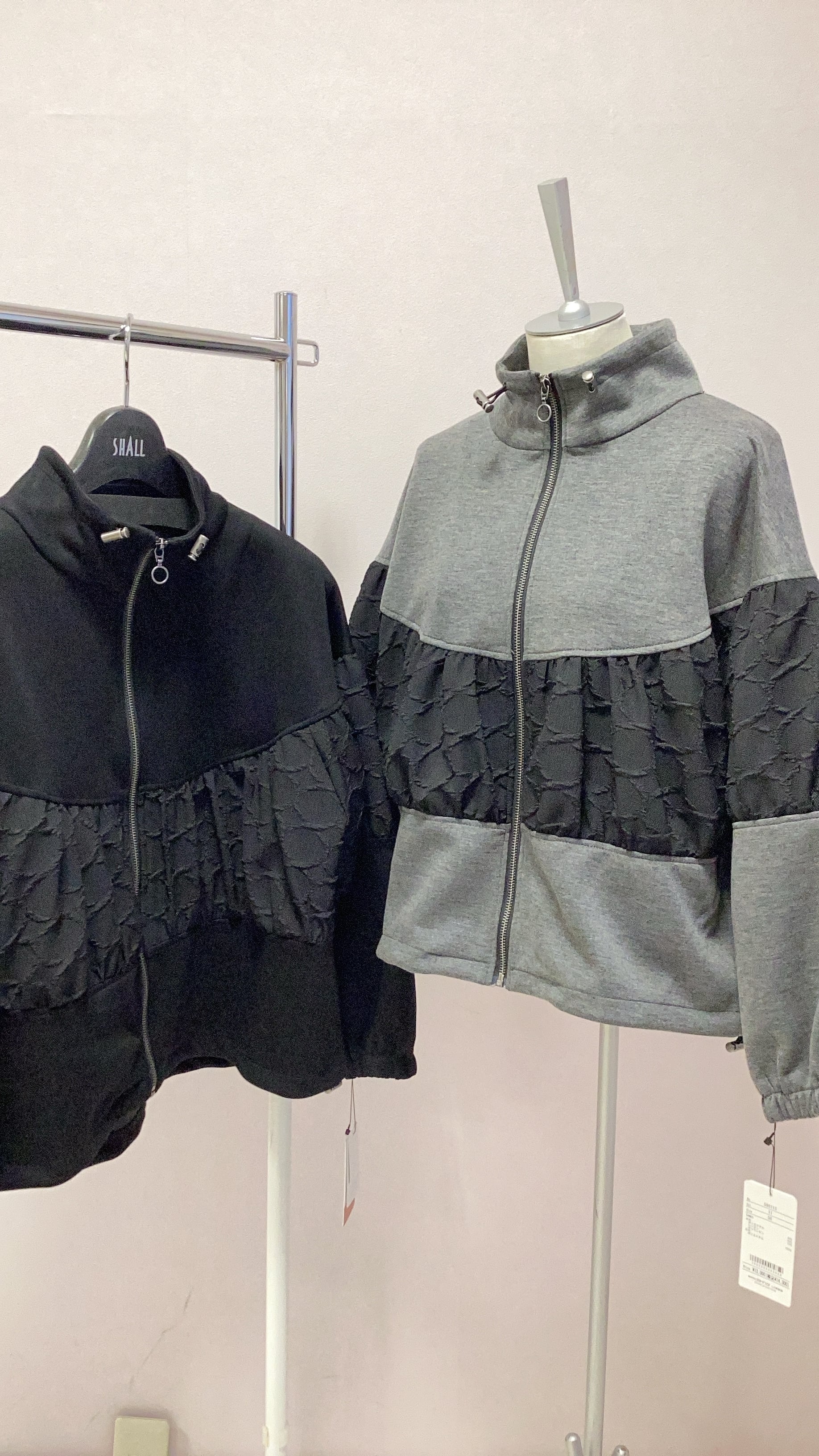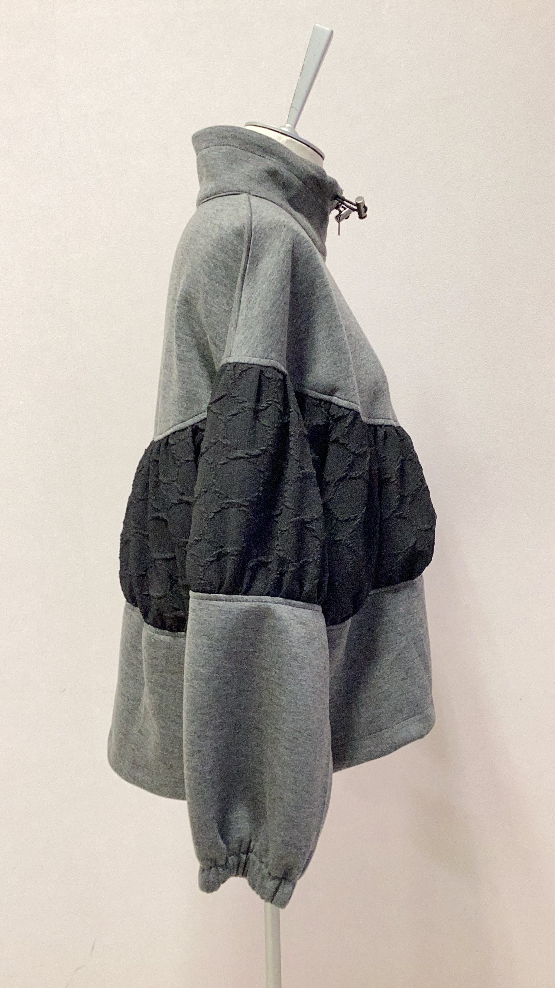 滑らかな素材感のハイネックブルゾンです。胴から腕にかけた異素材切替が目をひく一枚。丈は短めで身幅がゆったり。ドローコードでシルエットを変えて着用可能です。