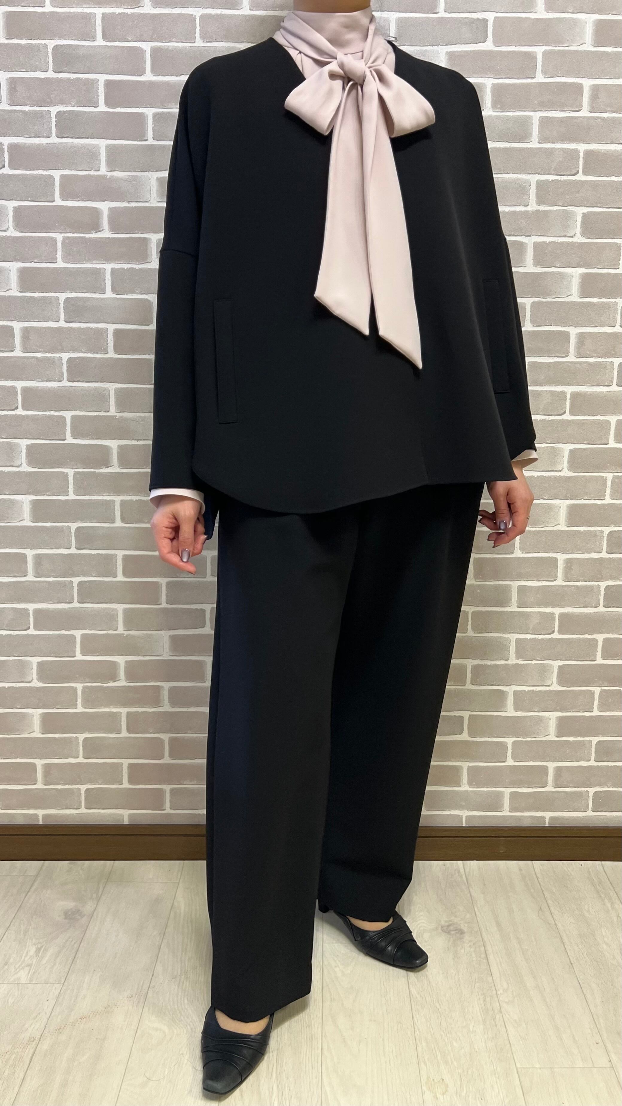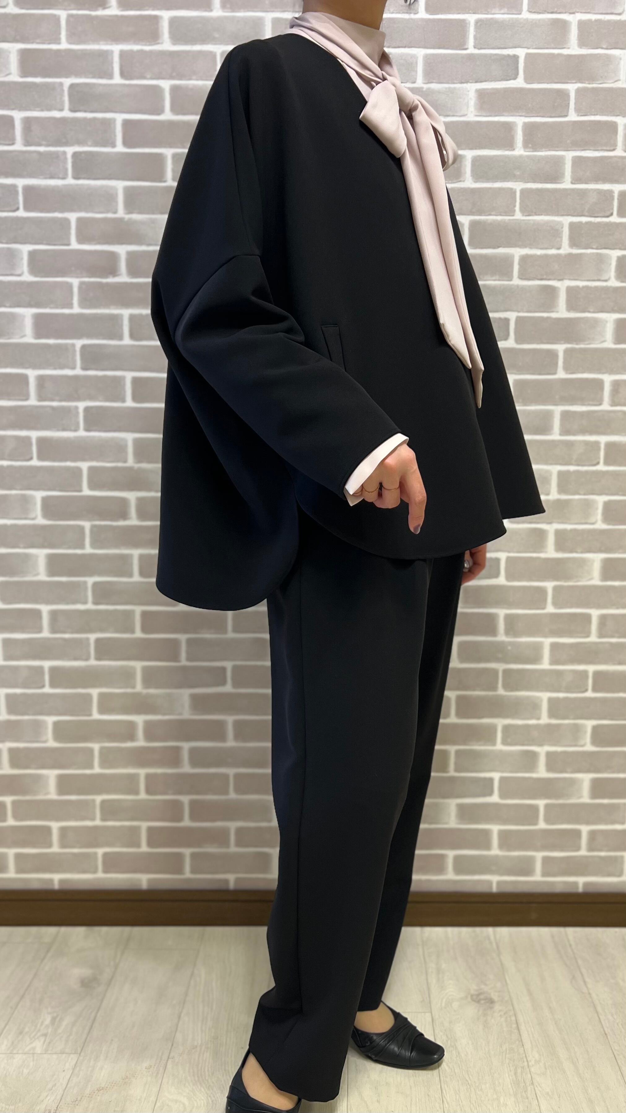 身幅ゆったり丈も長めで、トレンドシルエットで綺麗めなセットアップです。