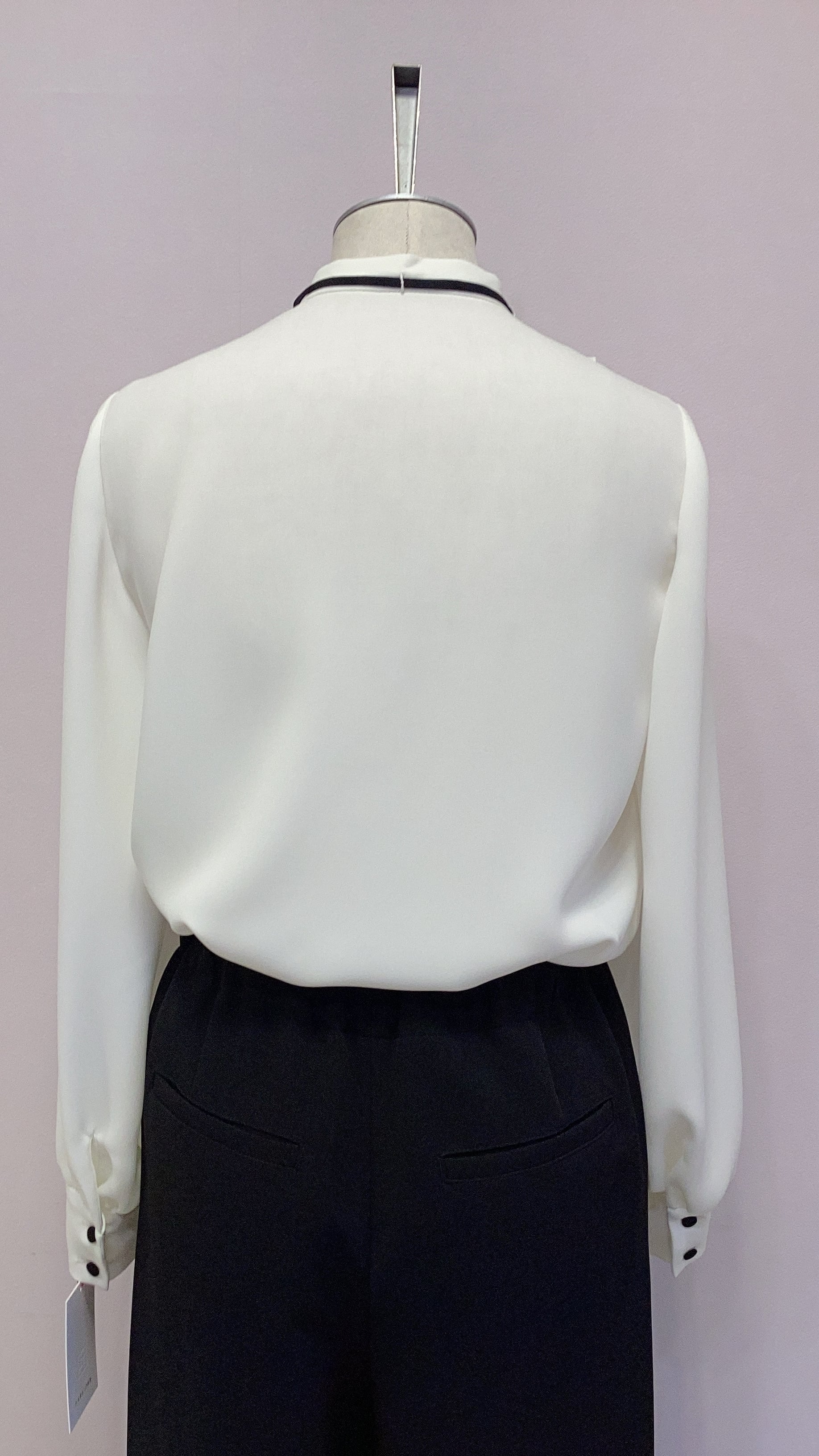1番上と手首のくるみボタンで、首元のリボンは取り外し可能です。
