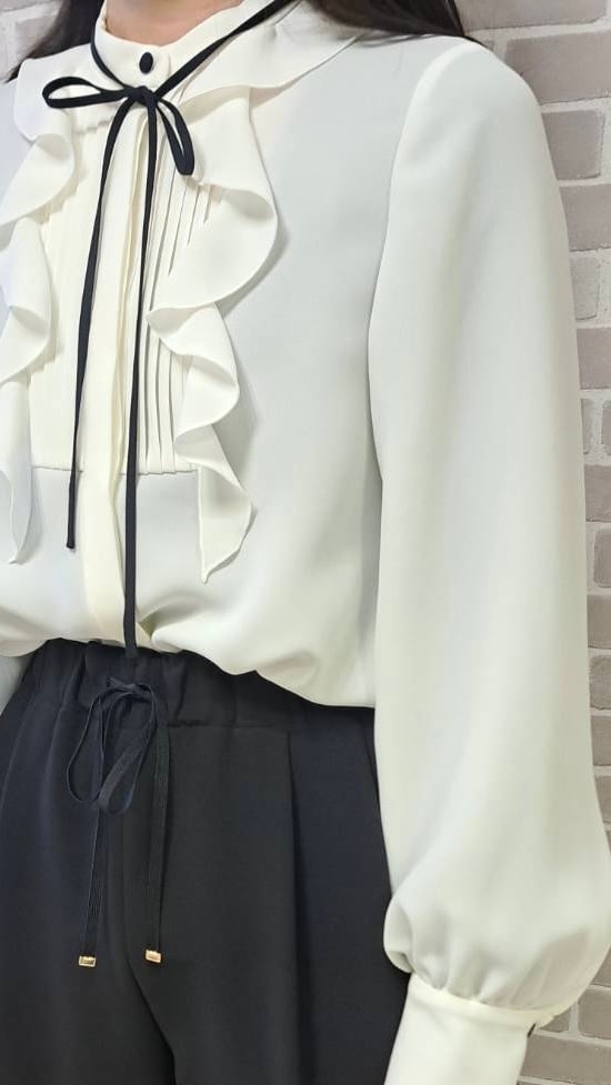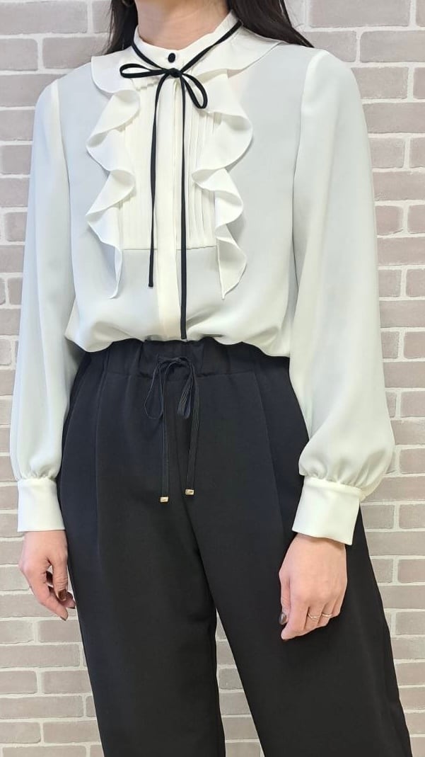 胸元のフリルとプリーツが上品なシフォンブラウスです。ベーシックなシルエットで華やかなフォーマルスタイルにぴったり。