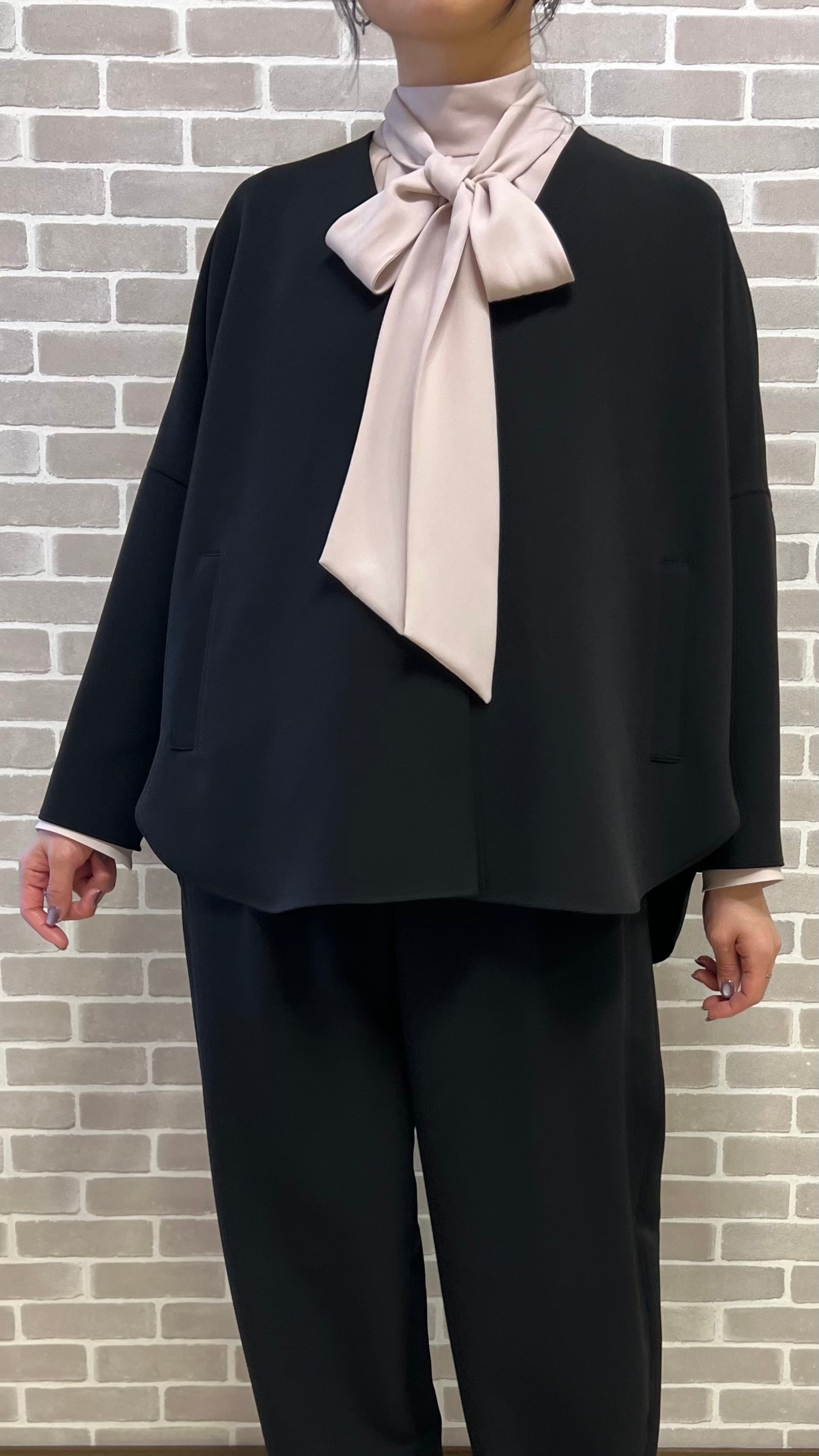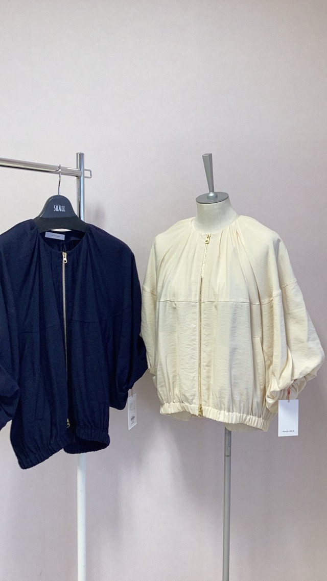 袖が長めでクラシックな印象。裾はゴムになっていて調整せずに自然なシルエットに。