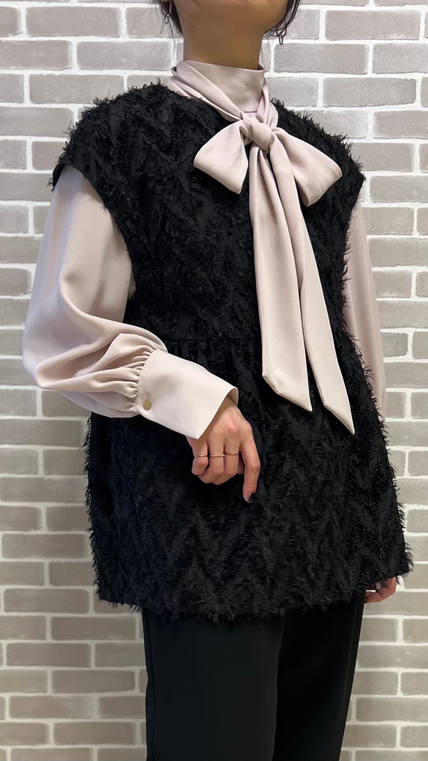 長いバックリボンが特徴的なシフォンブラウス。スカーフのように巻いて前でボウタイにもできます。