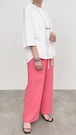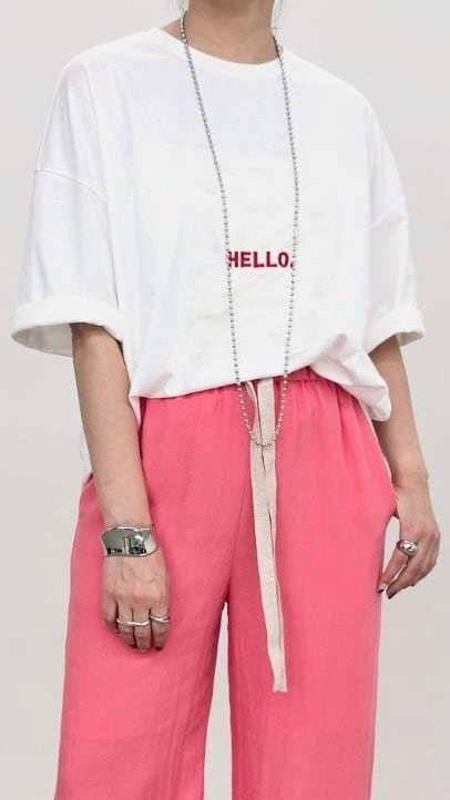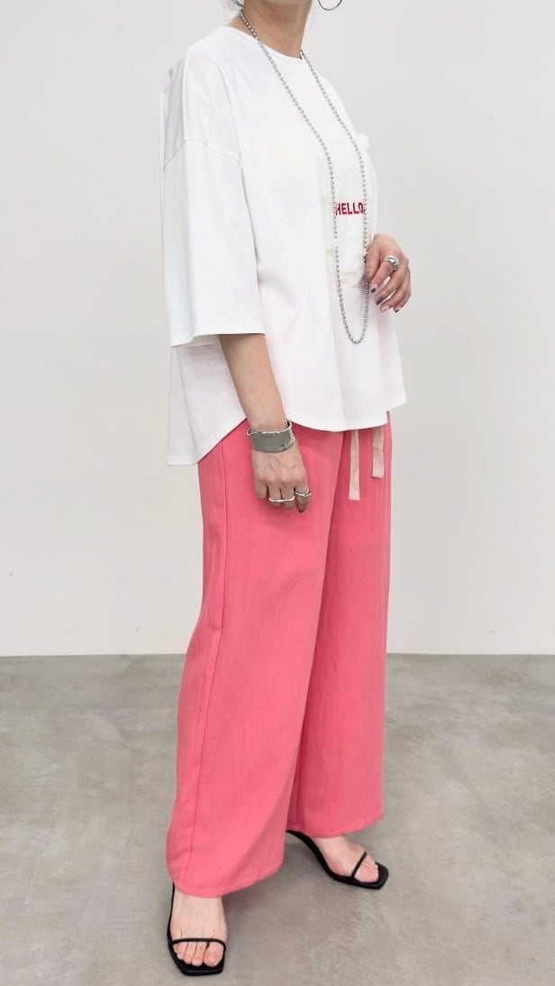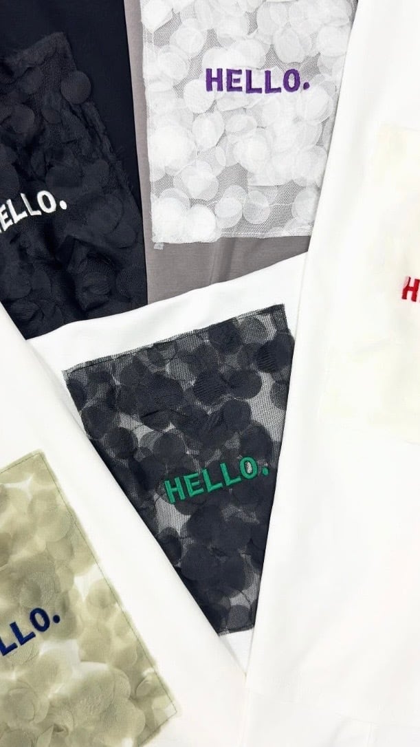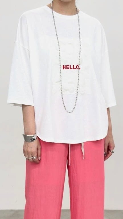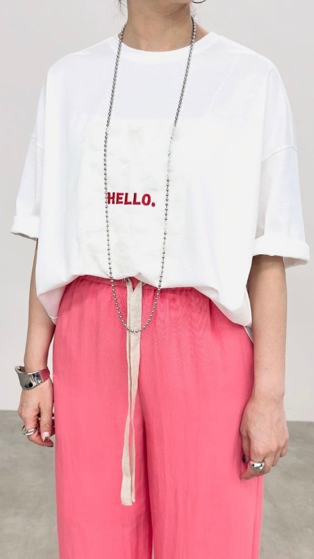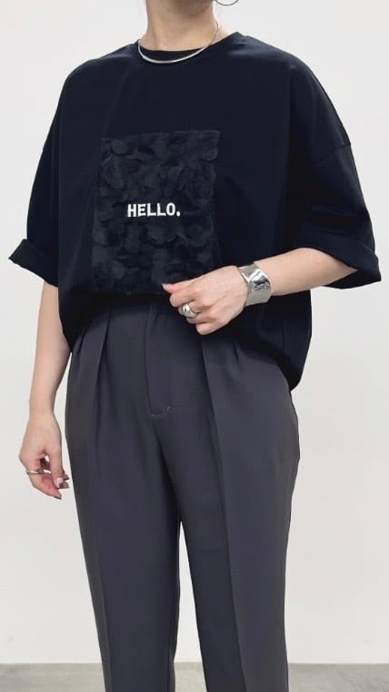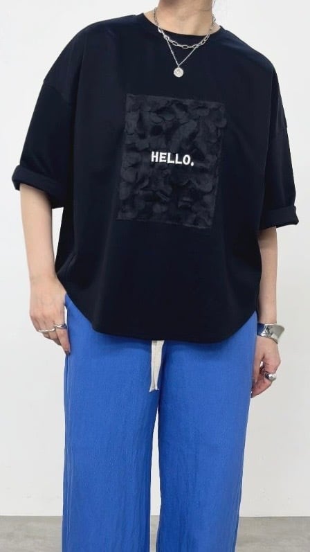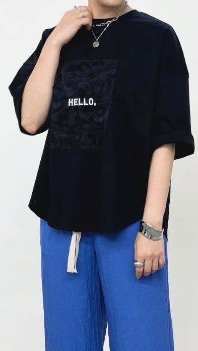 身体のラインを拾わないゆったりシルエット。ラウンドヘムで軽さをプラス。胸元のサークルチュールが存在感抜群で、目を惹く配色ロゴは刺繍になっています。