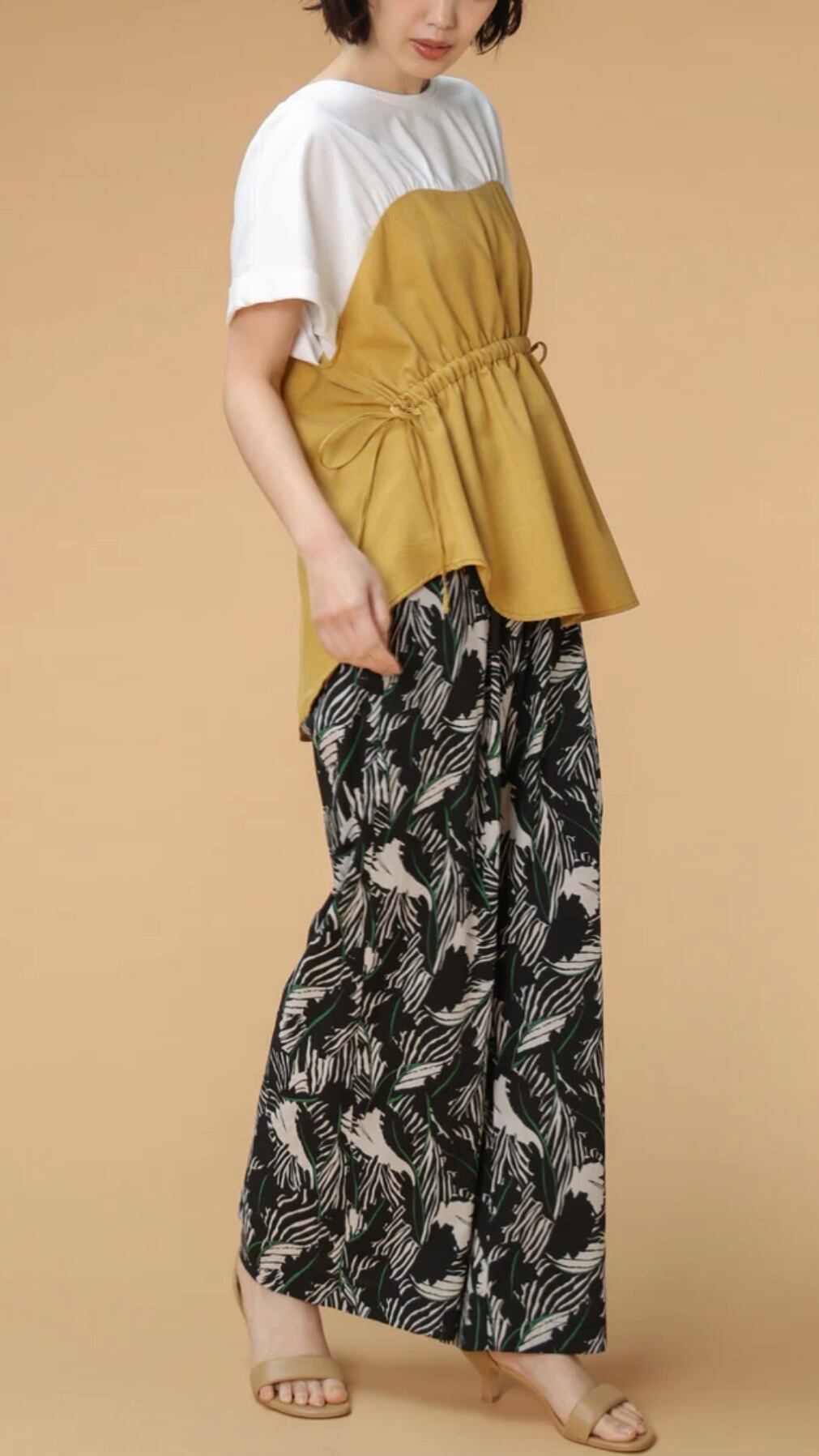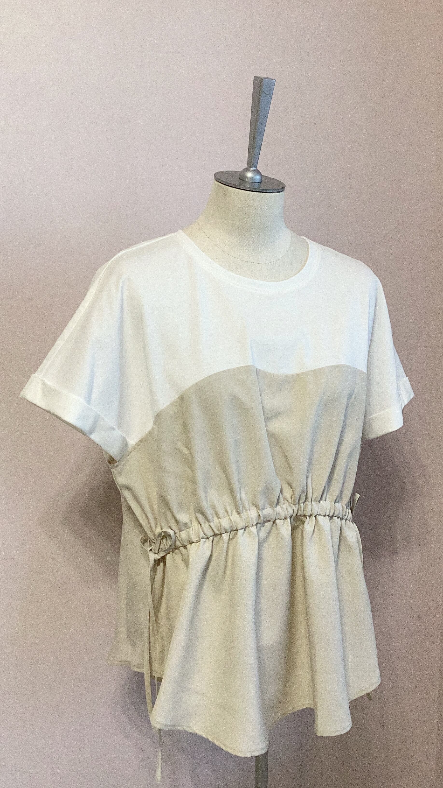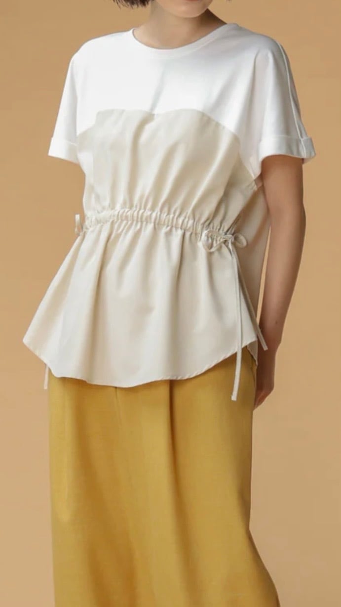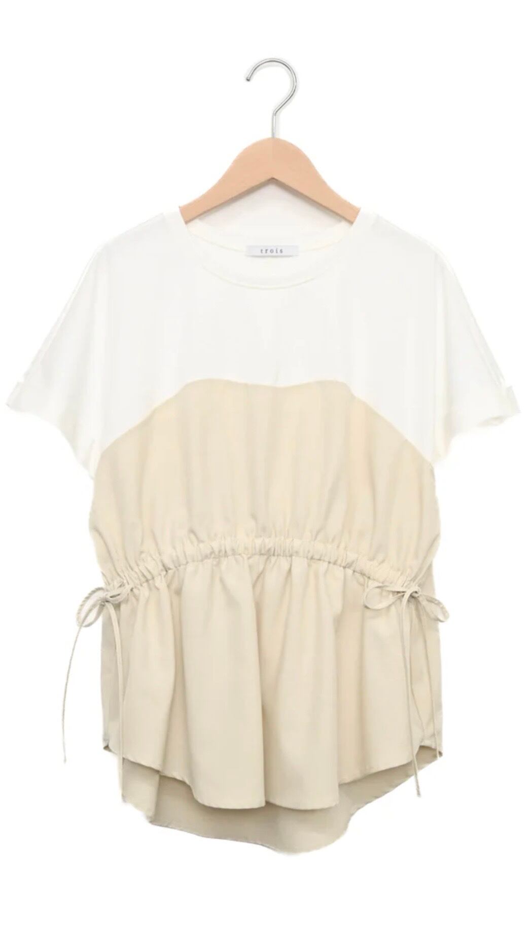 上身頃はすっきりとしたカットソー素材に、ウエストにギャザーをたっぷりと入れたシャンブレーエステル素材に切り替えることで、メリハリのあるシルエットを作り出しています。サイドのリボンで、シルエットの調整が可能。一枚でレイヤードコーデが完成する主役級トップスです。
