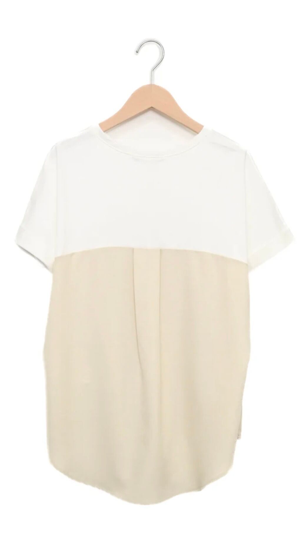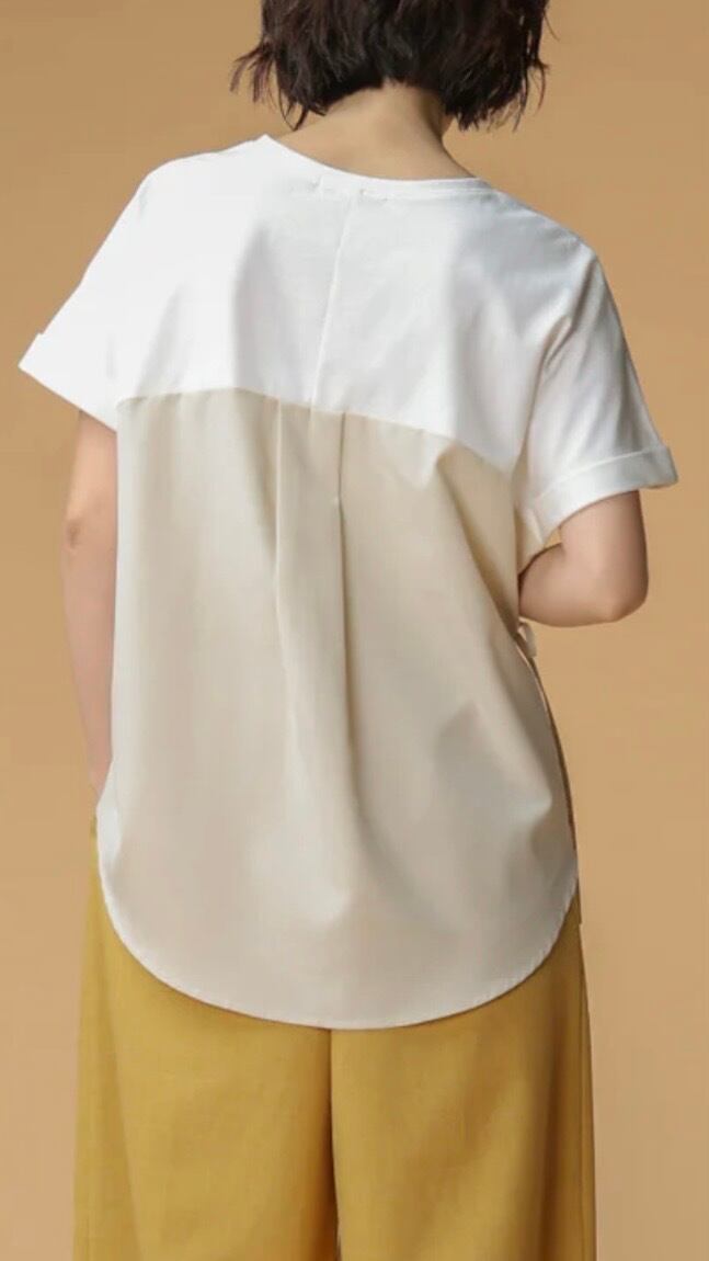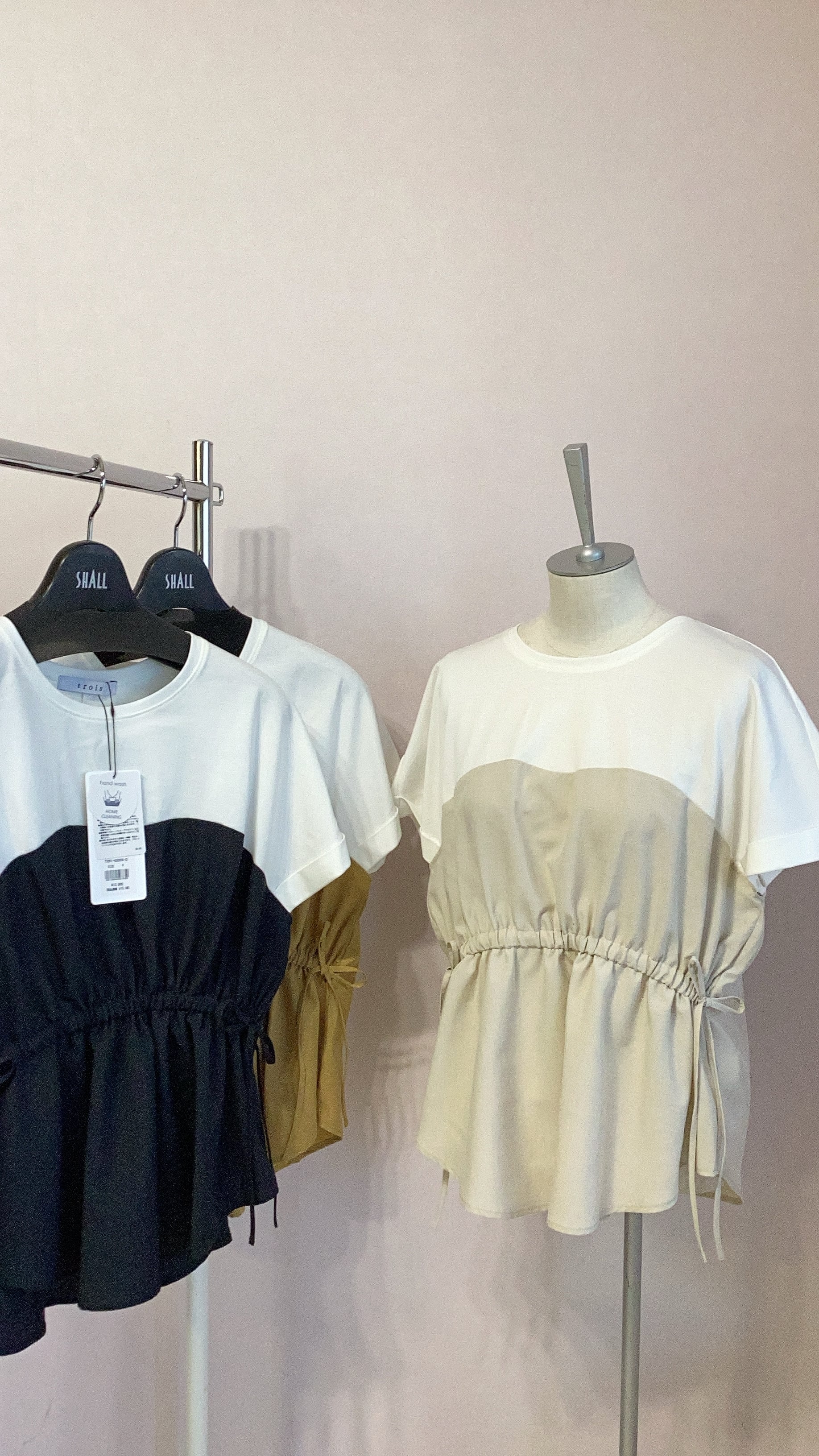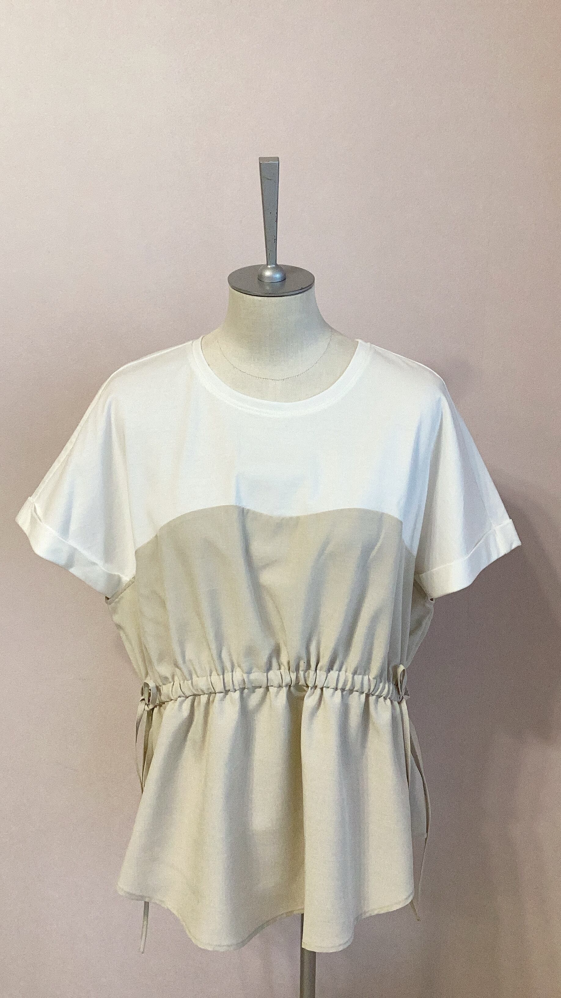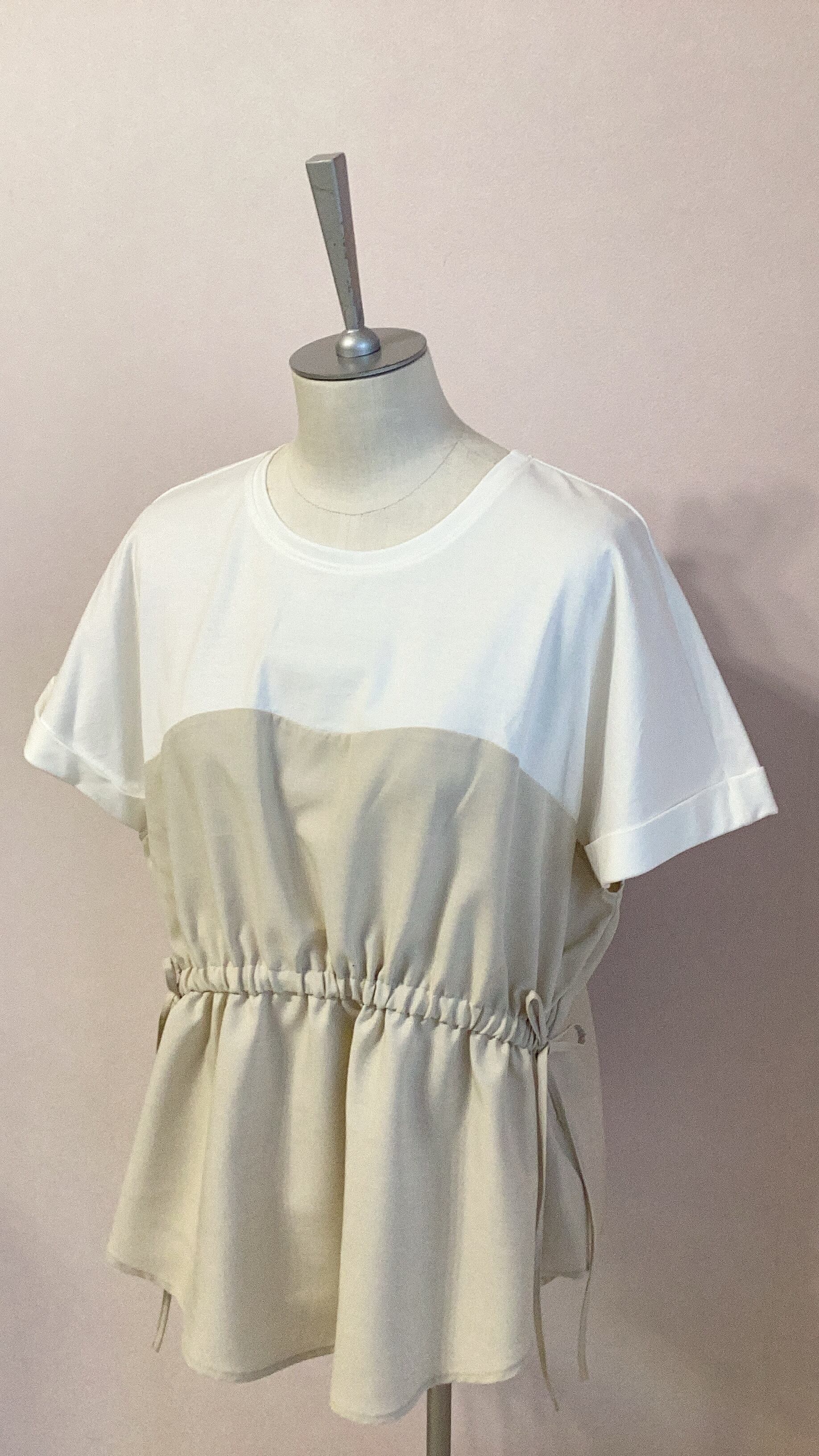 上身頃はすっきりとしたカットソー素材に、ウエストにギャザーをたっぷりと入れたシャンブレーエステル素材に切り替えることで、メリハリのあるシルエットを作り出しています。サイドのリボンで、シルエットの調整が可能。一枚でレイヤードコーデが完成する主役級トップスです。
