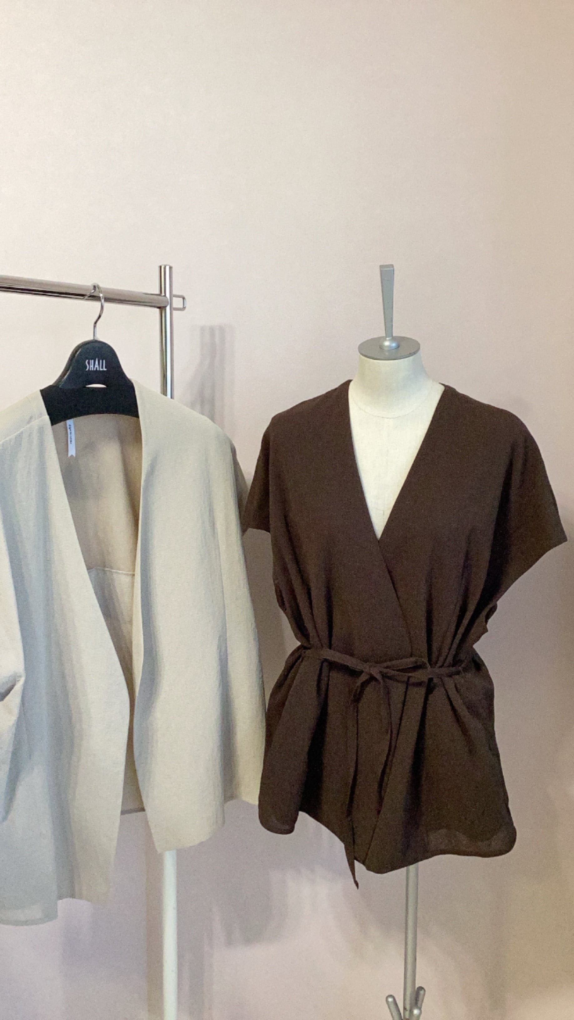 涼やかな素材感のノーカラージャケット。硬めのガーゼなのでカジュアルになりすぎず、きちんと感のある着こなしができます。