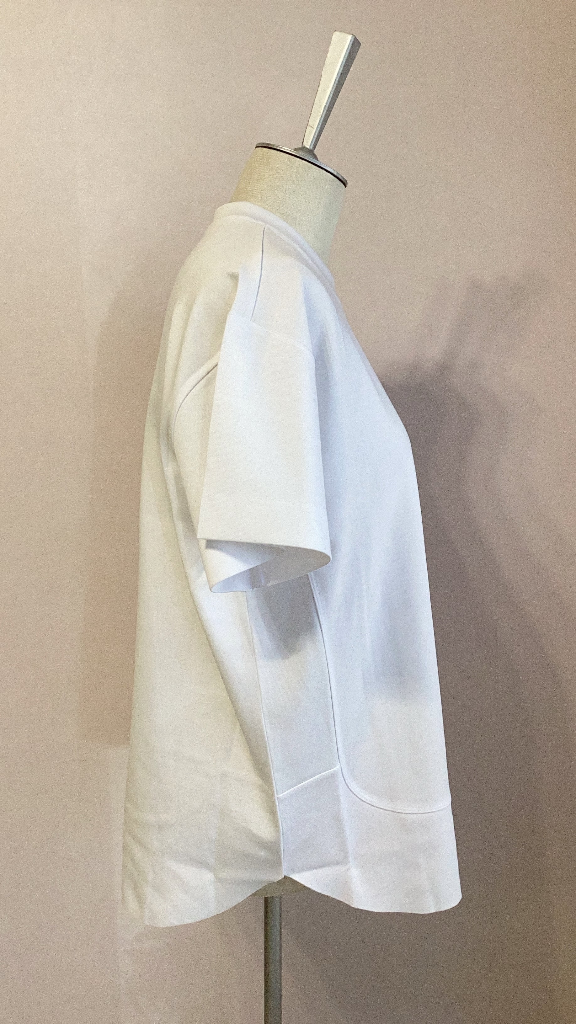薄手で滑らかな肌触りの半袖プルオーバーです。シンプルなシルエットに切りっぱなしの裾の切り替えデザインがアクセント。
