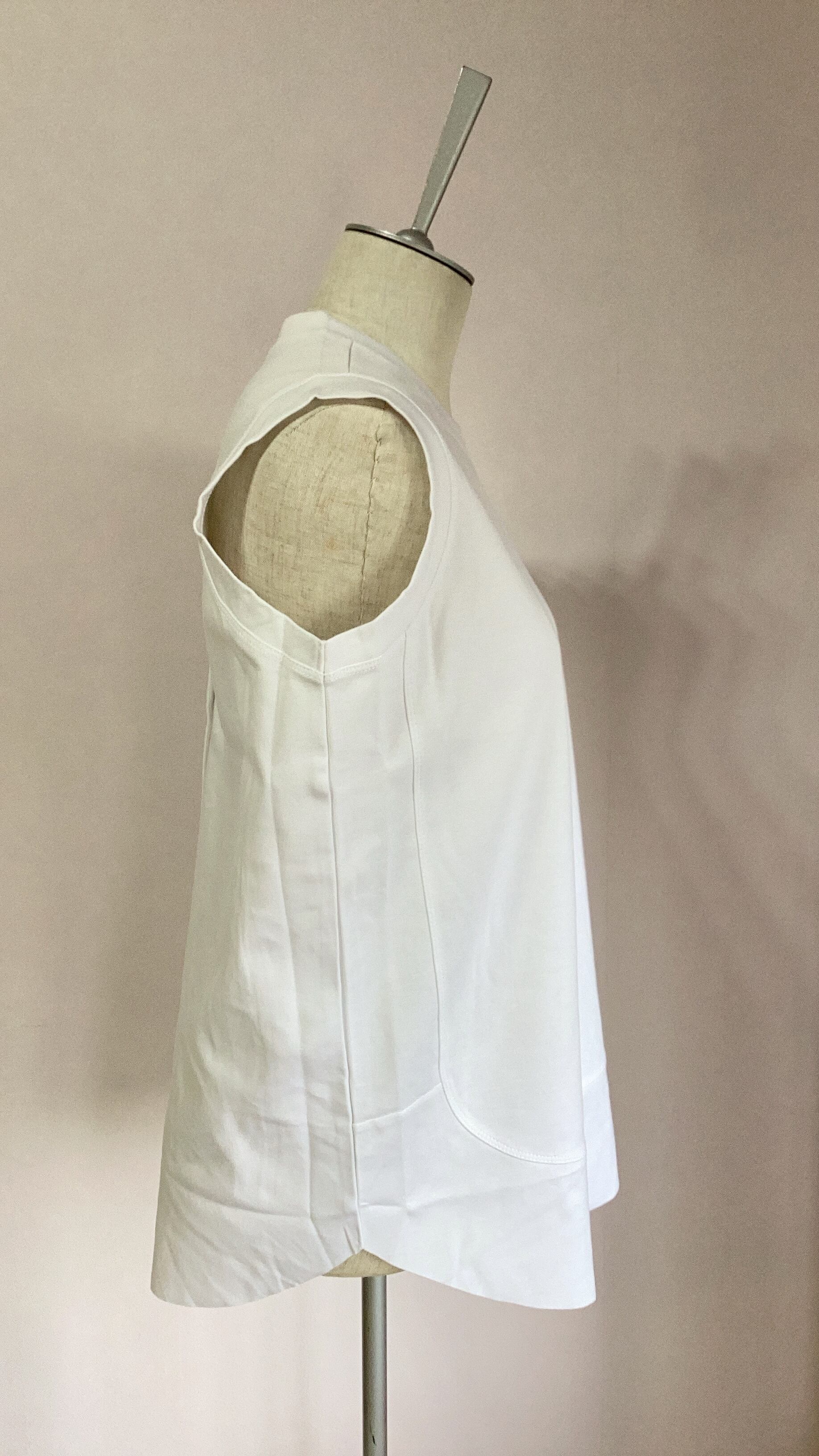 薄手で滑らかな肌触りのノースリーブプルオーバーです。肩幅が広めでアームホールが広すぎないので下着が見えにくく、首周りも安心の広さ。