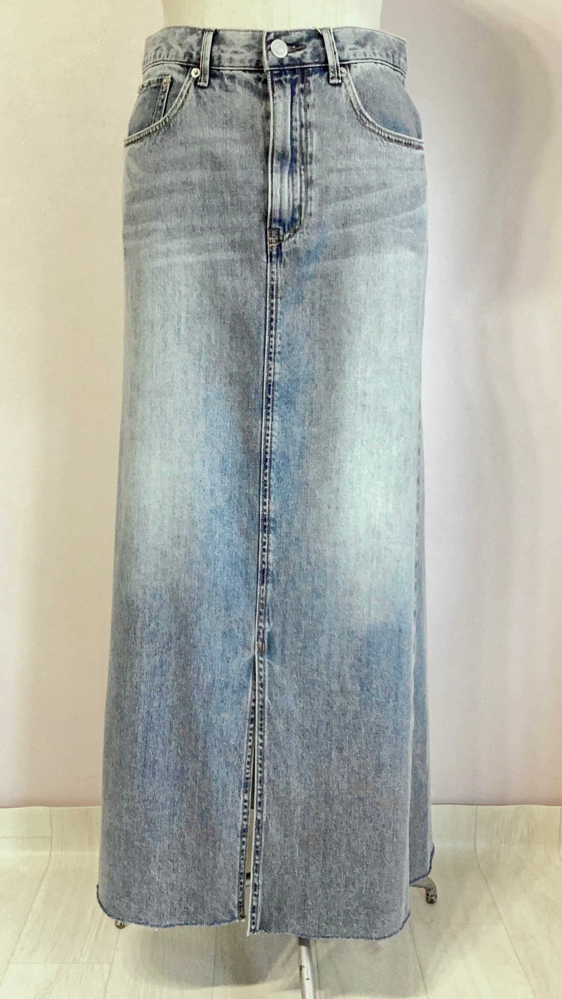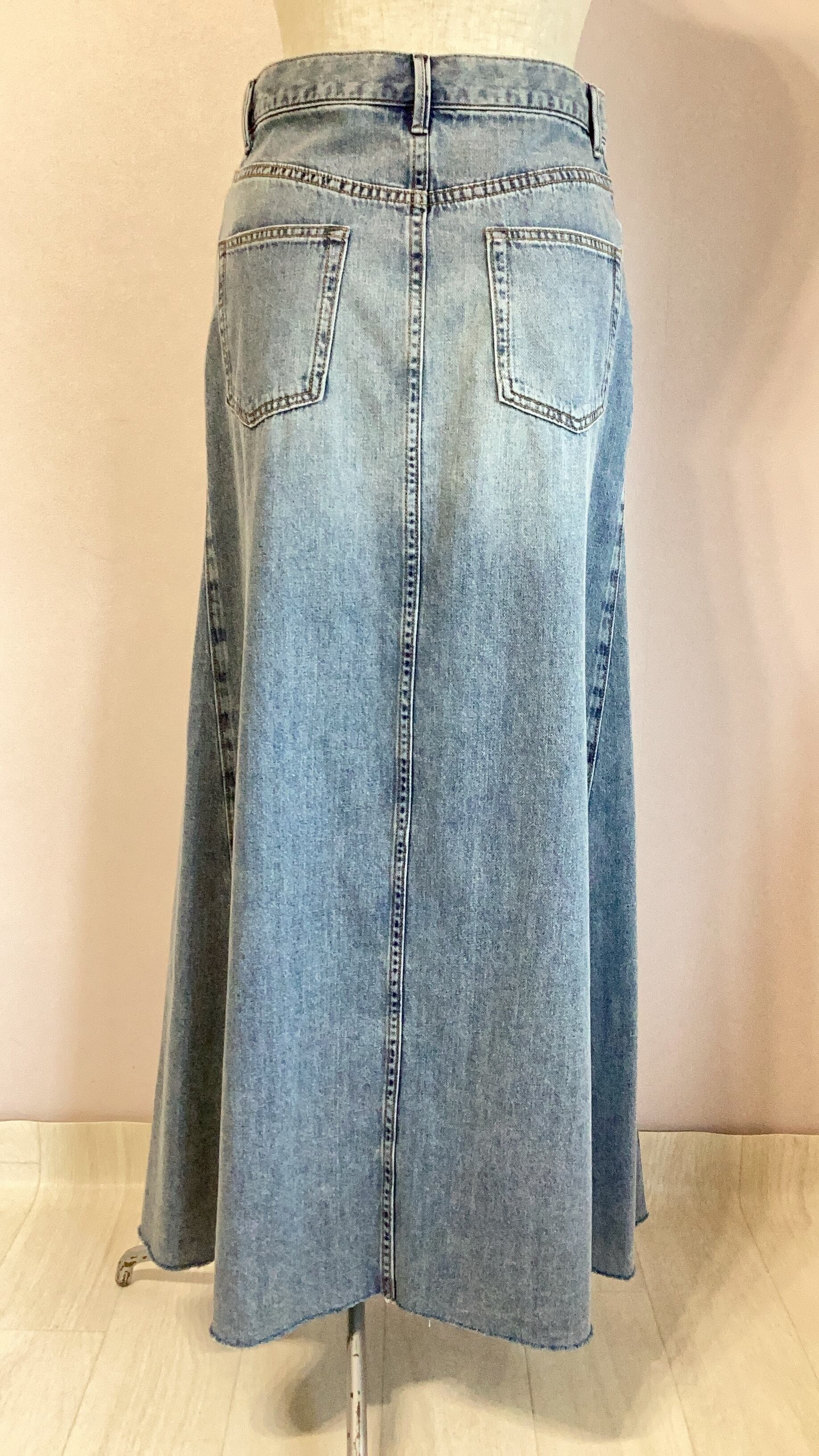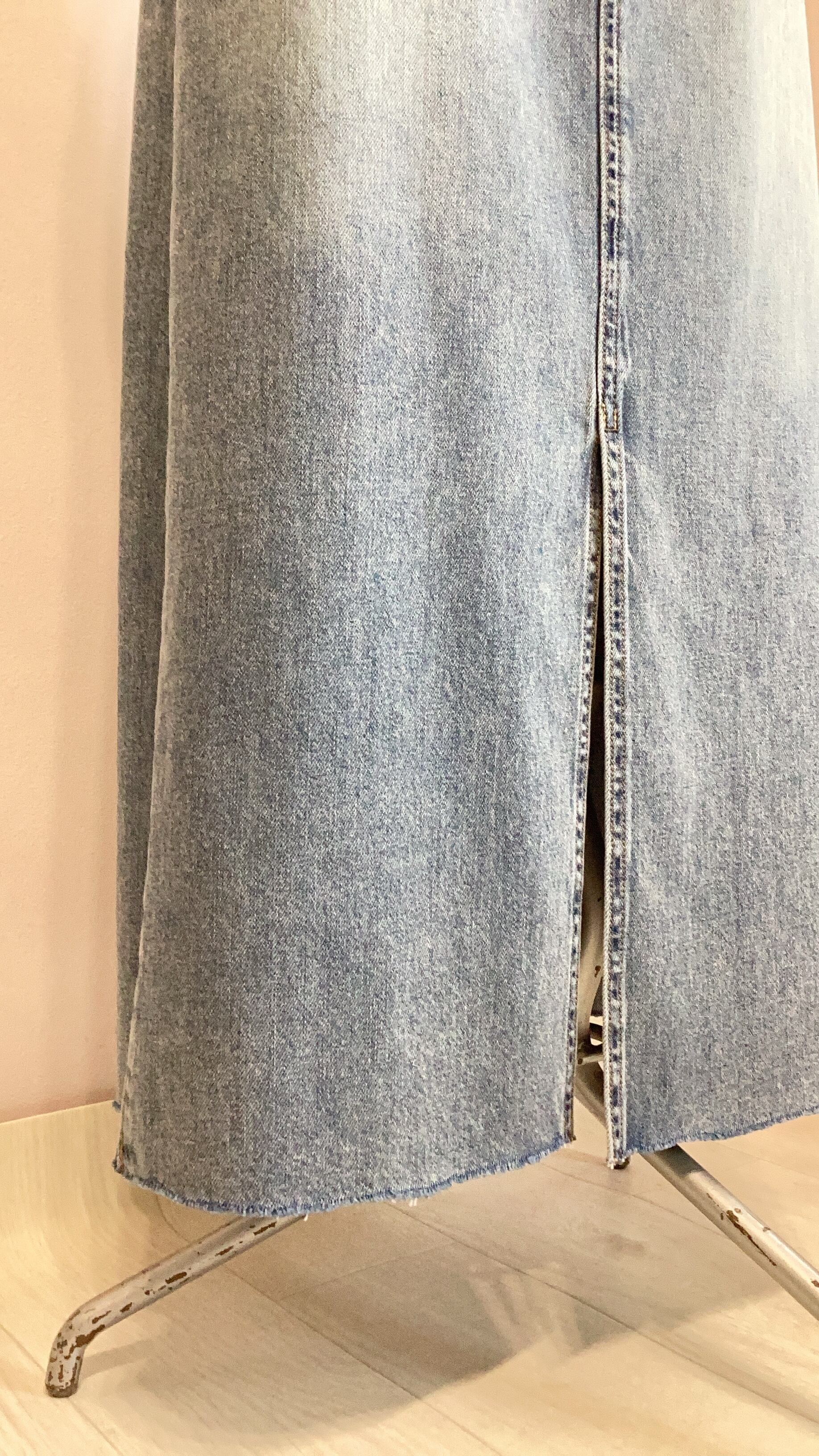 緩やかなフレアシルエットがcanineらしいデニムロングスカート。切りっぱなしの裾がカジュアルな印象。フロントスリットで足捌きも楽々です。