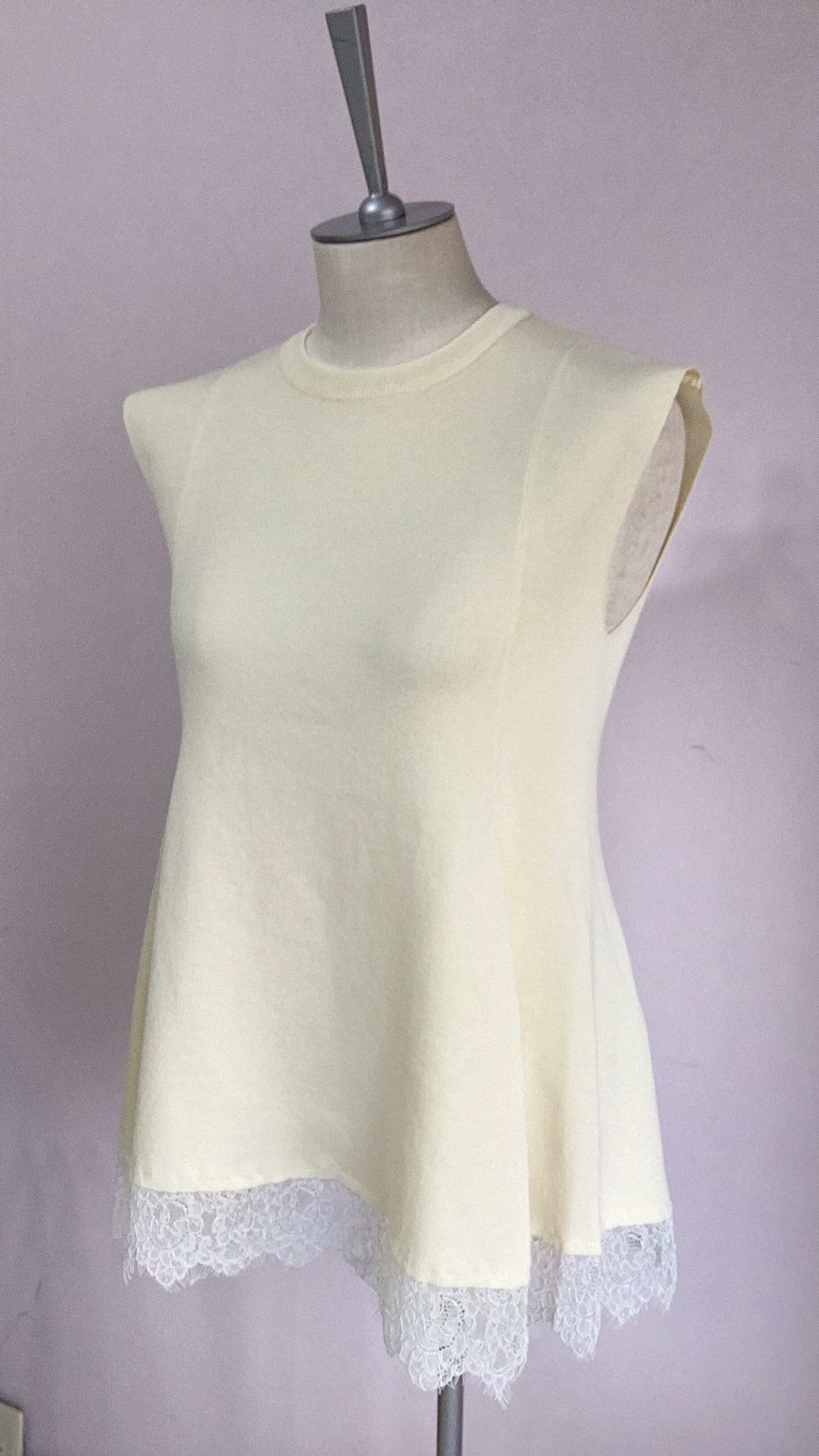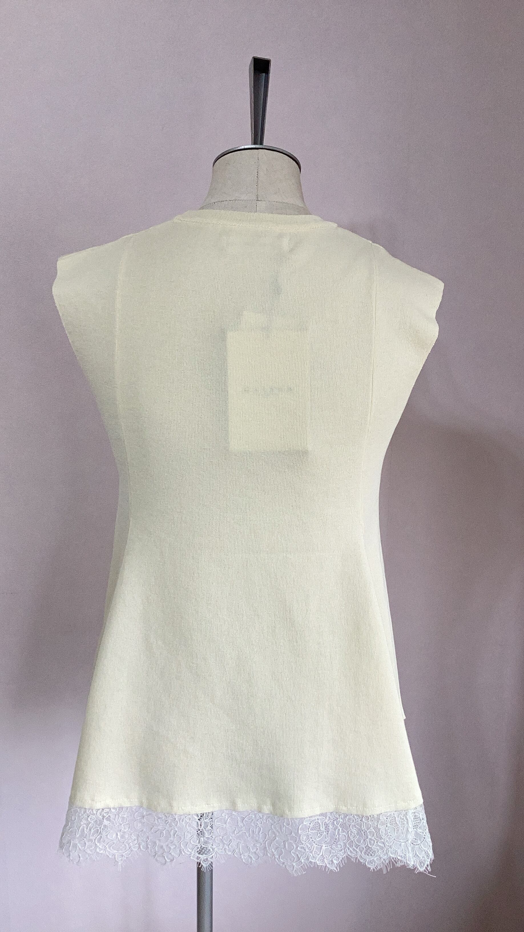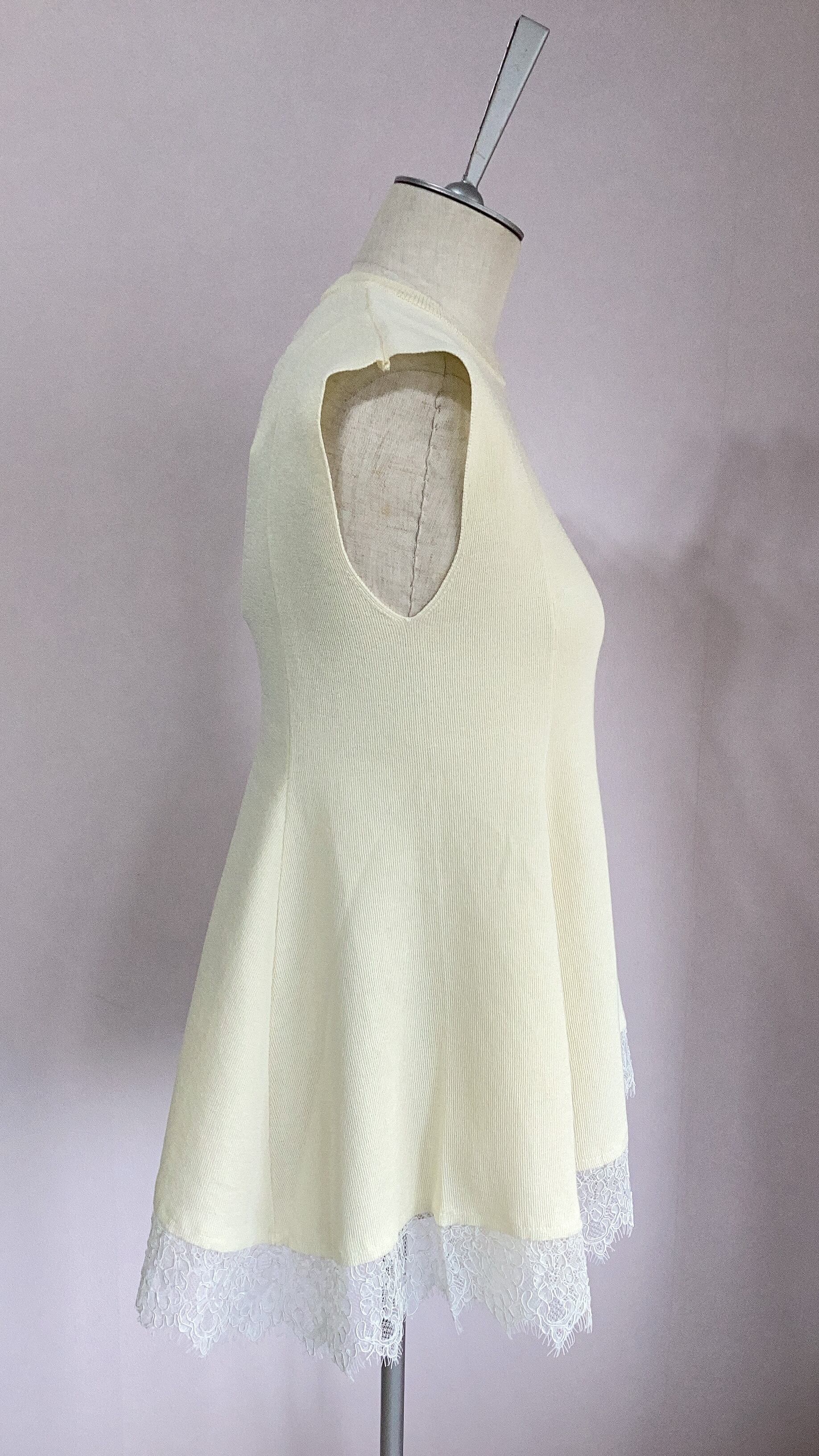 長め丈の上品なヘムレースでインナーとしても活躍しますが、ニットなので1枚でも様になります。
