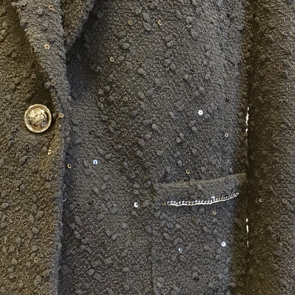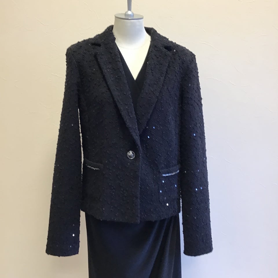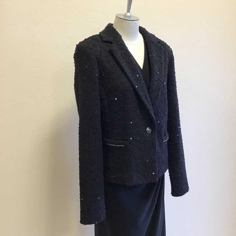 スパンコールとポケットのチェーンがアクセントになっているショートジャケット。高級感のあるブークレ生地にスパンコールが散りばめられ、華やかな印象です。