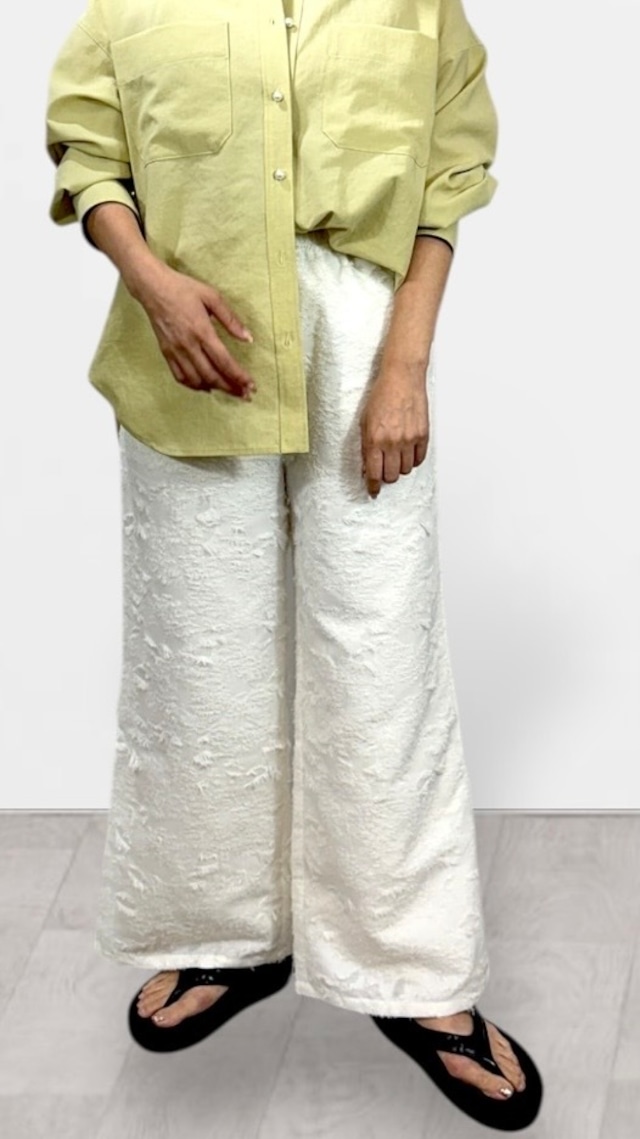 ストレッチの効いたパンツです。ウエストゴムで締め付けがなく、柔らかく体にフィットする生地感です。裾のスリット脚が綺麗見えします。